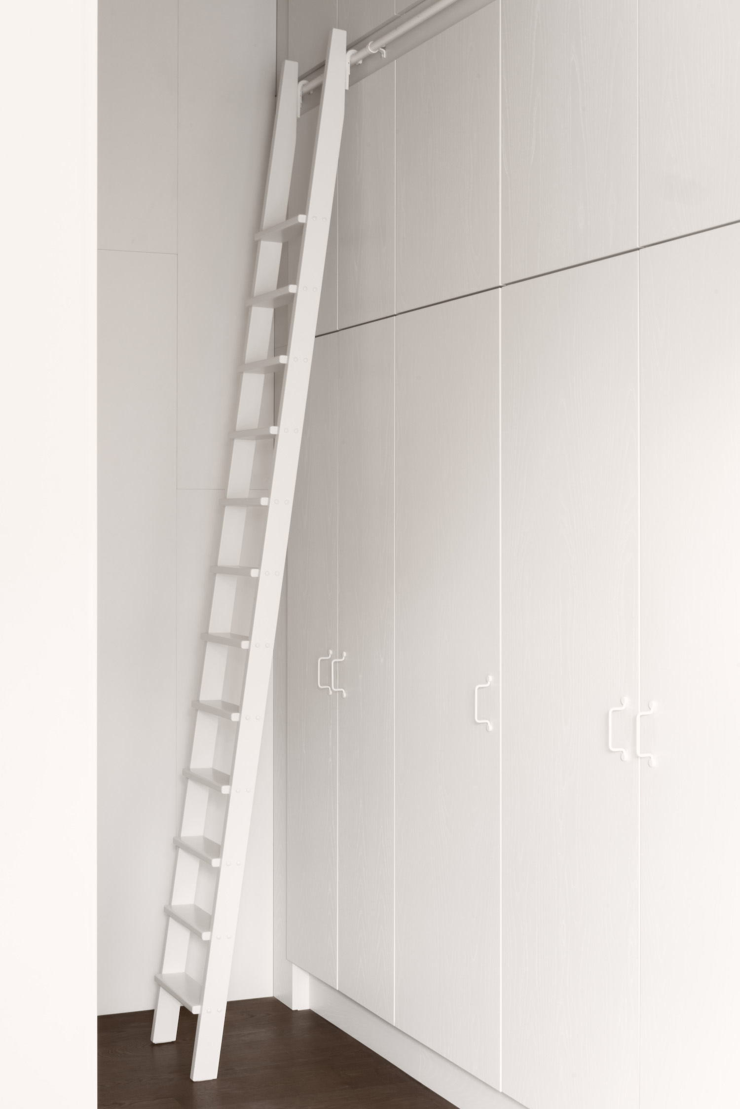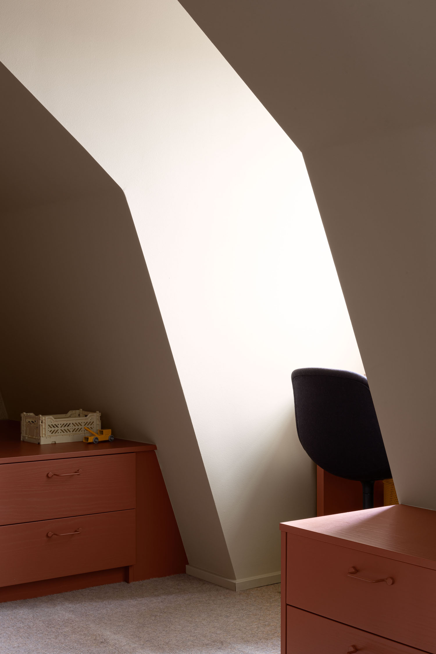 The family’s two children both needed their own rooms, so the designers built two new lofts in the apartment. The girls room and the hallway were redesigned, with new storage solutions that make use of the space all the way up to the ceiling. Rather than try to make the new layer blend in with the loft’s architecture, they wanted to be honest and gave the extra layer its own color, which gives added depth to the home.