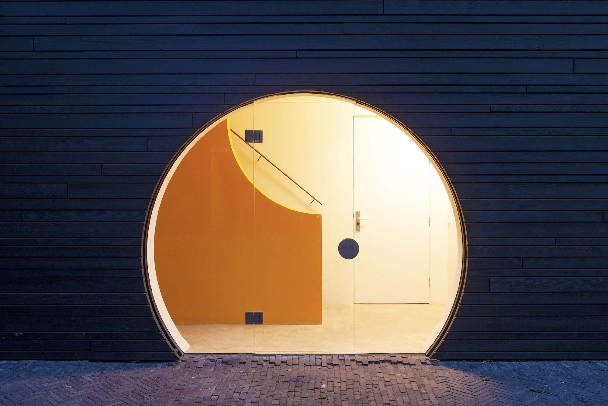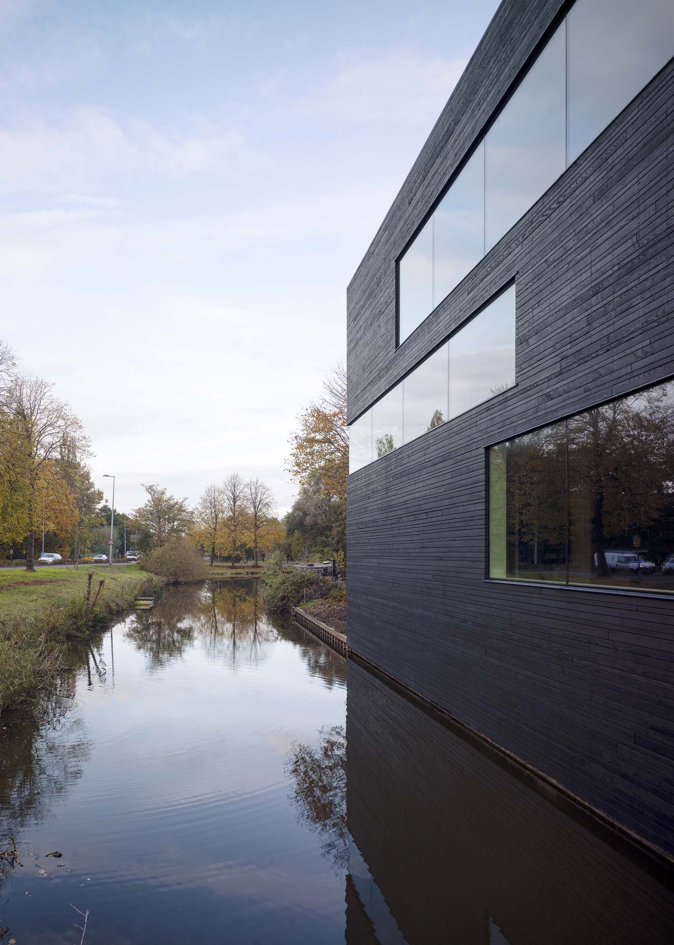 Terbregsehof 11 is the new headquarters office, workshop and showroom for interior design and build company 13Speciaal. At a corner in the canal, the building is located in a kind of ‘no man’s land’ beside a highway crossroad on the outskirts of Rotterdam. The building replaces a abandoned house that was bought by the client in 2016 and had been squatted for years. The building stands directly in the water on two sides, with its exterior forming the retaining walls of the canal. The design comprises a ground floor workshop, first floor office and a showroom to exhibit the company’s work that has expansive views on the third floor. Like a timber Stanley Kubrick monolith with openings punched in for the sun to shine through, the building overlooks the busy traffic intersection as well as the wooded park Kralingse Bos diagonally opposite.