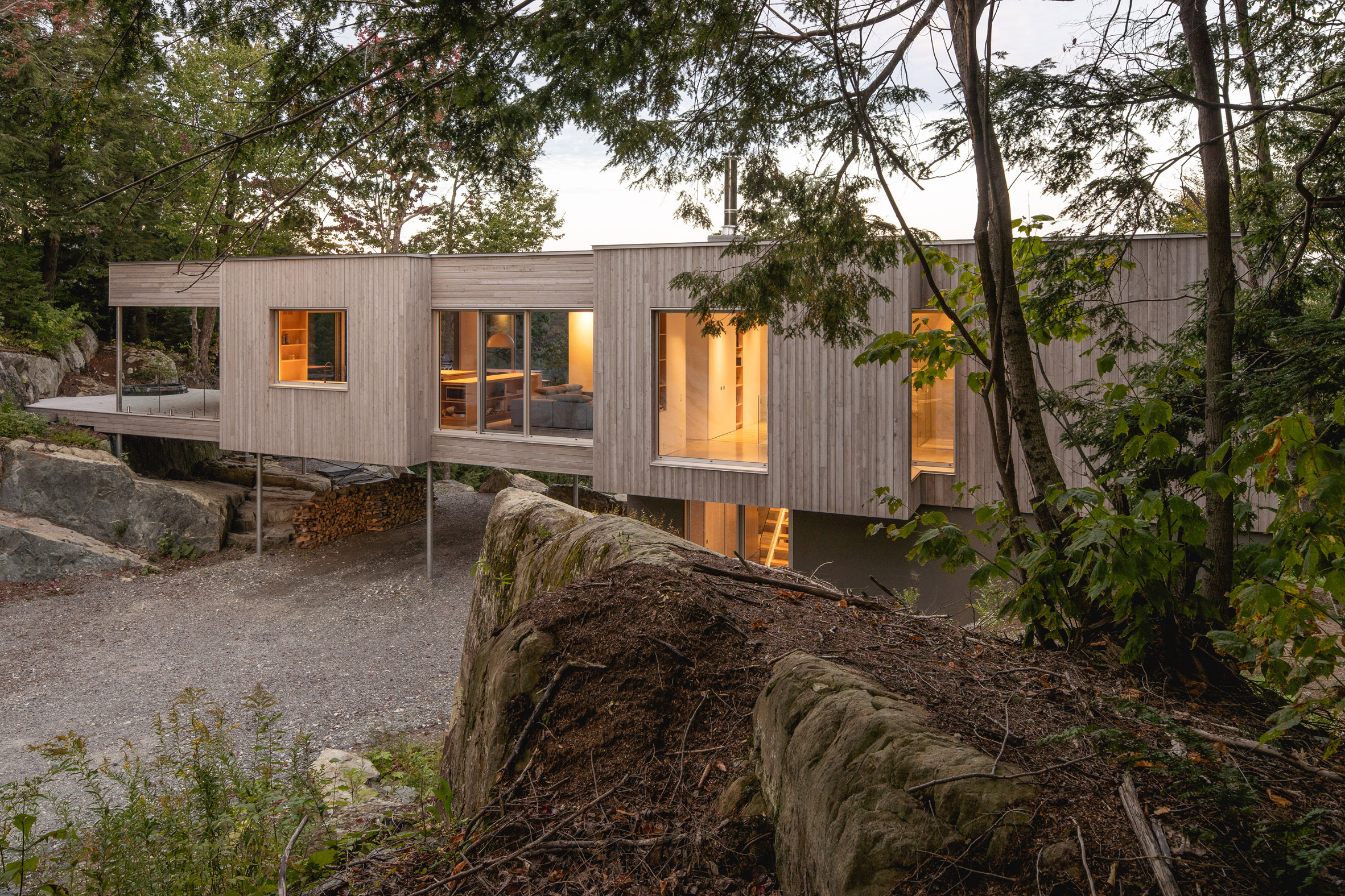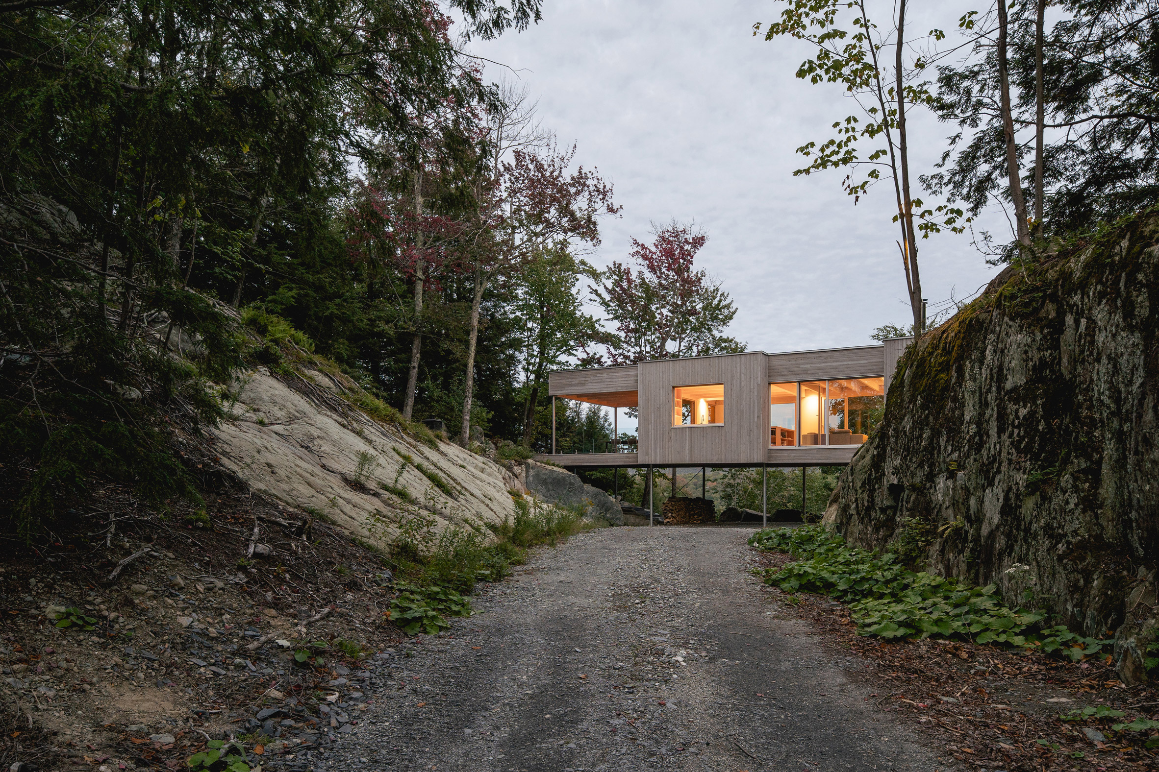 Canadian architect Natalie Dionne has completed a forest retreat in southeastern Quebec, which is raised up on stilts to meet the level of the rocky landscape.
