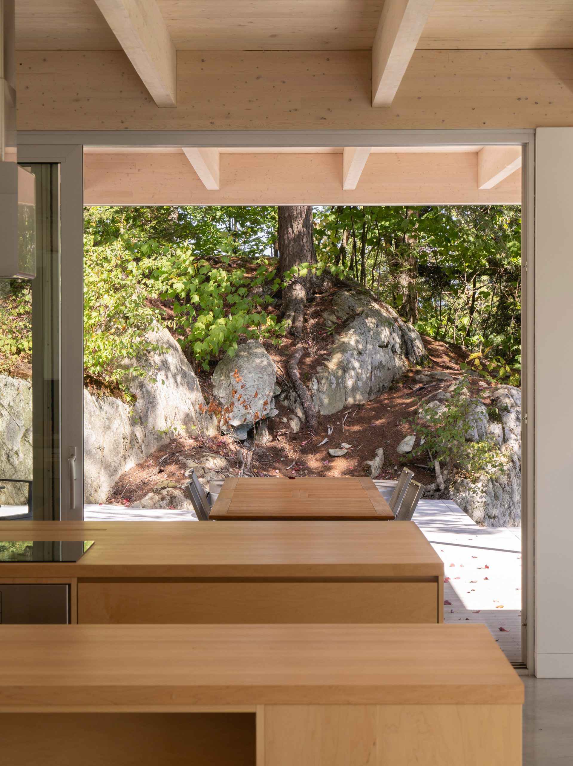 Both Dionne and the clients agreed that the house should meet the level of this rock, so they designed a house raised up from the ground surface on stilts.
