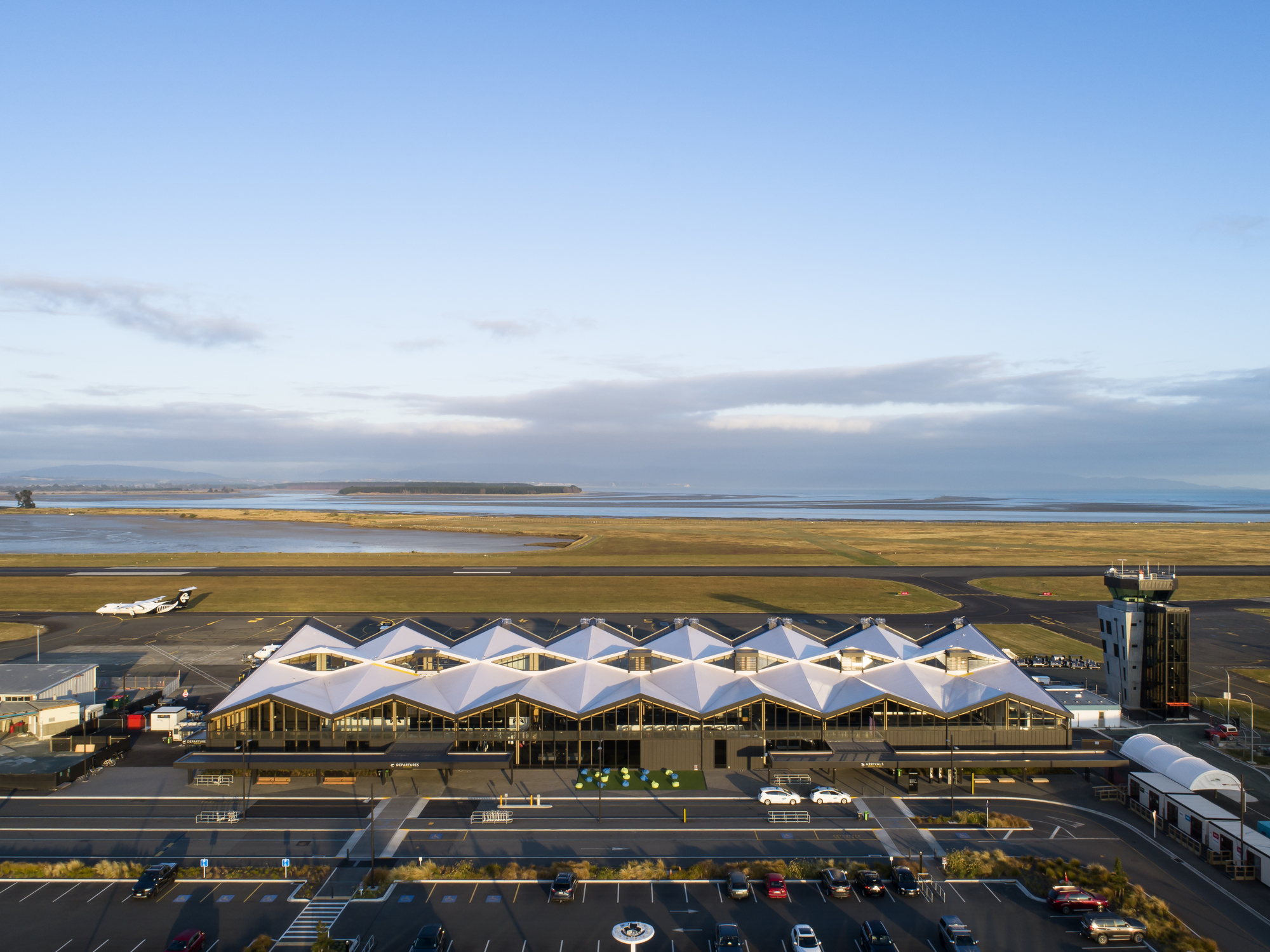 The Nelson Airport Terminal is a new large span timber building overlooking the runway, with a stunning backdrop of Tasman Bay and the Western Ranges in Nelson, New Zealand. The requirement for a new terminal building arose out of the reality that the existing 1975 building no longer met building code requirements or functioned efficiently with the ever-increasing passenger numbers travelling through Nelson.