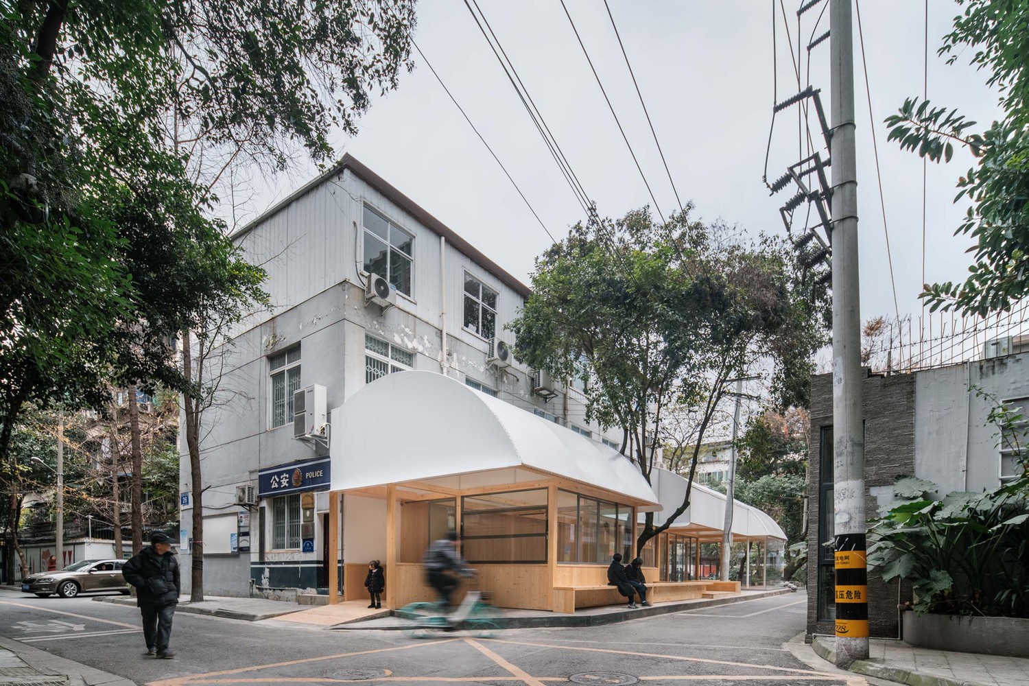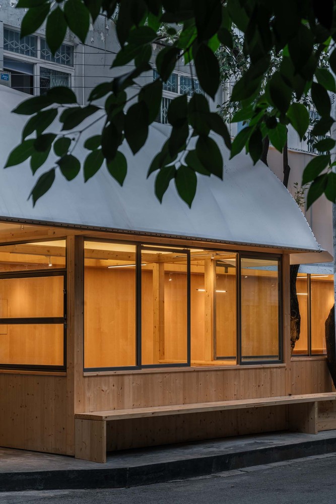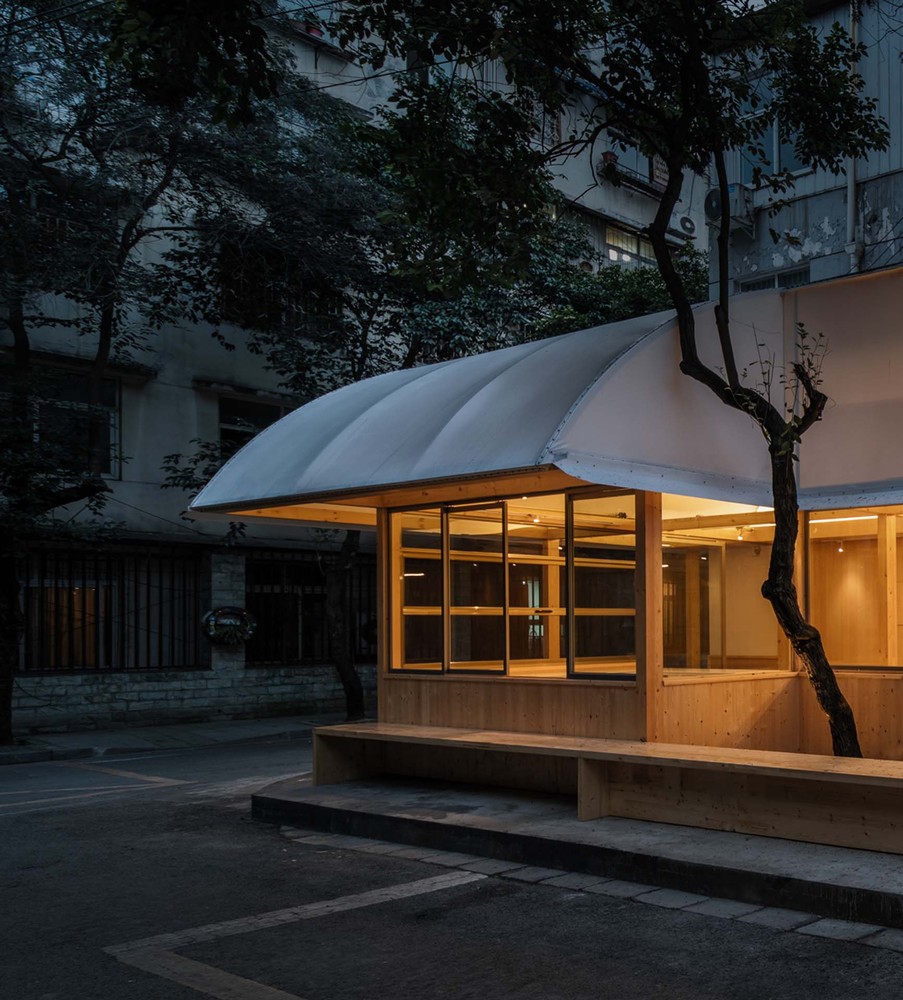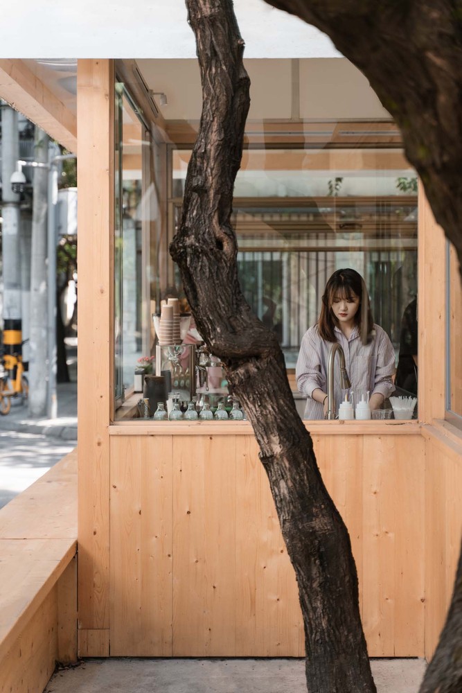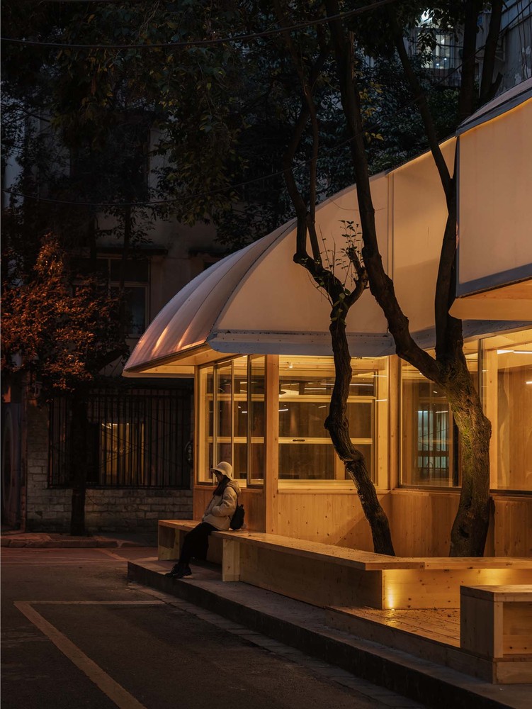 The space adopts a concave-convex misalignment plane layout, which makes the space almost free of visual dead corners and revolved in a lively moderate sense of security and distance. The facade treatment of interior and exterior, and the special outdoor seats with the reserved trees together create a fun atmosphere, which is convenient for strangers to communicate with each other.