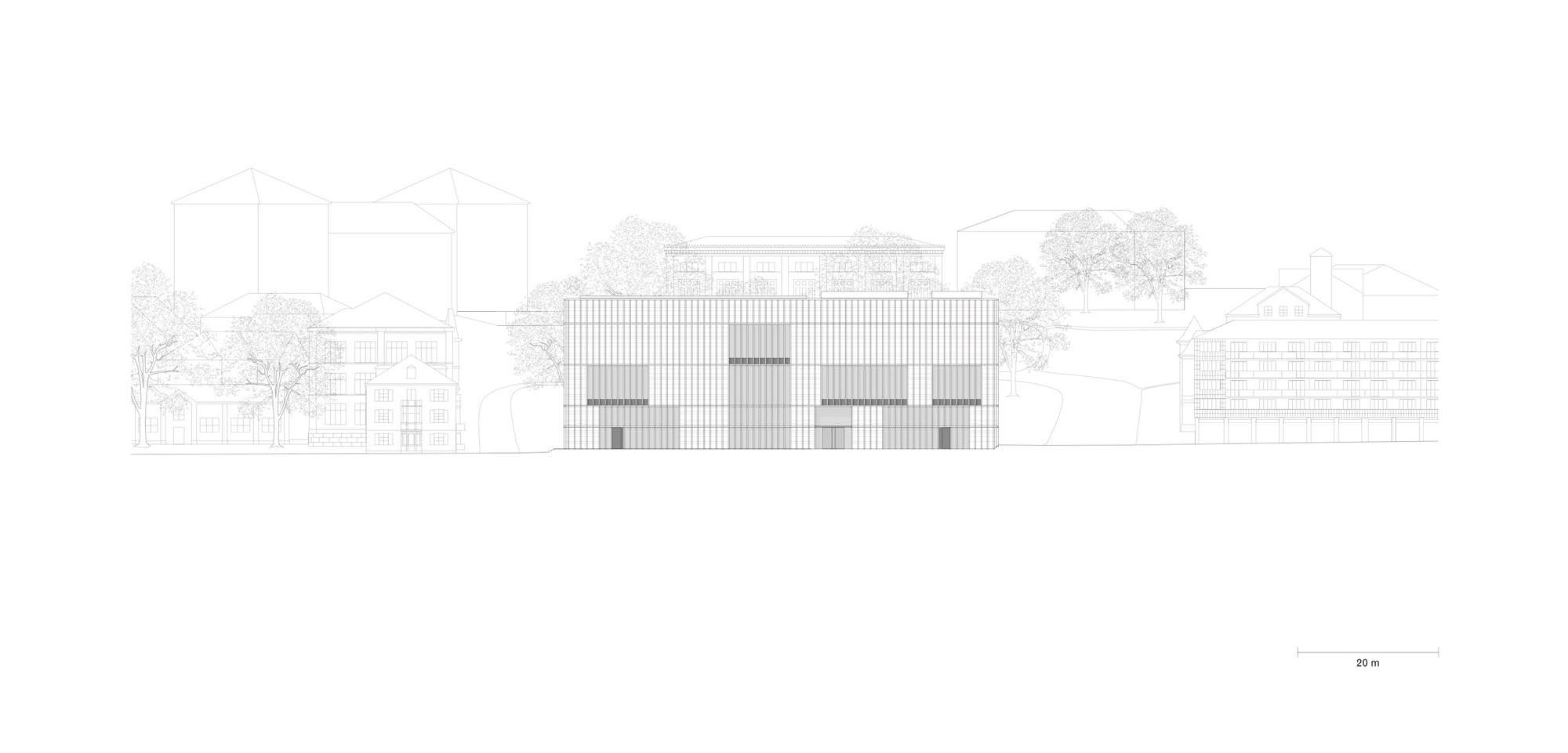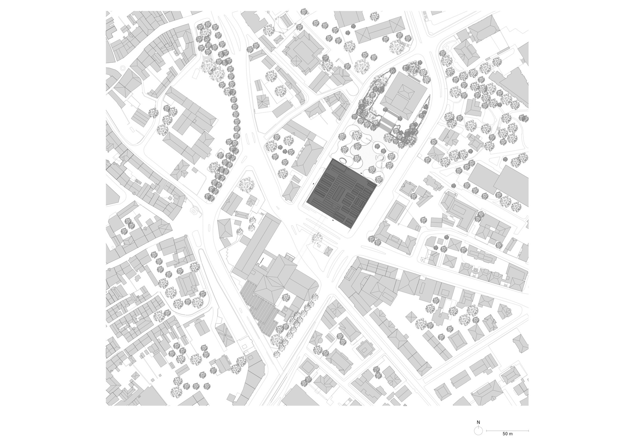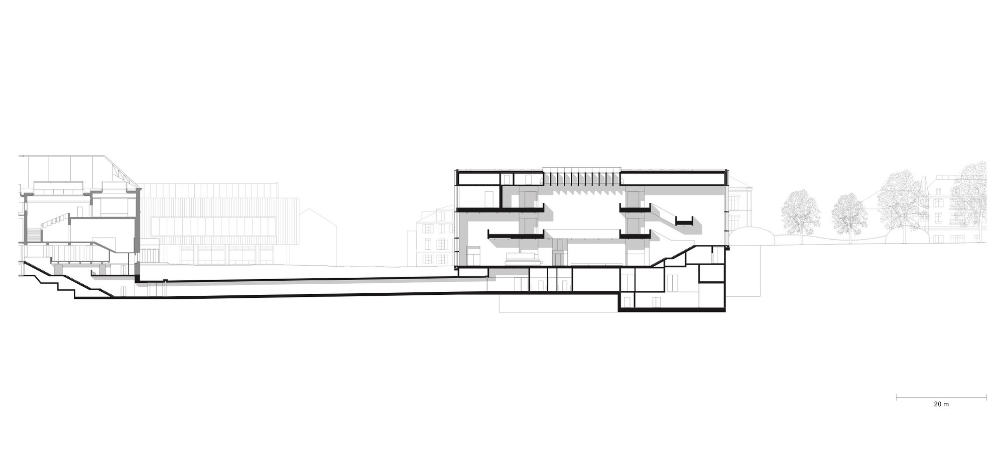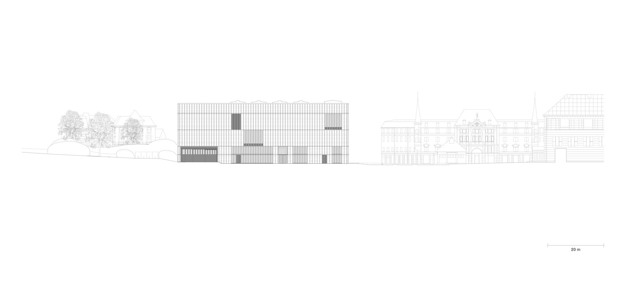 The urban concept for the extension envisaged the placement of a clear geometric volume on the northern edge of the square. The building form takes inspiration from the old cantonal school, built in 1842 to the north of the site, which defines the urban frame with its architectural clarity. The urban plan defines two new external spaces: the urban square to the south, framed on all four sides by buildings, and the new Garden of Art to the north as an open and permeable natural environment. An expansive entrance hall, spanning the full length of the building, creates a link between these two new urban spaces. Due to its low-threshold accessibility, it likewise acts as a public link between the institution and the city. A visitor passageway running underneath the square connects the new building with the existing Kunsthaus, creating one institutional entity.