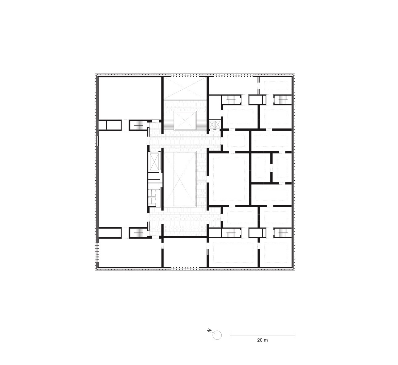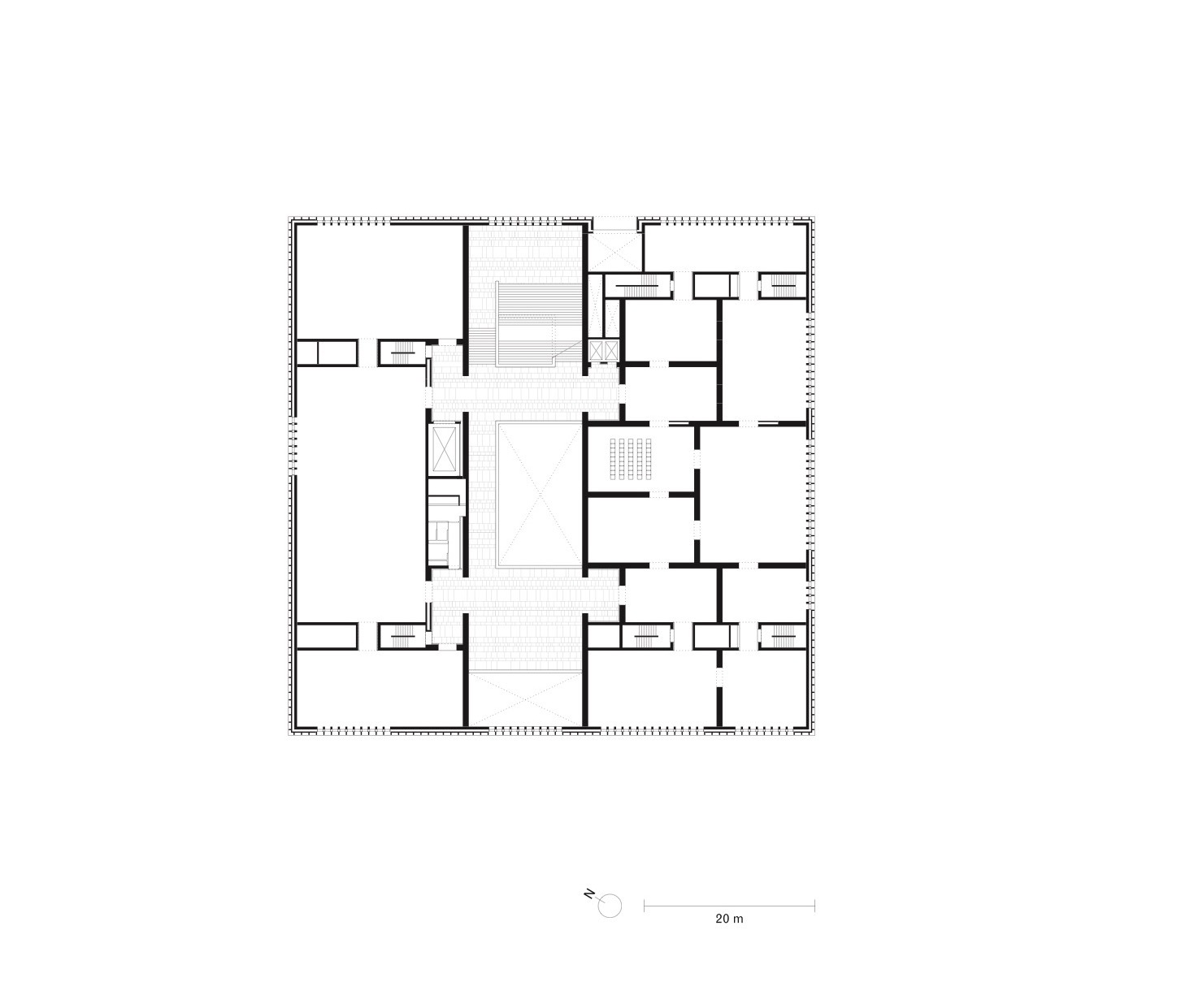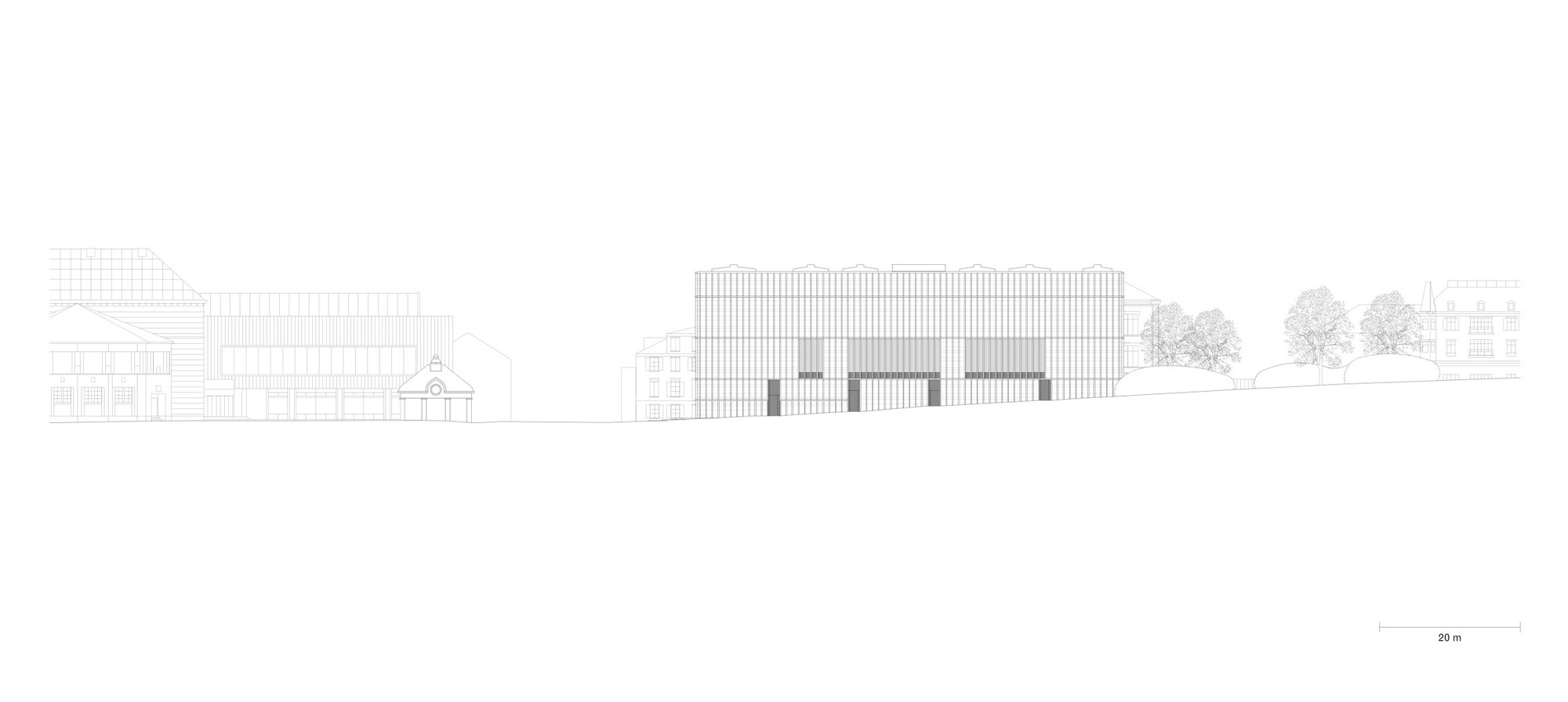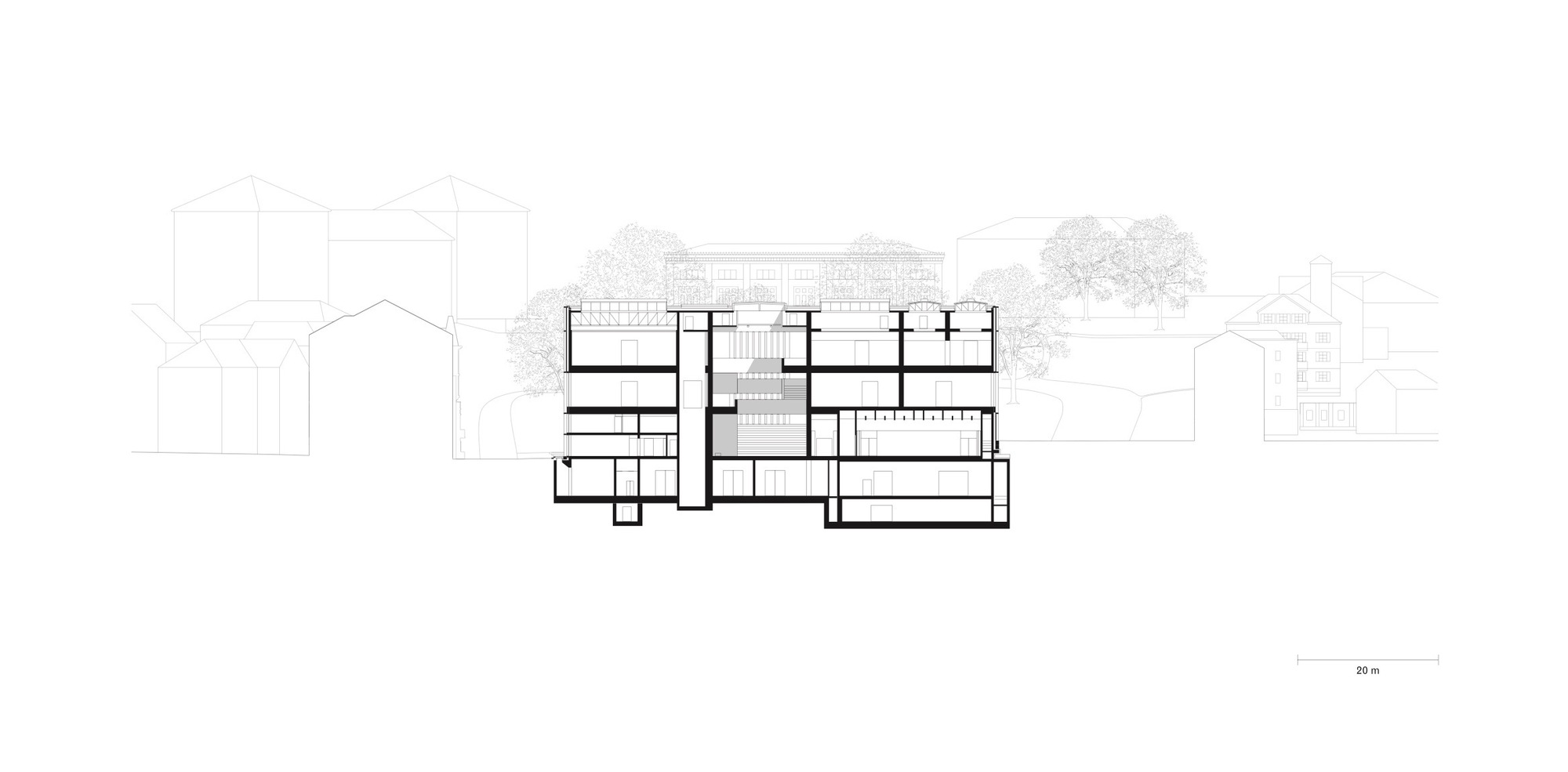 The urban concept for the extension envisaged the placement of a clear geometric volume on the northern edge of the square. The building form takes inspiration from the old cantonal school, built in 1842 to the north of the site, which defines the urban frame with its architectural clarity. The urban plan defines two new external spaces: the urban square to the south, framed on all four sides by buildings, and the new Garden of Art to the north as an open and permeable natural environment. An expansive entrance hall, spanning the full length of the building, creates a link between these two new urban spaces. Due to its low-threshold accessibility, it likewise acts as a public link between the institution and the city. A visitor passageway running underneath the square connects the new building with the existing Kunsthaus, creating one institutional entity.