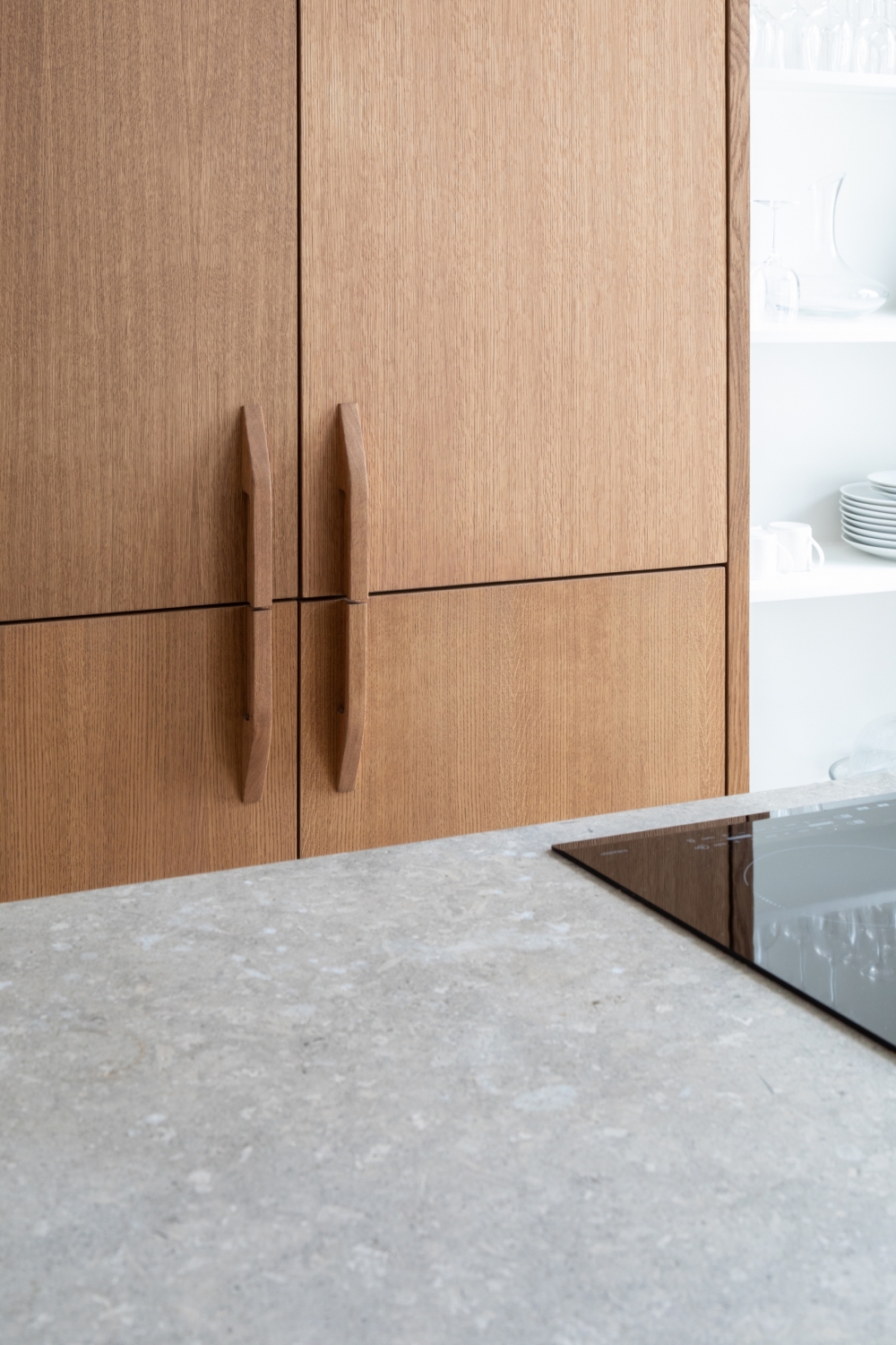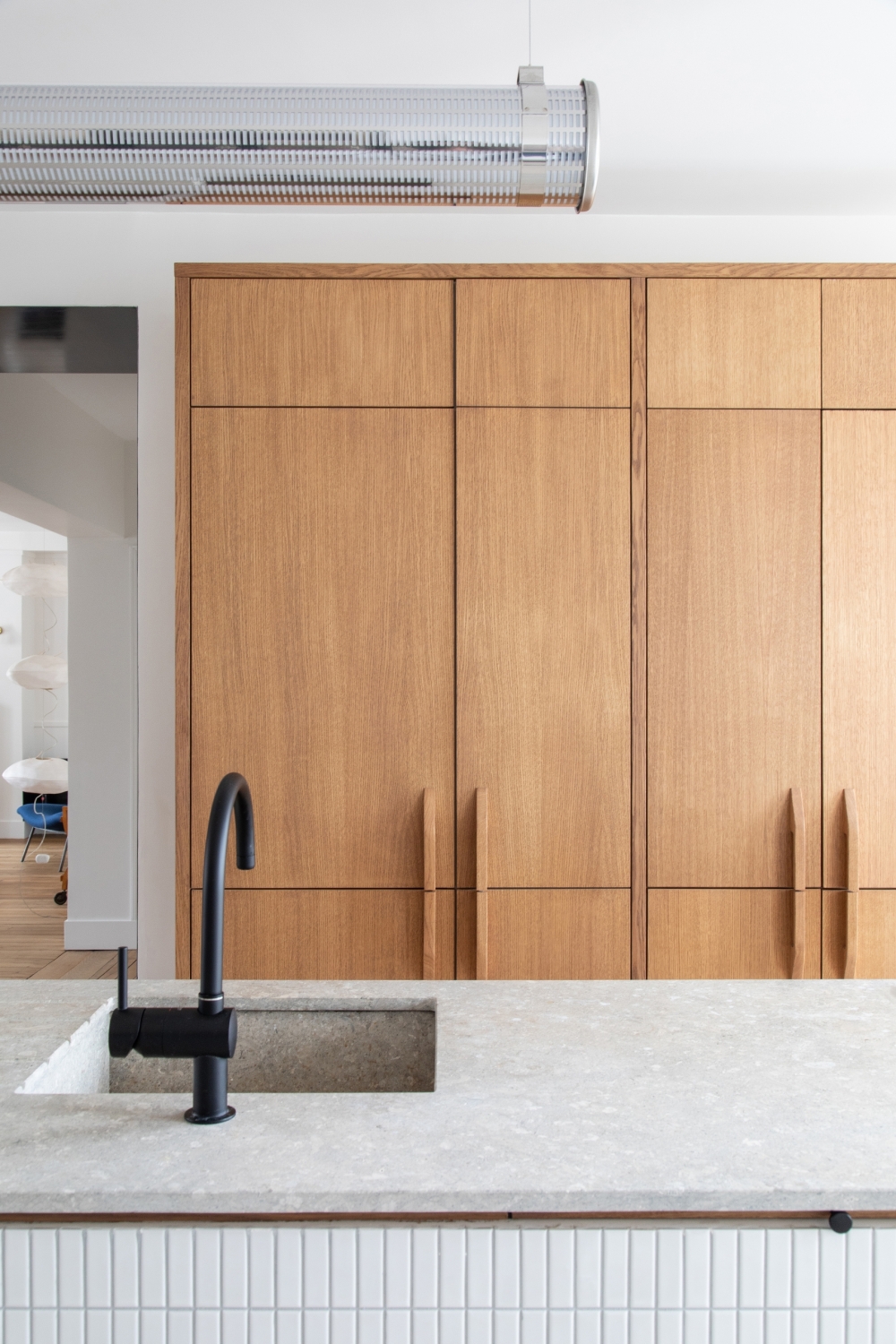 Batignolles is a minimal apartment located in Paris, France, designed by Atelier Leymarie Gourdon. The kitchen and living area serve as the nucleus of the apartment with the bedrooms being distributed toward the edge of the home. A Sammode tube light hangs above the kitchen island, further accentuating the round and openness of the space. The main area is comprised mainly of white and wood textures, while the rest of the space features accents in green, blue and brass.