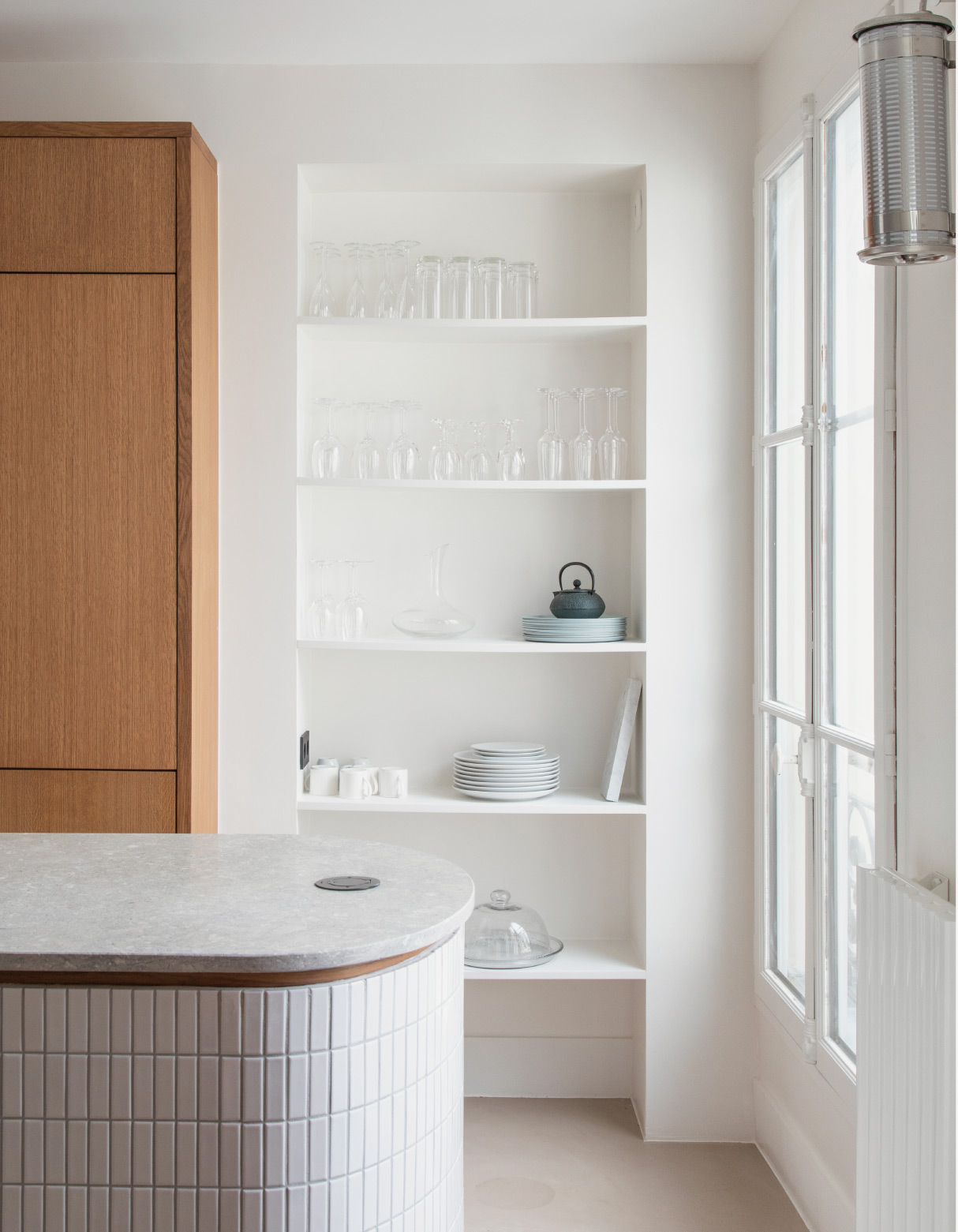 Batignolles는 파리에 위치한 미니멀 아파트로 지역건축가 Atelier Leymarie Gourdon가 설계했습니다. 주방과 거실 중심으로 이루어진 내부 공간은 침실을 단부에 설치하며 순환동선을 생성합니다. 이를 통해 내부는 연속된 공간감과 기능적인 동선을 확보하게 됩니다.
