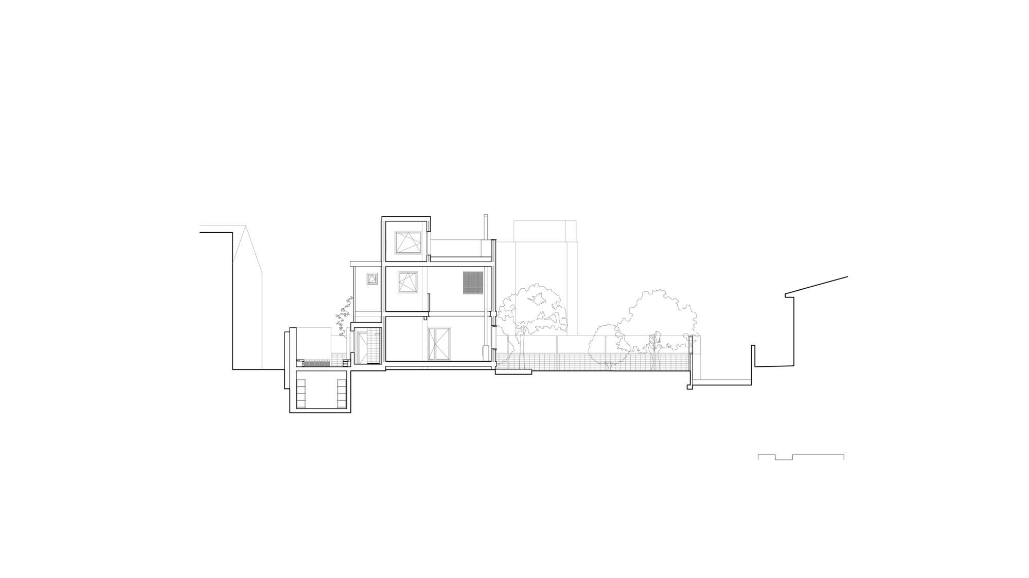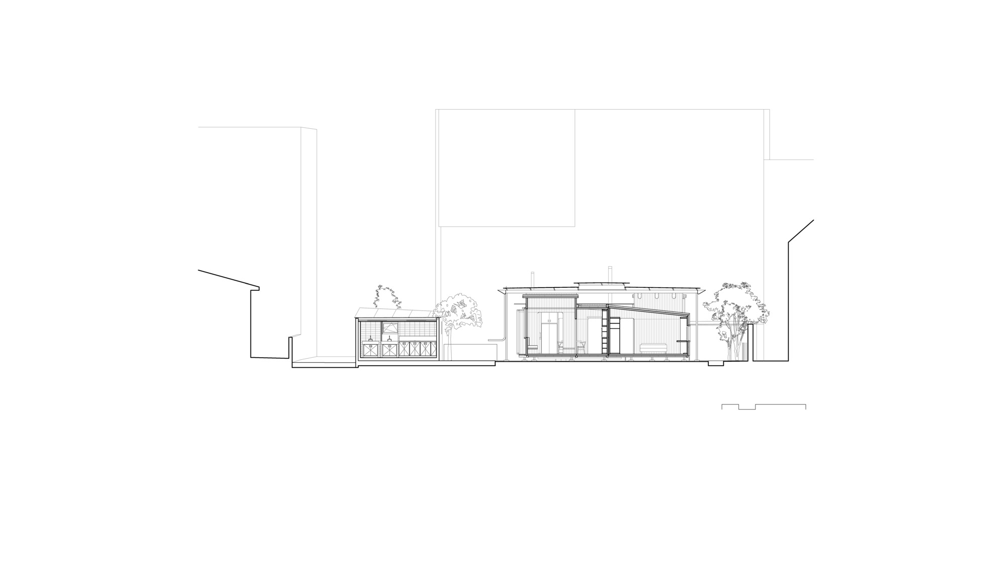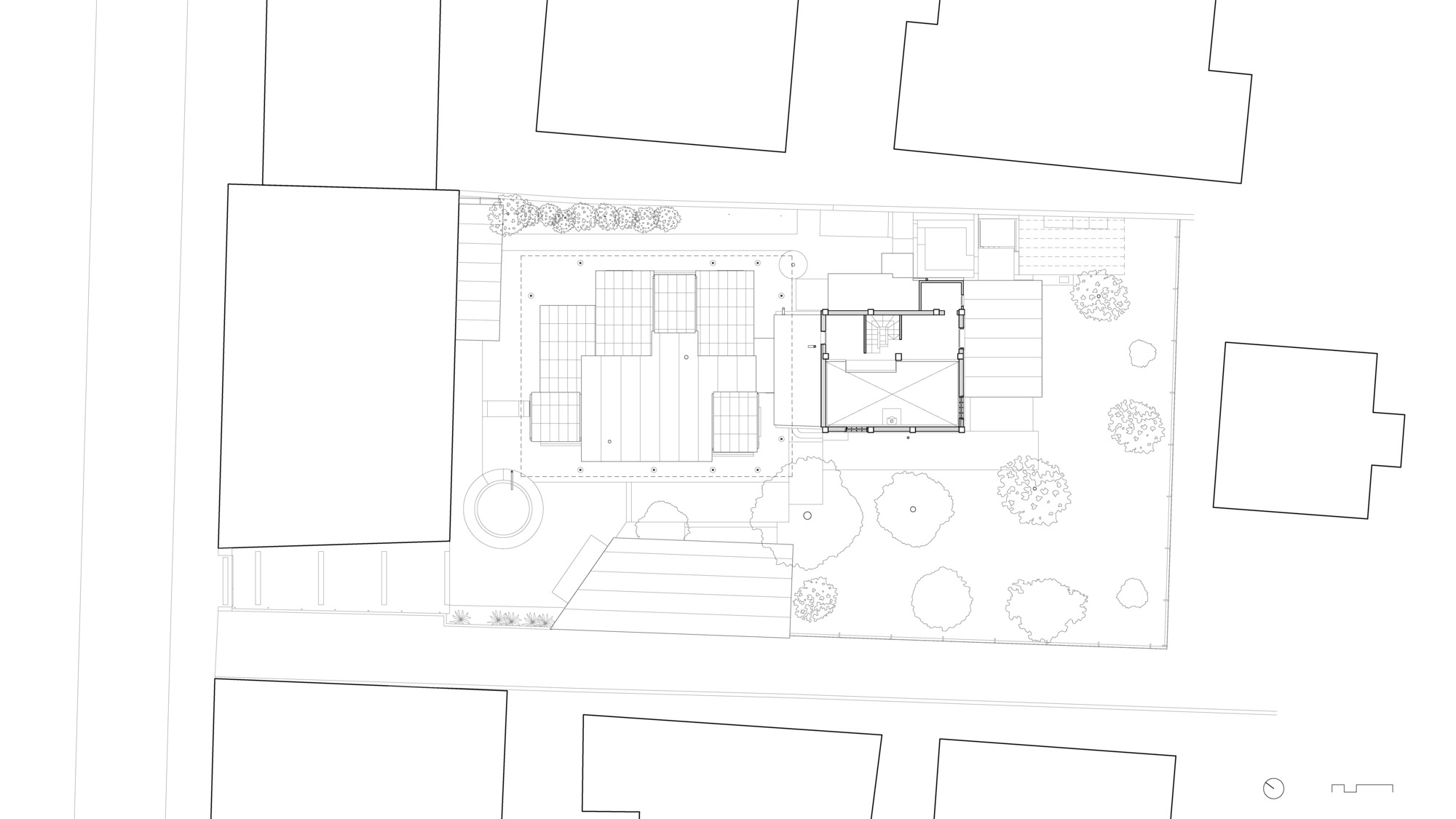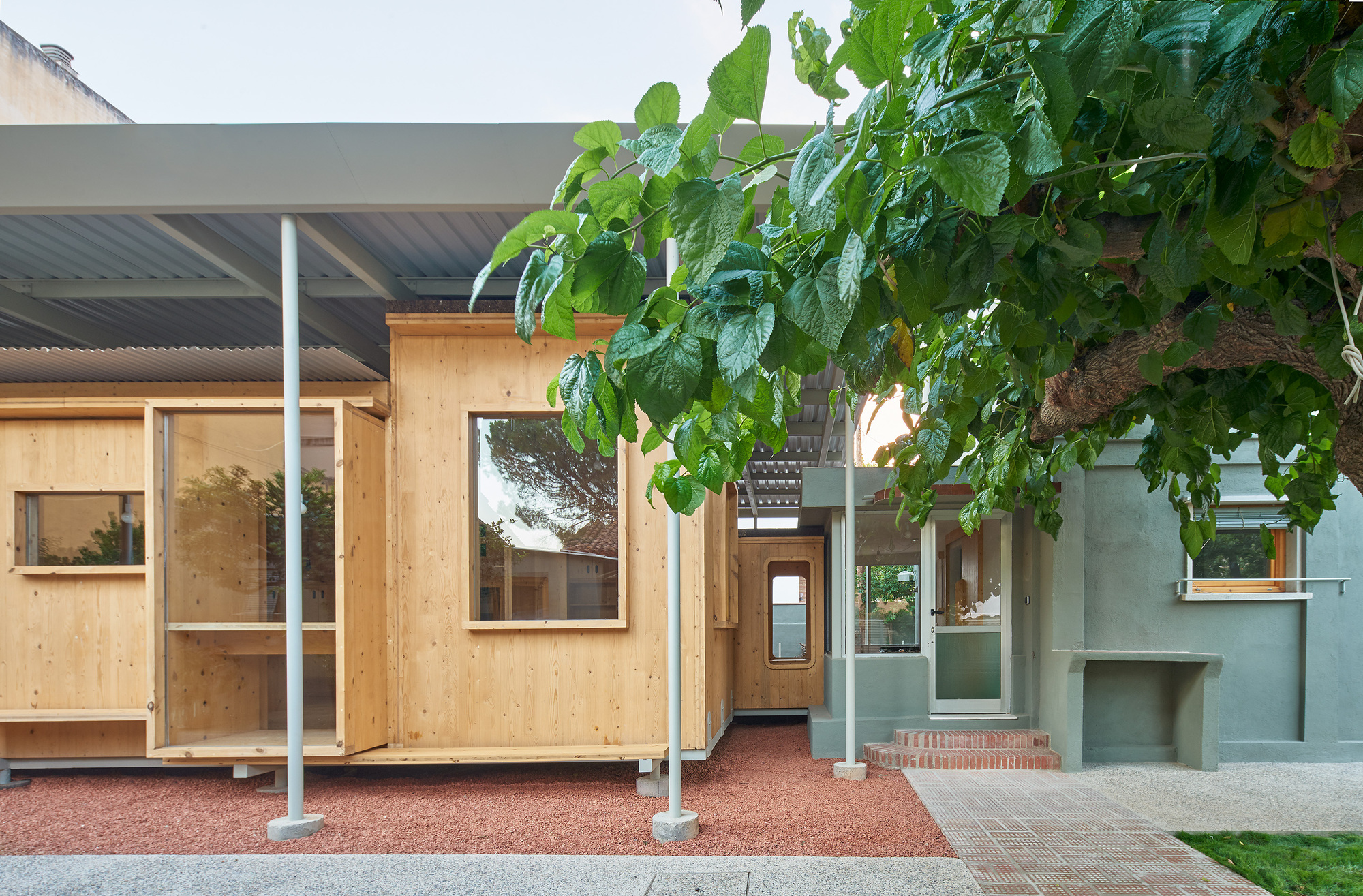 So neither we kept the existing mas as is, nor we totally demolished it. Instead, we placed more inhabitable air in the worst area of the plot, which was often shaded by the main house. The extension is family to the existing porches. In order to minimise the impact of this new structure, we kept its weight light as a porch, using CLT panels and thin steel tubes. The presence of quite tall apartment blocks on the northern and north-western side protects the site from the strong Mestral winds and shades it during the hot summer afternoons. Surrounded by this slight geological ring, a microclimate unfolds.