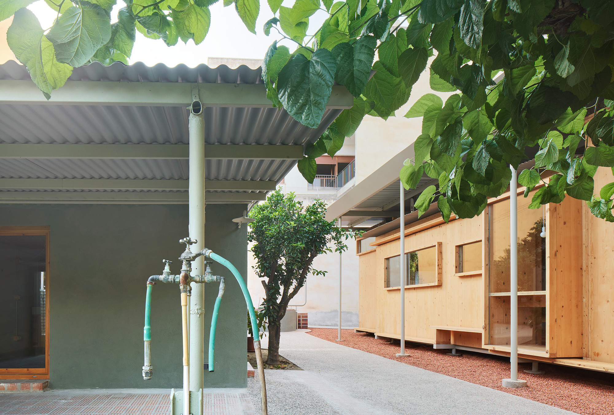 A 1000 m2 plot at a five-minute walk from the center of Reus. In the middle of the site, a self built country house. A hidden misfit gem. The late grandfather bought this mas many years ago. He spent the second part of his life taking care of it. Using his skills as a watchmaker, he patiently assembled additions, welding, screwing, and growing all kinds of rooms, huts, shacks, porches, fig trees, palm trees, plants, and shades: An outdoors abode, a second house around the former one-floor self-built construction. The house was in a perpetual state of construction, a never-ending laborious enjoyment for its dwellers. And then in 2016 the father died, and the place was empty. A year after the father’s passing, the son, his wife, and daughter -the JECs- decided to move back in. Their only initial demand was that they wanted to live on the ground floor. The JECs first question was whether it was better to keep the existing mas, or to demolish it and build a new structure instead?