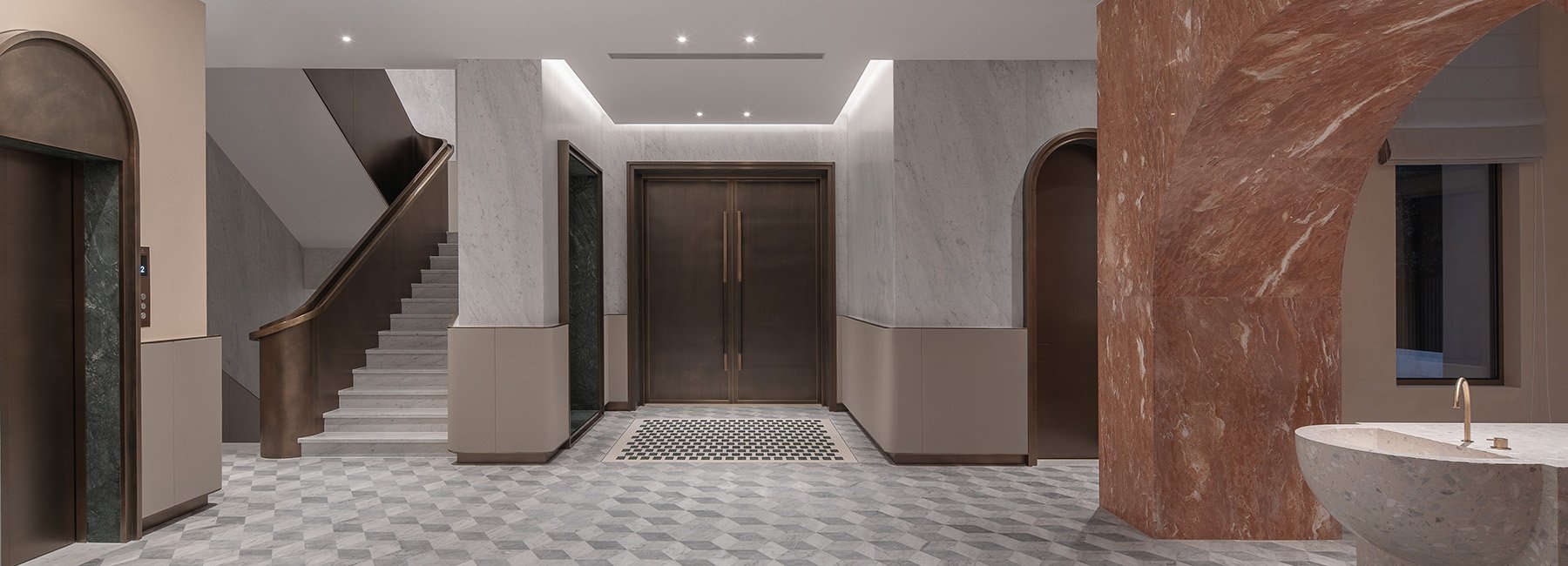 이탈리아 클래식 감성의 인테리어 디자인 제안. 마블 대리석으로 마감된 실내의 고급스러움은 장중한 장면들을 연속하여 생성한다.