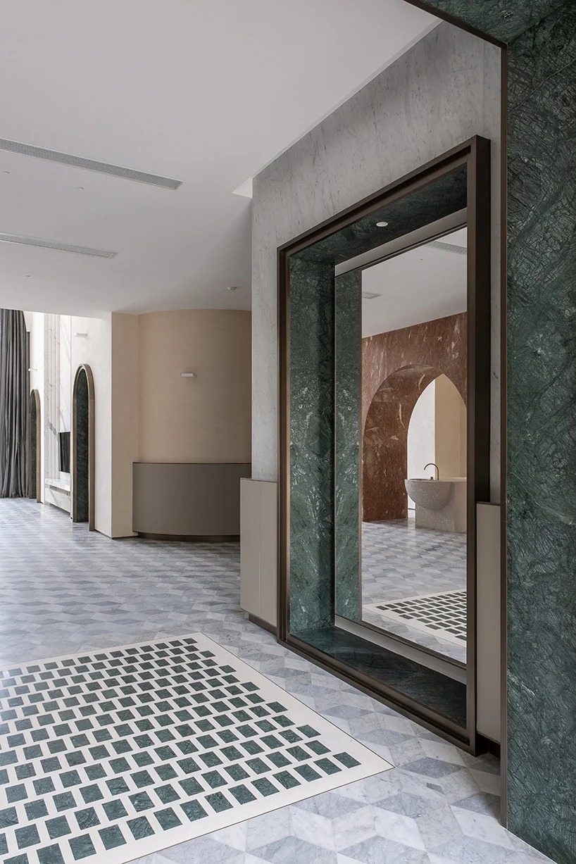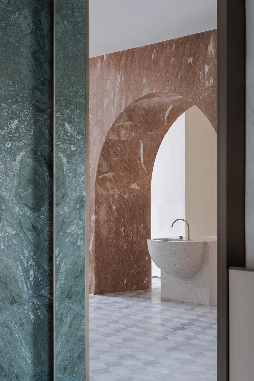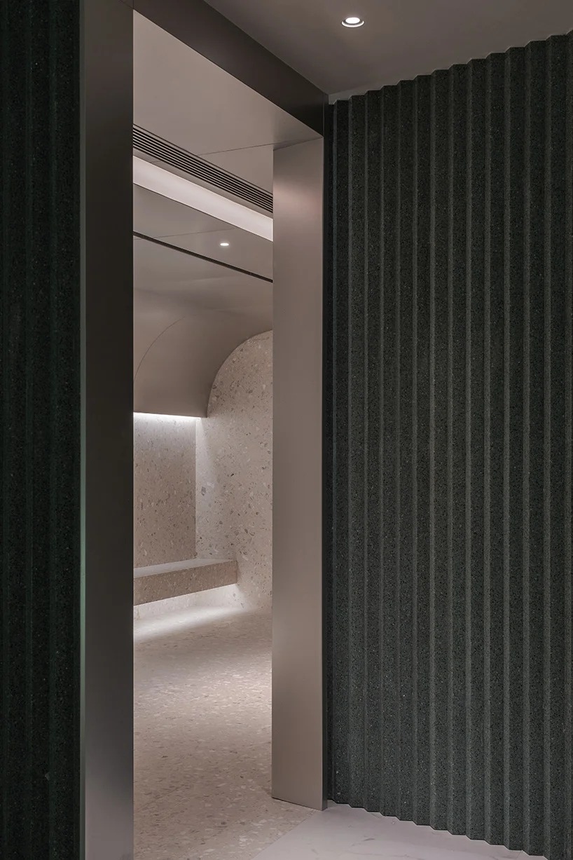 in the original building, there were various rooms and spaces, mostly separated and isolated, only connected through doors. the intervention restructured the space so that the foyer serves as the juncture of the communal spaces, views, and flows, with all rooms organized around it. furthermore, studio 10 has reduced the classical components of the pre-existing structure to abstract blocks, proportions, and symbols, before re introducing them into the newly designed interior.