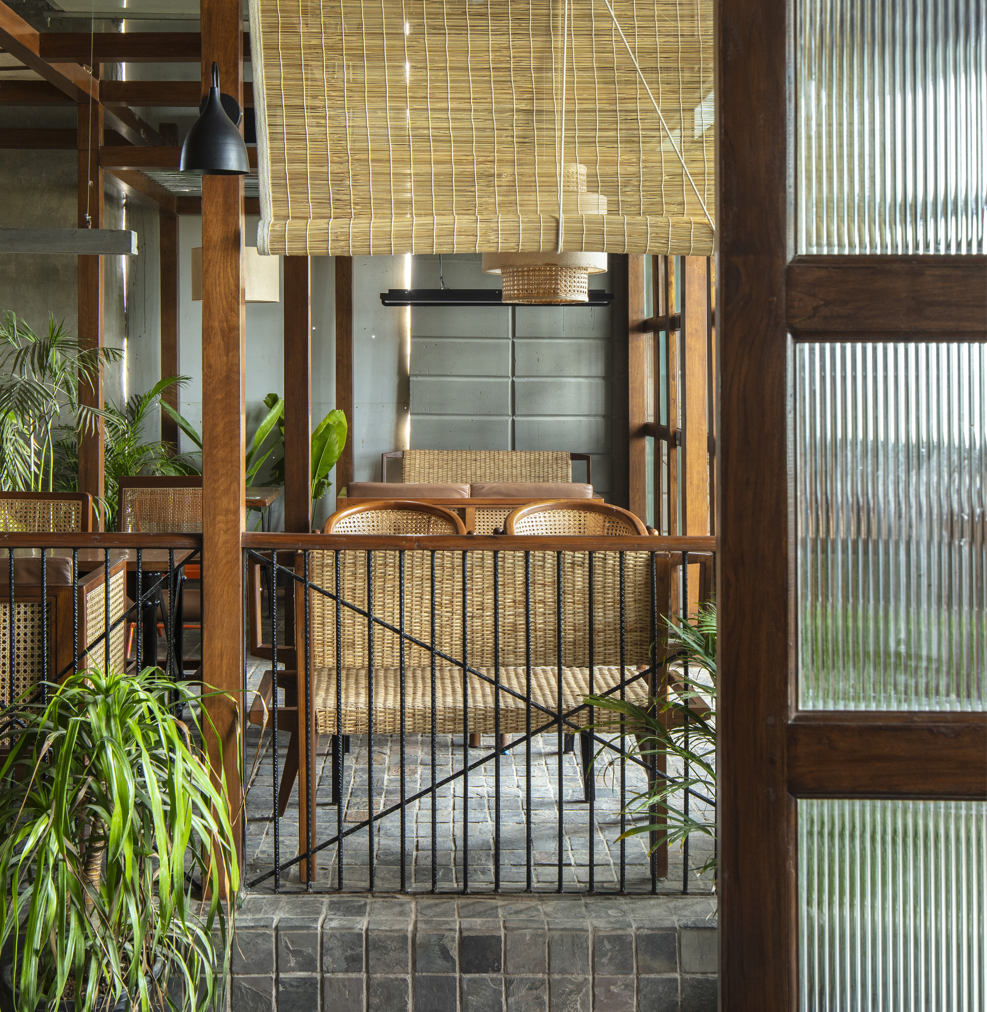 Masked waiters, tables placed six feet apart, and fluted glass are all the elements that realize a half Vietnamese- half contemporary space set in New Delhi,India. Renesa’s new design introduces India’s first covid response restaurant that responds to the “new normal” redefining the boundary between communal and booth seating in restaurants. With people yearning to come together with friends and family at restaurants and bars once again, the studio wanted our design to blend two seamless ideologies: design inspired by the buzzing streets and alleyway shops of Vietnam and the intricate lattice arrangement of Dwarka(New Delhi's largest residential Development)’s various sectors that allow to socially distance without seemingly so.