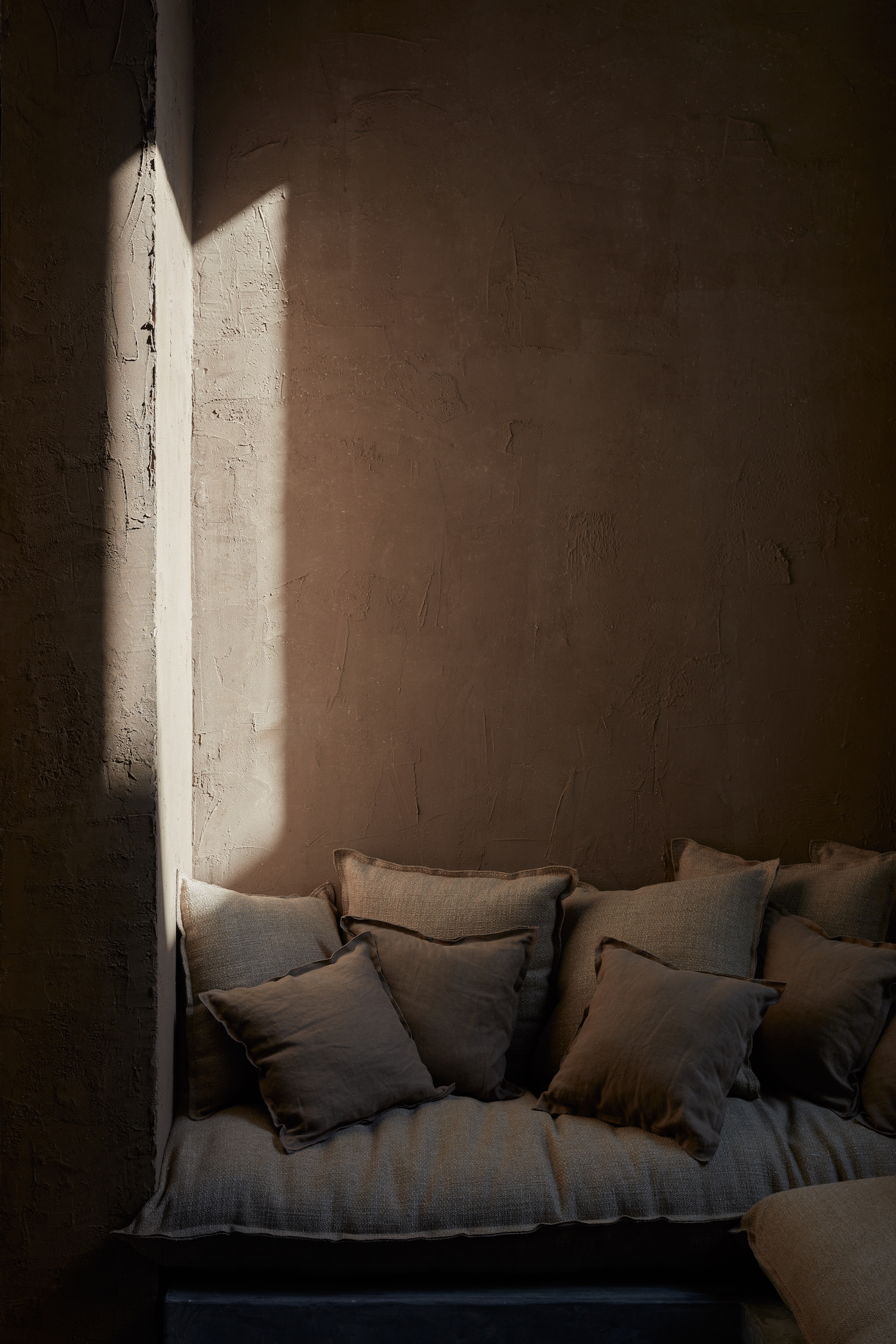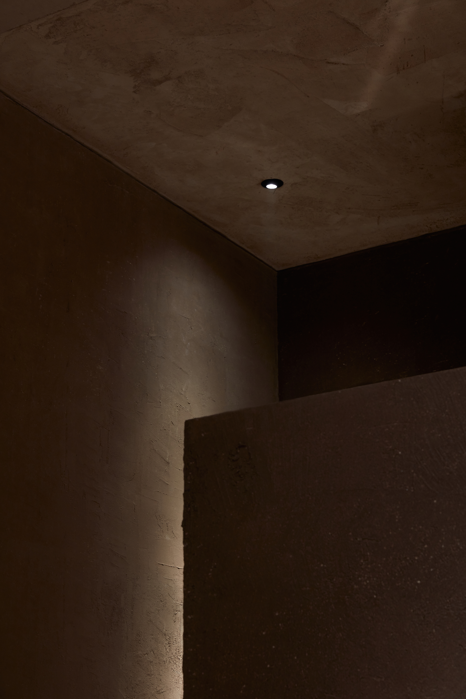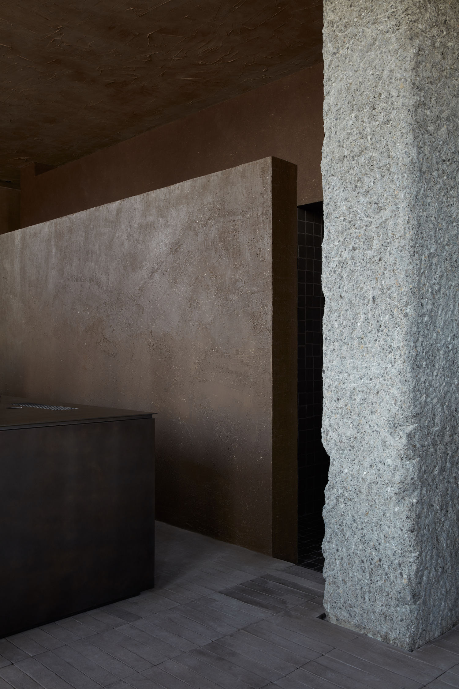 All equipment is integrated, producing a refined working space with seamless counters. With a strong desire to blend architecture and craftmanship, Bone worked alongside several talented specialists that helped compose the space. The raw earth surfaces emulate different colors that are natural and pigment free. Clays from different parts of Italy have been sourced by Matteo Brioni, who developed the traditional raw earth surface finish that is healthy, hypoallergenic, versatile, and sinuously adaptable to any surface.
