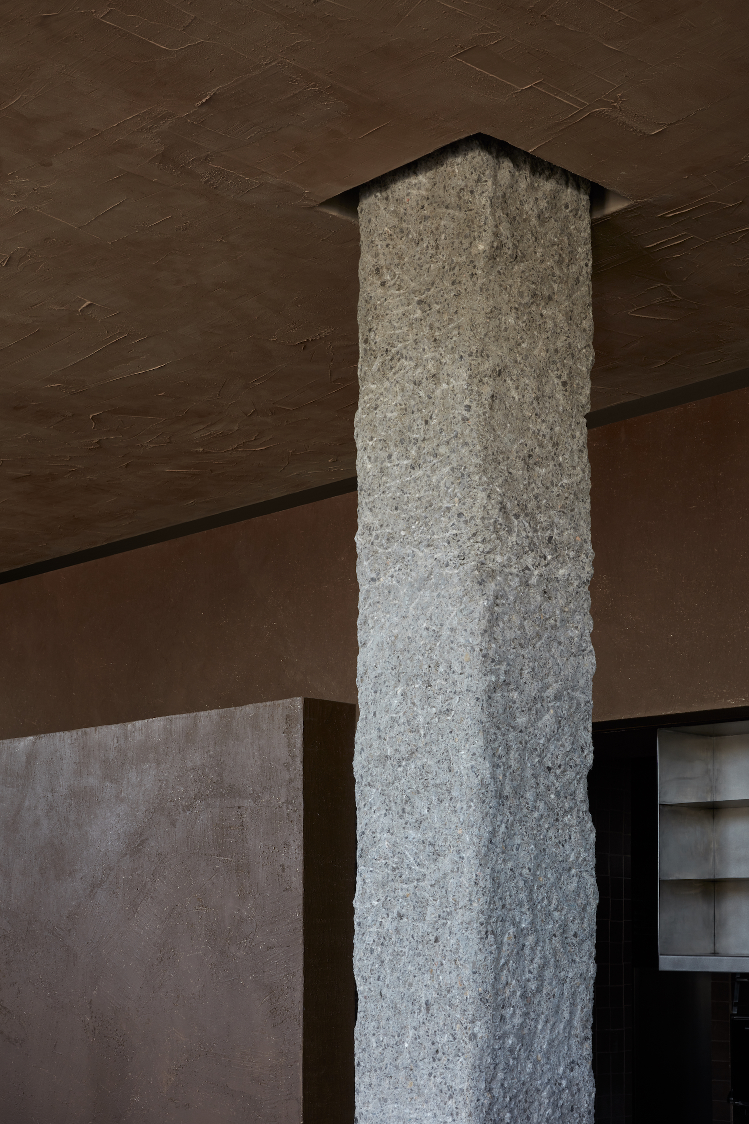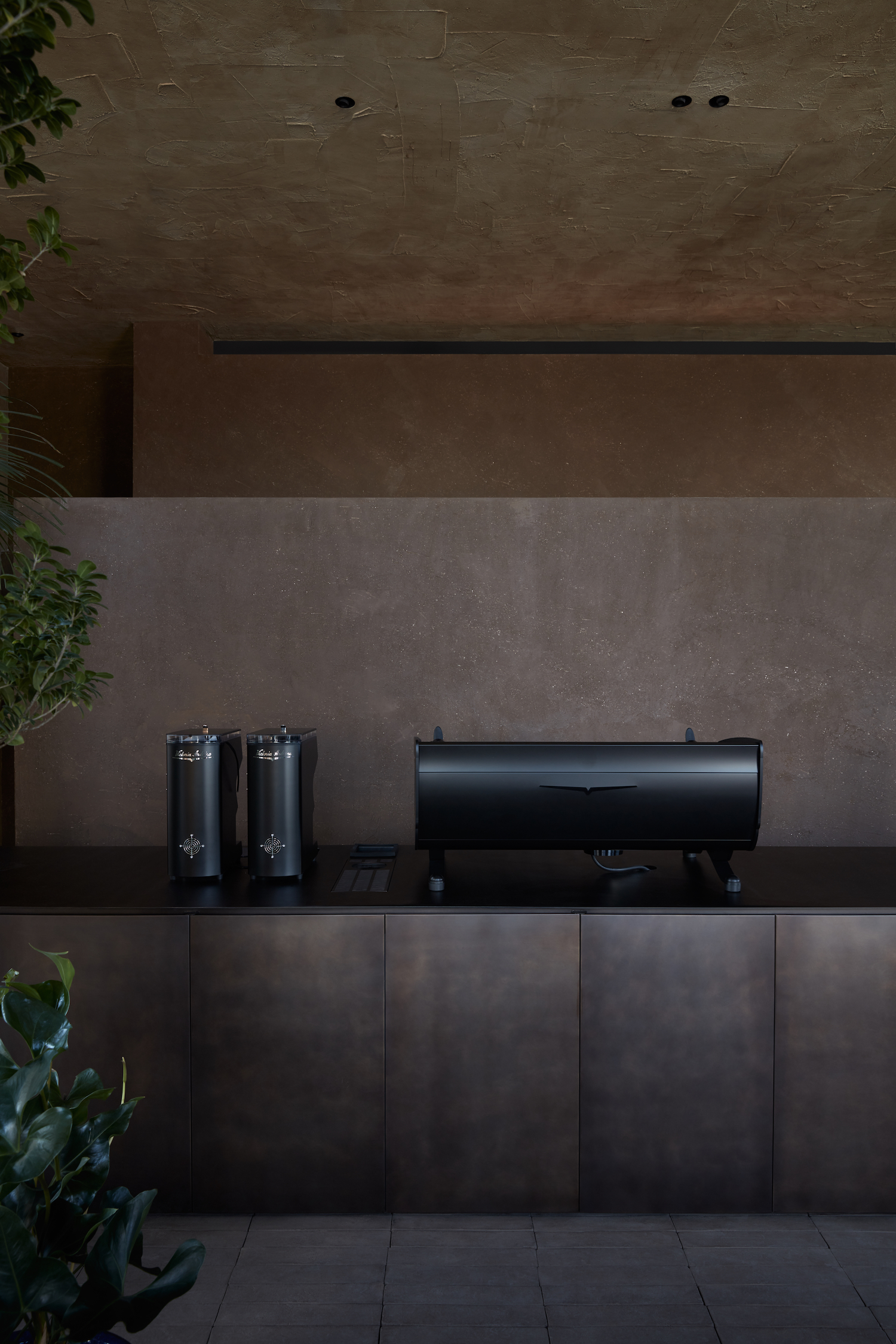 The shop faces the east, allowing sharp rays of sunlight to penetrate through the clear glass doors during the brisk hours of the day. The sunlight also exposes the hues and undulations of the clay walls and uneven surfaces of the terracotta tiles. A slot punctuates the cacao walls and frames the hand hammered column at the center of the space. The tailor-made kitchen displays the talent that prevails behind the Mediterranean cuisine and allows guests to enjoy the culinary energy.