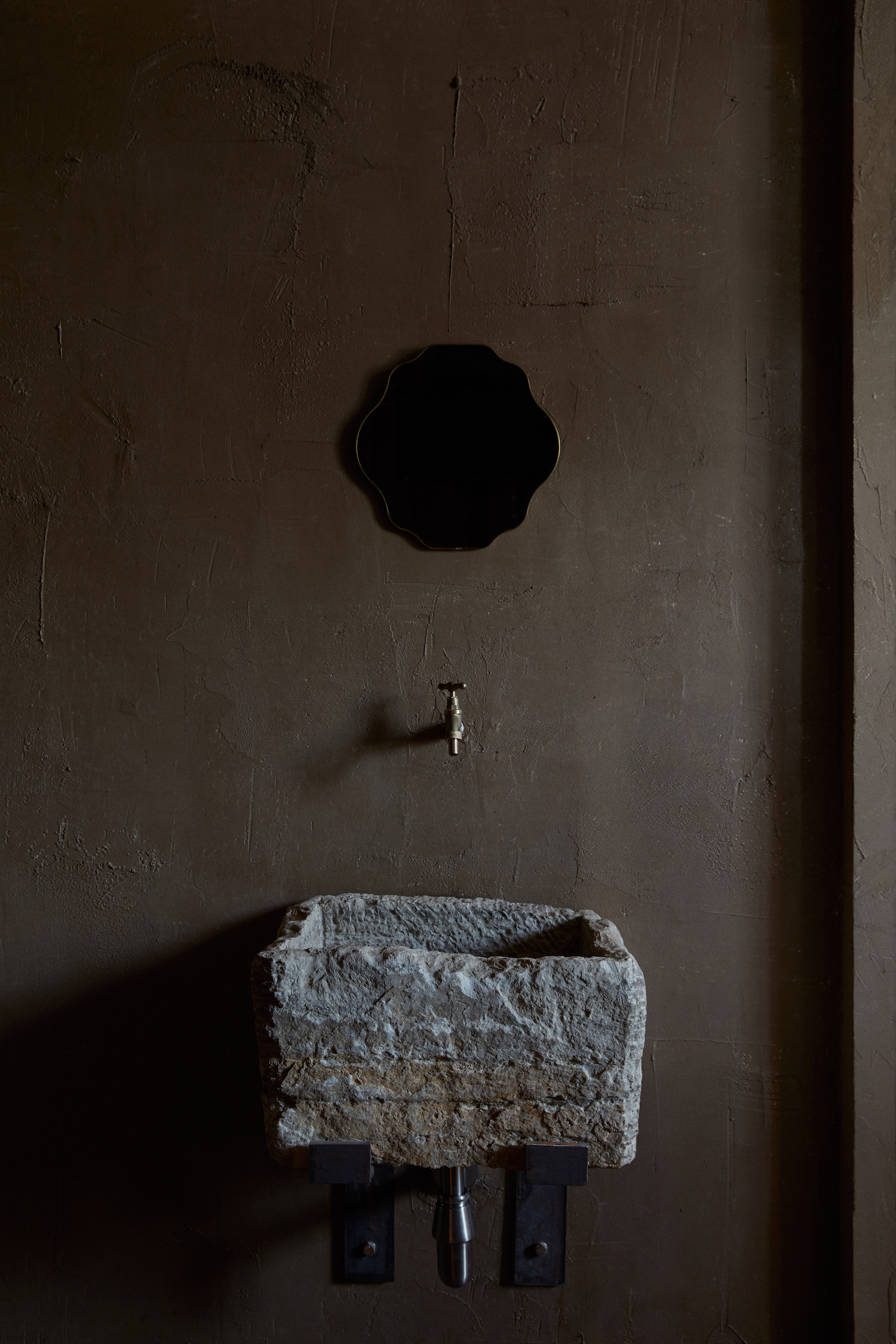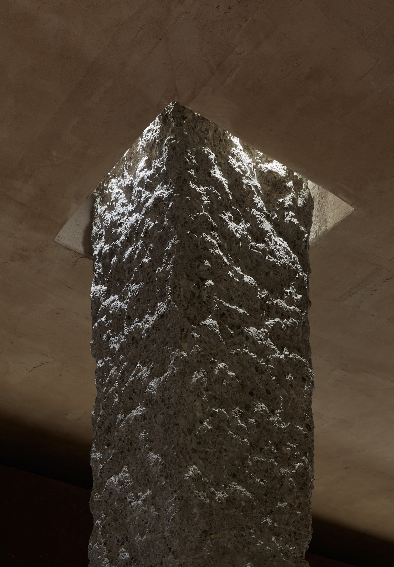 Matteo’s brothers, who own Fornace Brioni, have also collaborated with Bone to compose the terracotta floor tiles that grace the space with their imperfections and artisanal craft. The earthy materiality and hues of Terra play an essential role in the intimate feel of the space as the monochromatic palette soothes the brutalist forms. Warm materials were considered, such as reclaimed and weathered woods, linen fabrics, smoked metals, as well as handmade ceramics. The strategically arranged projector and spotlights lay emphasis on the romantic atmosphere and the different textures and tones of the space.