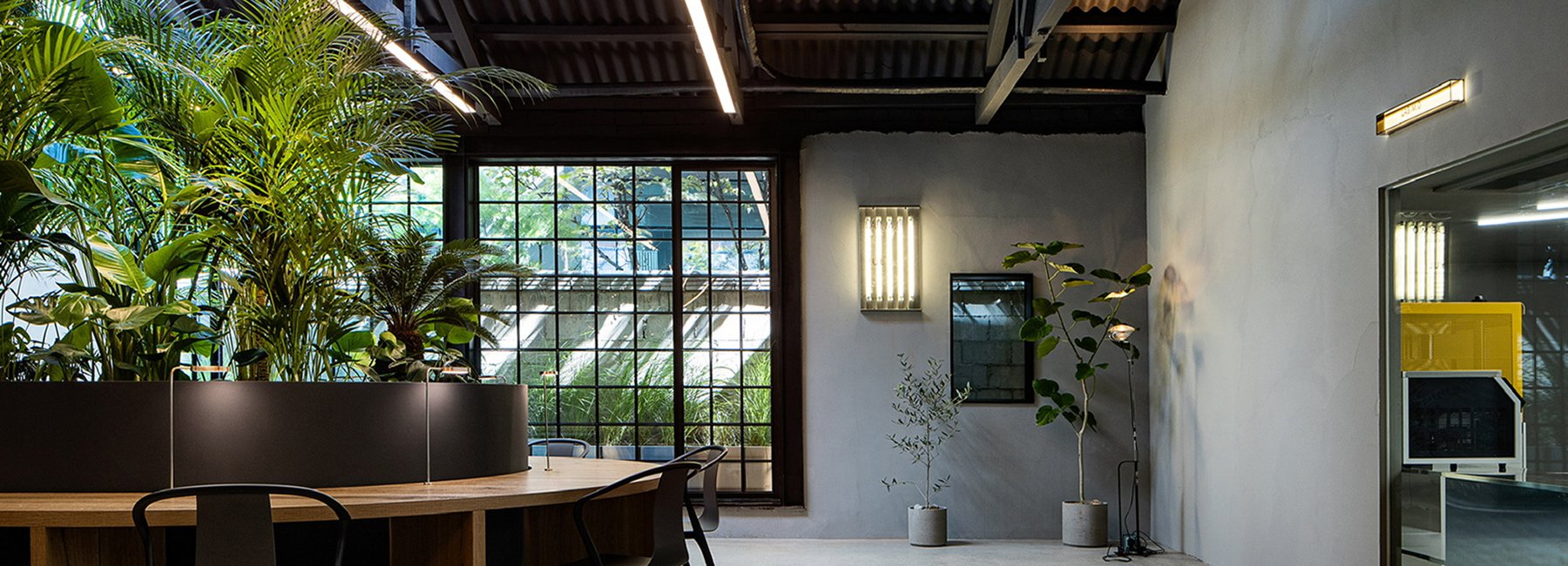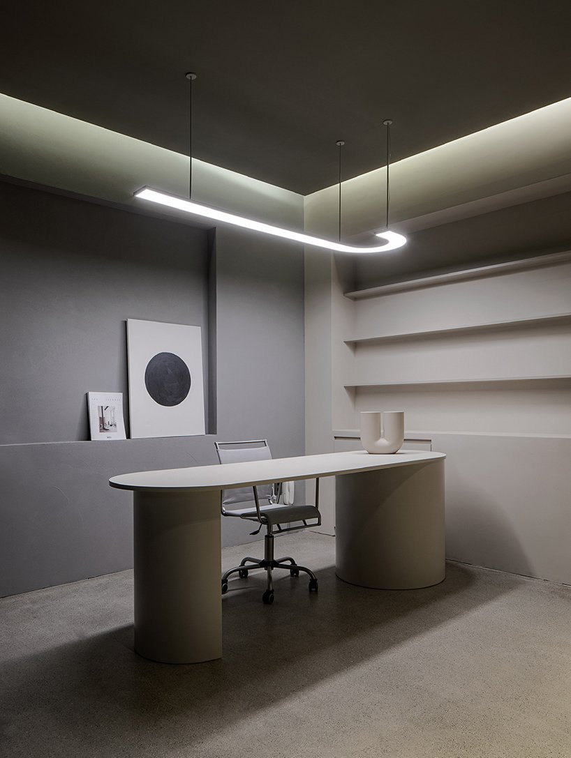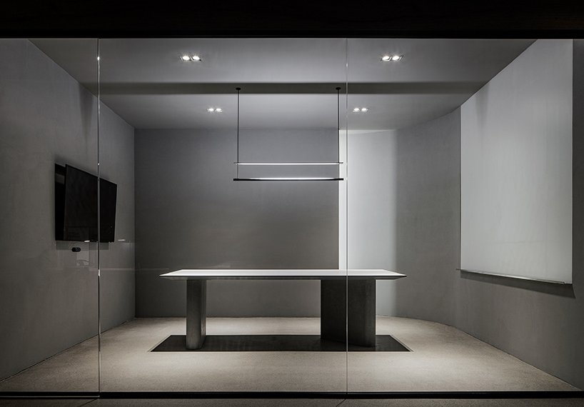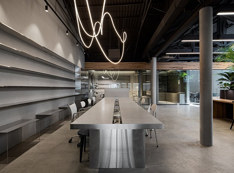 every space, except for the interior design room, sampling room, and meeting room that are separated for privacy, is open for everyone to communicate and exchange ideas freely. studio mute has designed and fabricated most of the furniture and lighting fixtures (except for a few items) to adapt to the creative atmosphere of the firm. the tables in the meeting room were collaboratively made by manufacturers from three different industries –HPL, wooden furniture, and concrete furniture.