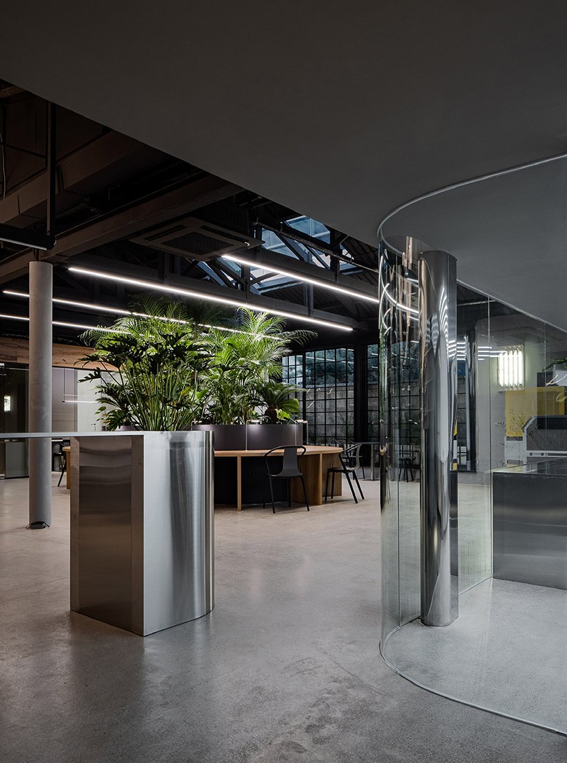 the ‘plant table’ in the center has a natural aura in and of itself. it is occupied by different kinds of plants to secure the private desks of each member while allowing them to share the pace of work with its synergetic role. it is an essential element that plays multiple roles. in addition to the main table, there are plants throughout the space to soften the R&D center’s rigid atmosphere.