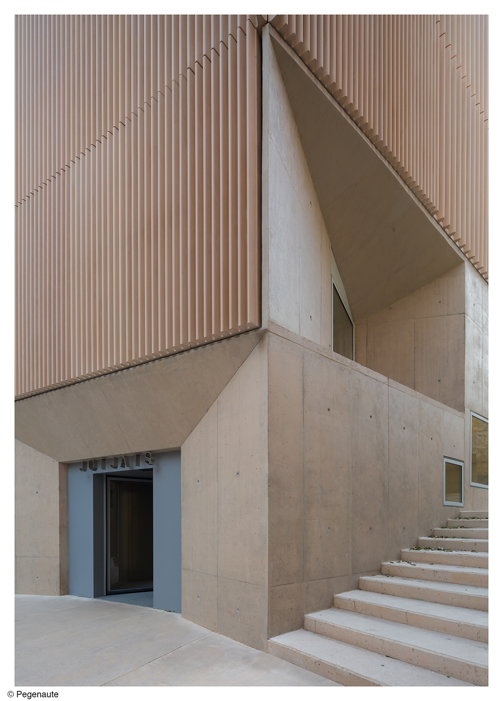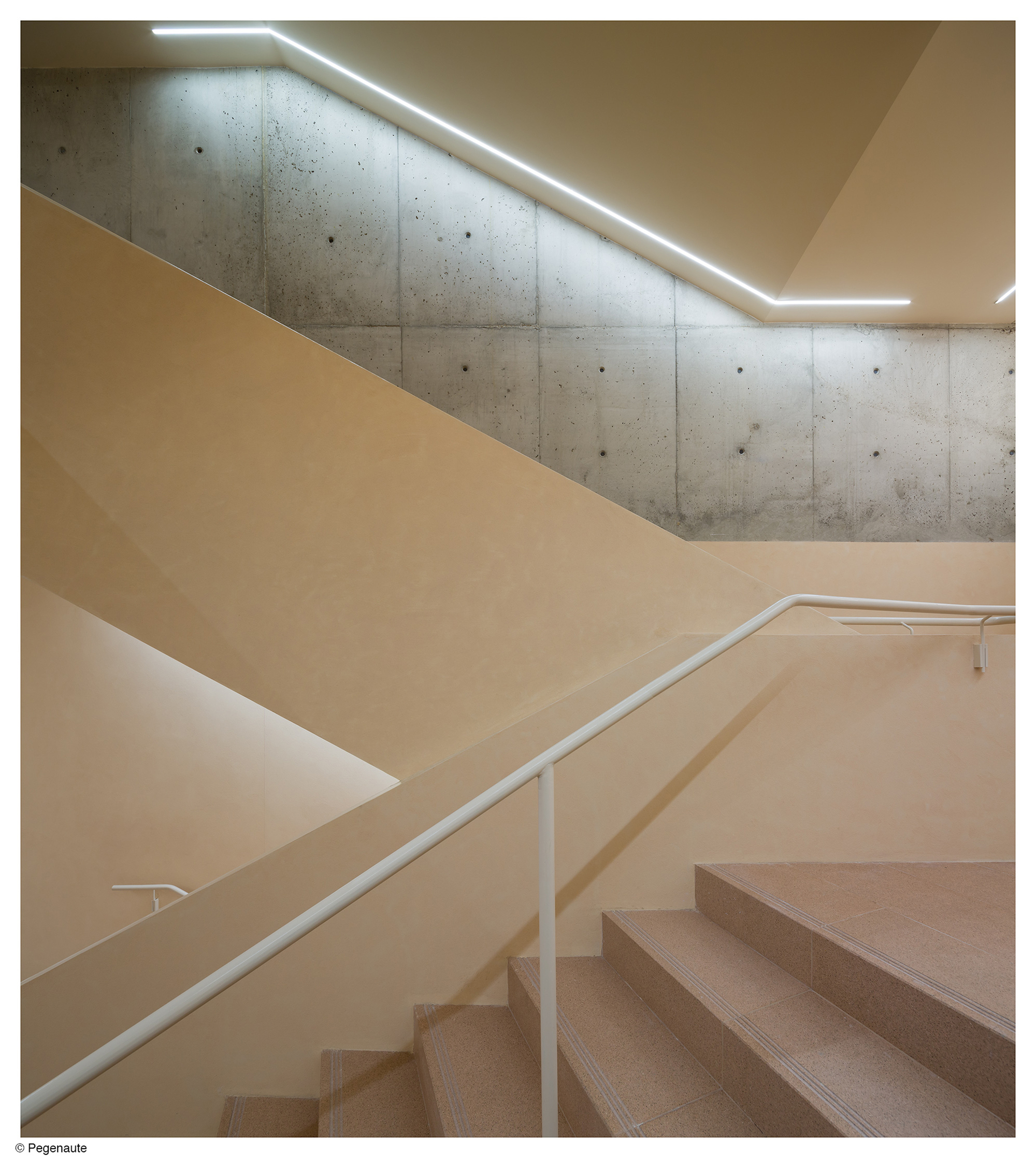 The volume of the building, responds to the alignements of the plot following the urban lines of the historic center: narrow streets with cloe-up views and foreshortening. A stony concrete plinth manufactured on site forms the first level of the ground floor and the first contact with the urban space and the topographic difference.