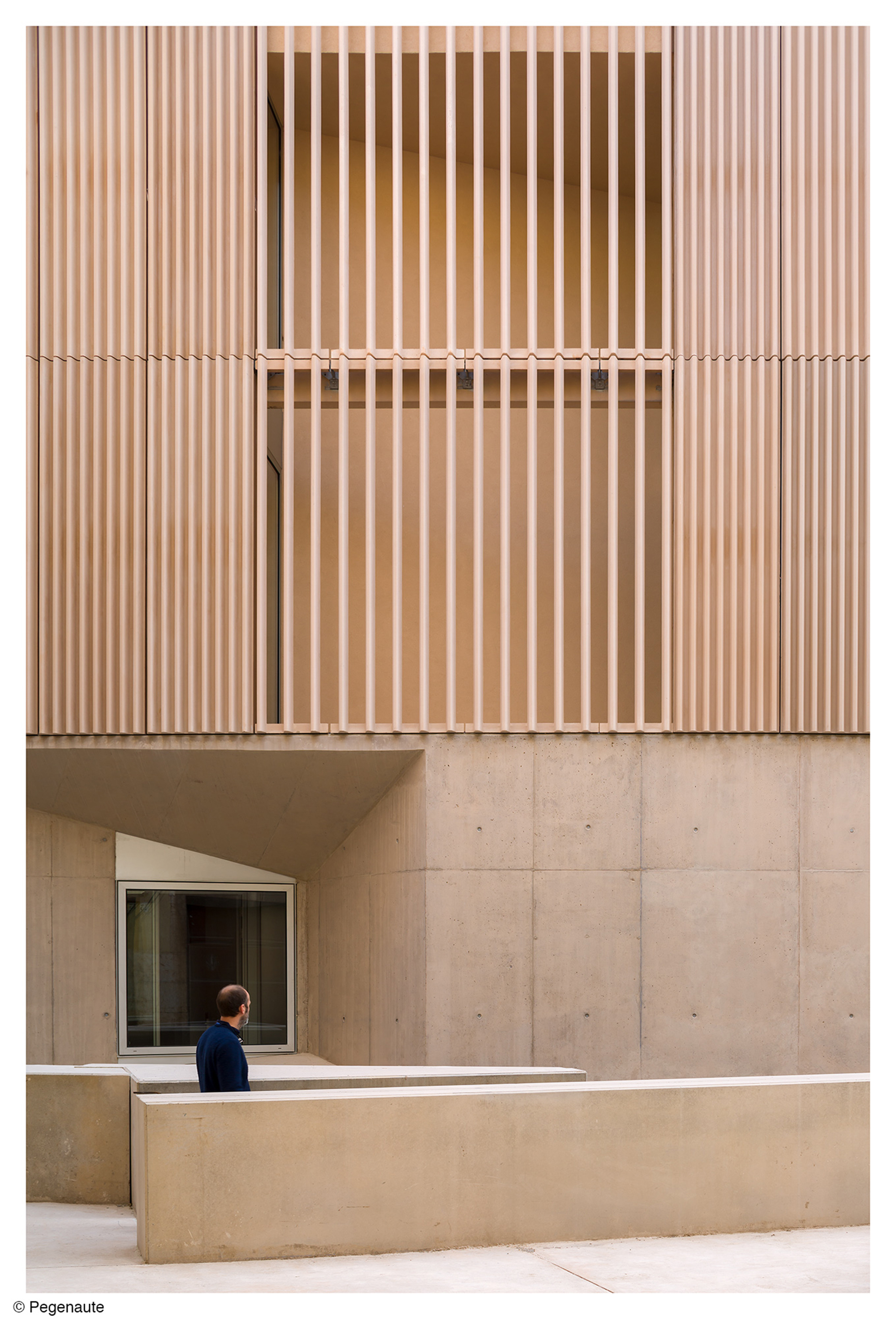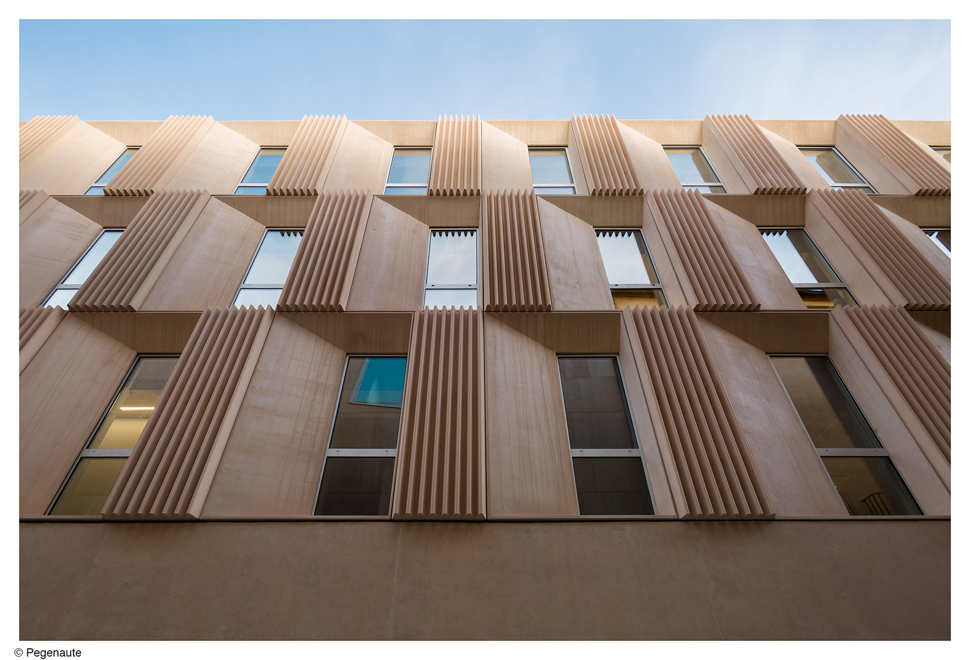 The facade of the new building uses the warm color palette of the environment to give texture and shape to the corrugated prefab concrete pieces that configure the building’s envelope and trace the irregular shape of the place.