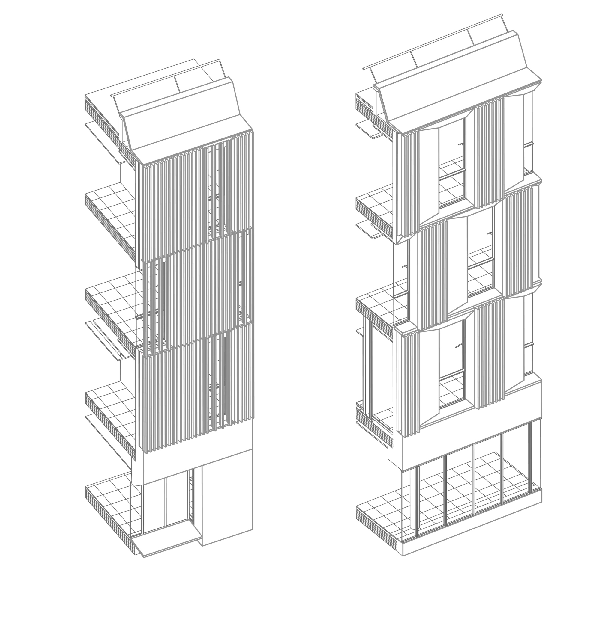The internal structure is regular and ordered. On the other hand, the exterior volume responds to the irregularity of alignements and topography. Between the inside and outside, an interstitial space of variable thickness appears and allows to mediate between these two worlds, providing intimacy and permeability to workspaces and modulating natural light.
