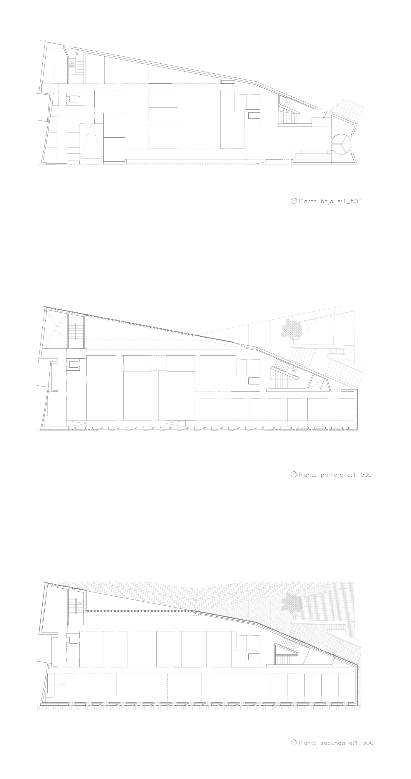 In contrast to the plinth, a second level with three floors is defined by an industrialized system of three modules of approximately 1000x3000 mm of prefab concrete with which it is possible to systematize the building while solving different construction situations: the corners, the openings in relief and the slat system...A play of light and shadows provides continuity to the entire facade.