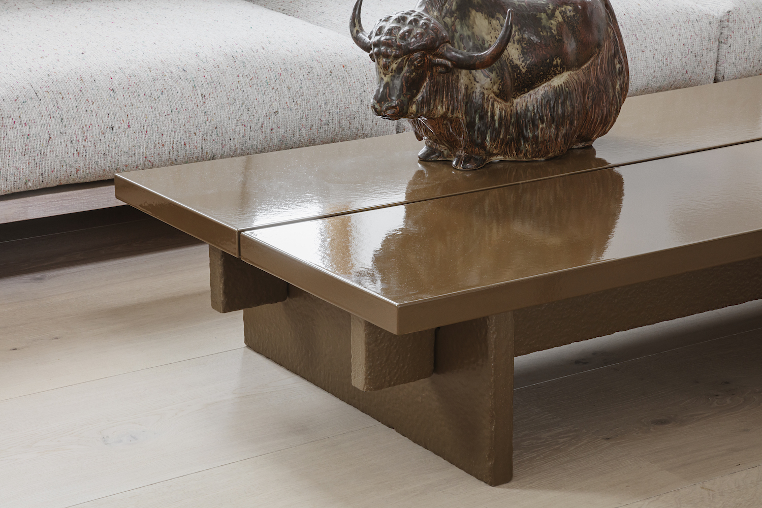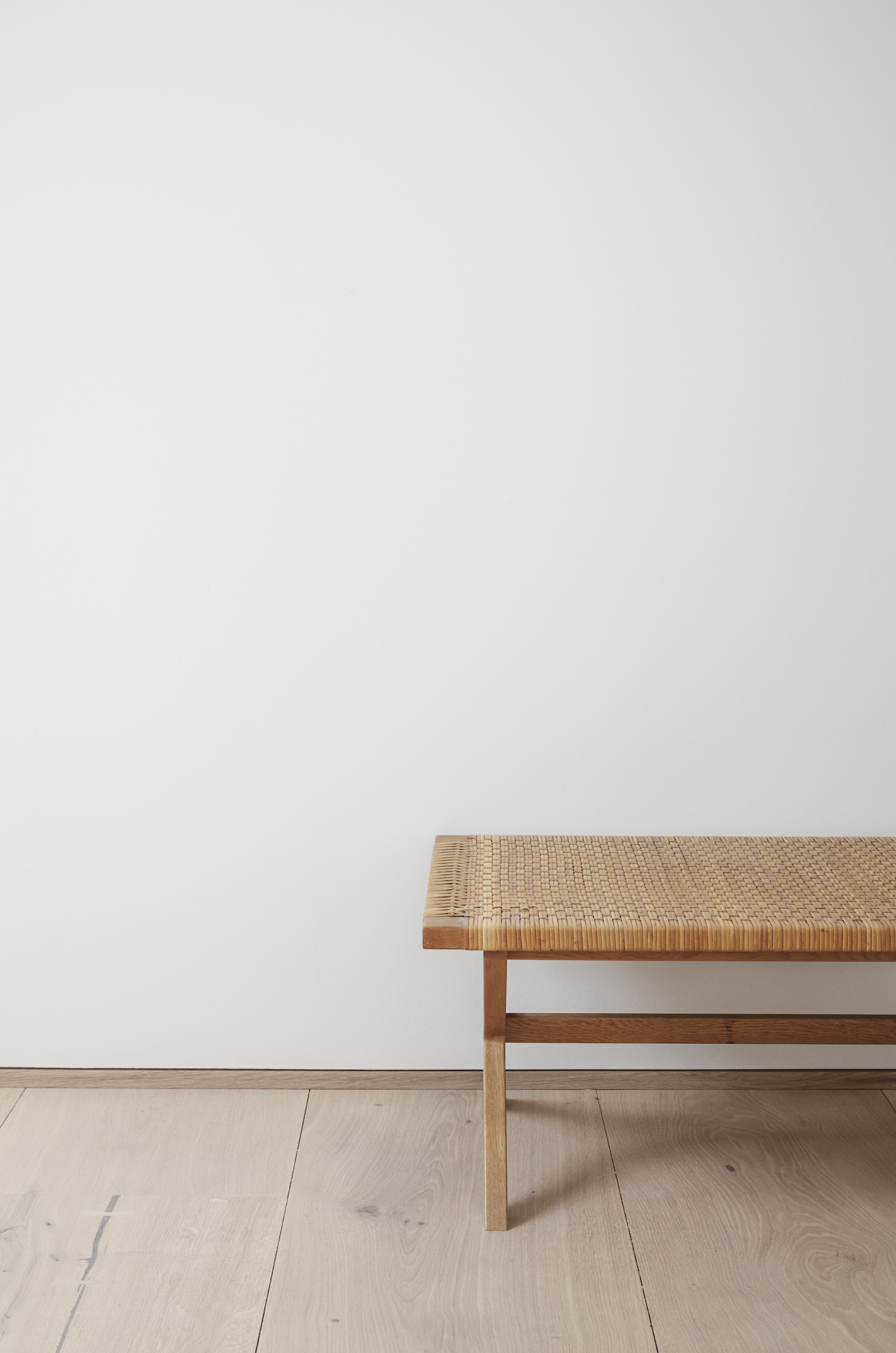 After experiencing Thulstrup’s interior concept for Noma, the client admired the application of natural local materials such as Dinesen Heart Oak planks and Bornholm granite. To honour the value of locality, similar materiality can be found throughout the apartment—not only for floors and walls but also for custom-made furniture that are implemented as architectural elements. The built-in sofa bench that runs the length of one wall, an in-built dining bench as well as the 200-kilogram glazed lava stone coffee table are only a few examples.