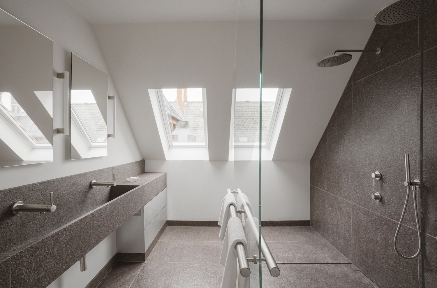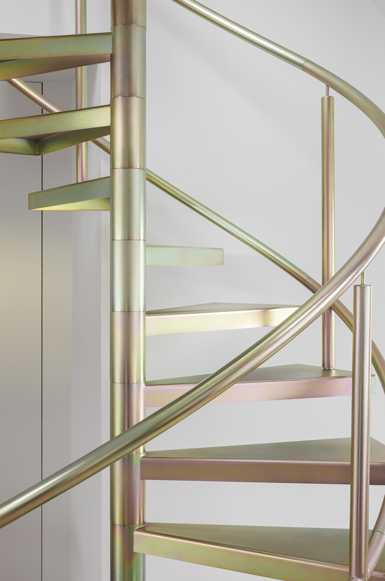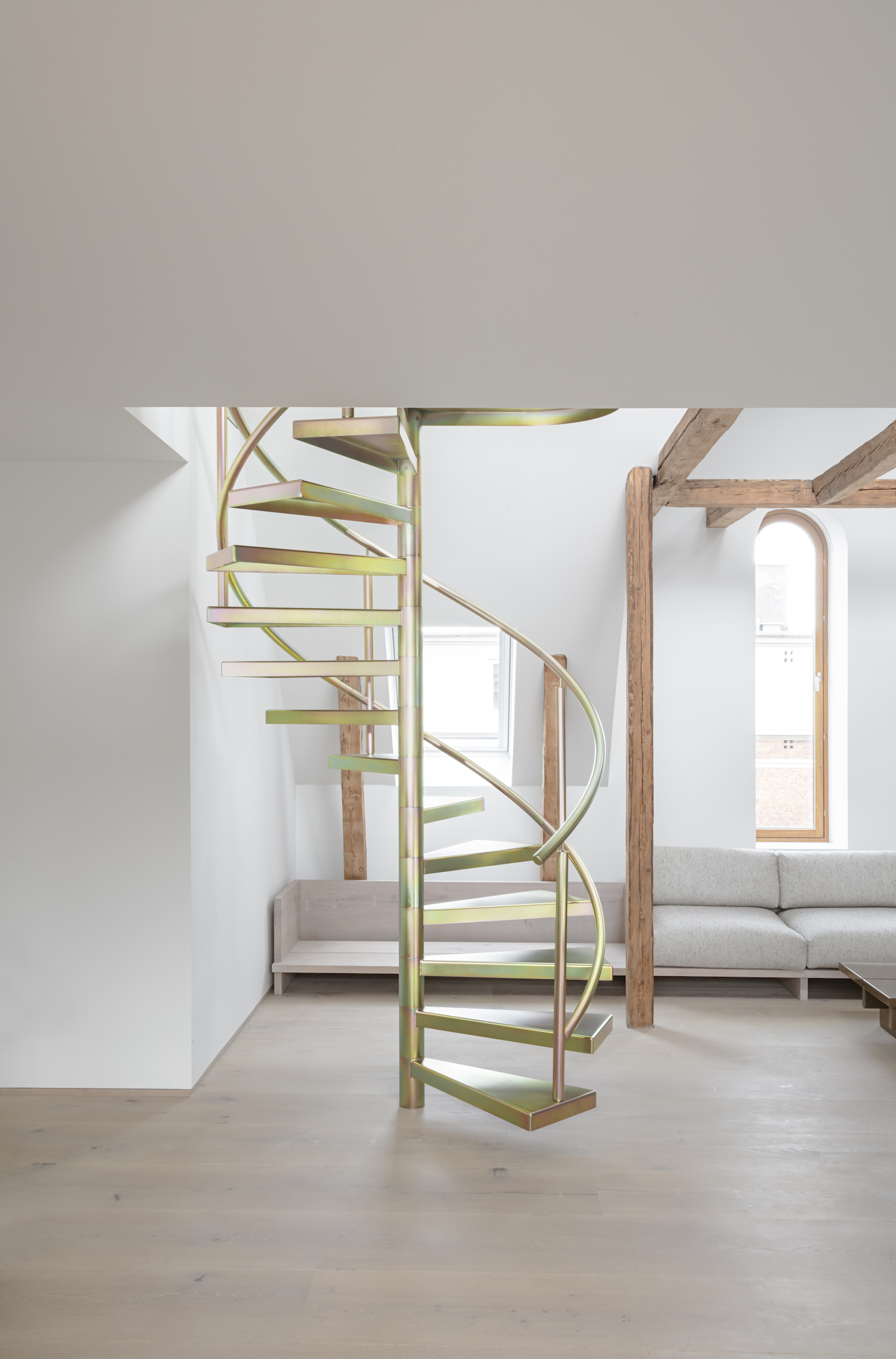 As an ode to his own design principles, Thulstrup added spiral staircase made from glass-blasted steel and a custom yellow-pated zinc finish mainly used for industrial purposes. “It’s a striking yet thoughtful sculptural gesture that ties together the two floors. The special finishing interacts with the abundance of light in a way that creates beautiful reflections with dashes of green, pink and blue.” The stairs lead to a reading nook and the new roof terrace with a spectacular view of the city.