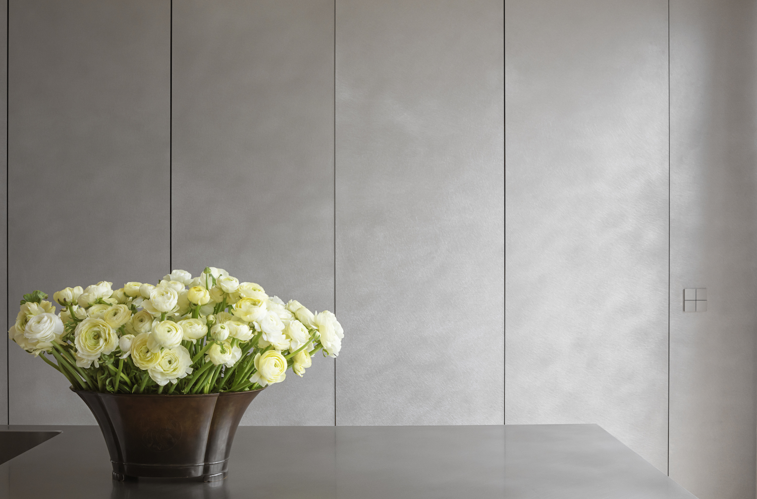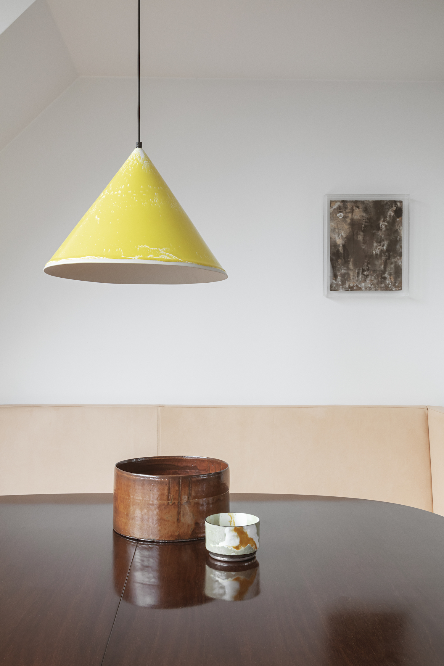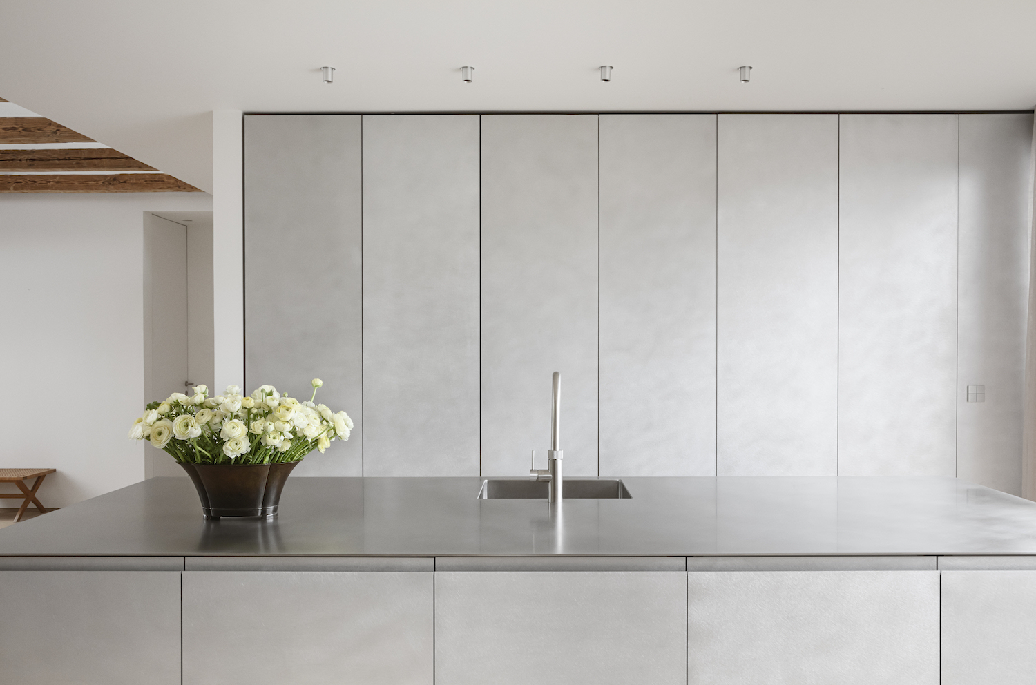 The open-plan kitchen, featuring Plate—Thulstrup’s latest design for Reform-compliments the dining nook although it might not seem like it at first glance. However, the simplicity of the space enhances the softer qualities of the crafted metal finish and invites the hand-brushed aluminium to work its full potential.