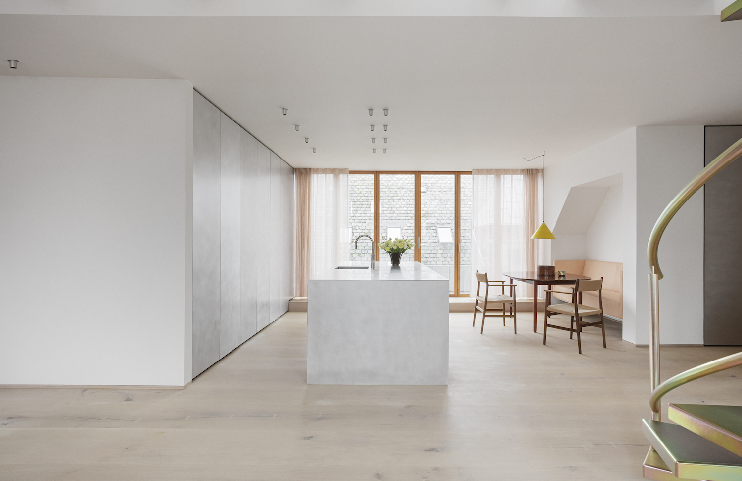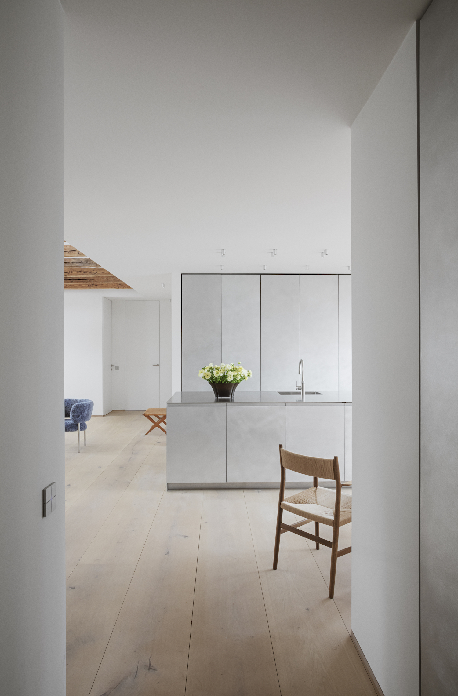 Vester Voldage is a minimal apartment located in Copenhagen, Denmark, designed by David Thulstrup. For Copenhageners, chasing light is part of their everyday, no matter the season. After all, light has a profound impact on how one feels in a place. For his latest residential project-a 150 square meter top floor apartment of an 1890s building in the centre of Copenhagen—David Thulstrup took point of departure in exactly that, and prioritized implementing a greater sense of space through a range of bold architectural interventions.