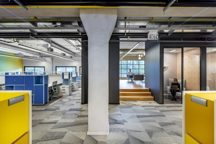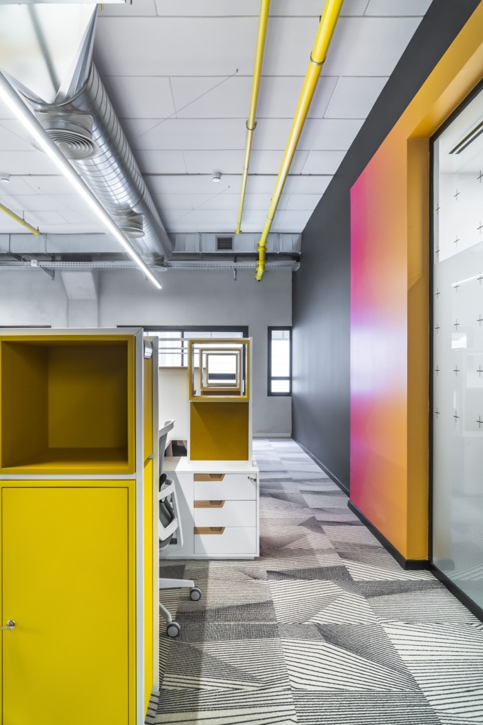 KLA offices are designed so that the base is neutral (carpets, ceiling, walls), and the color travels as a connecting line between the spaces injecting spaces with energy. In this way, the ceiling reveals its systems in monochromatic colors, except the yellow sprinkler system that runs all along the ceiling and creates interest in looking up. The walls and columns are left in exposed concrete, the carpet is neutral and geometric, and their gray tones completes the creation of the quiet background and gives a stage to the colorful appearance of the elements in the space.