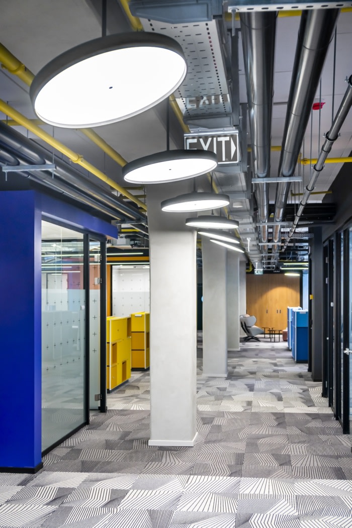 KLA offices are designed so that the base is neutral (carpets, ceiling, walls), and the color travels as a connecting line between the spaces injecting spaces with energy. In this way, the ceiling reveals its systems in monochromatic colors, except the yellow sprinkler system that runs all along the ceiling and creates interest in looking up. The walls and columns are left in exposed concrete, the carpet is neutral and geometric, and their gray tones completes the creation of the quiet background and gives a stage to the colorful appearance of the elements in the space.