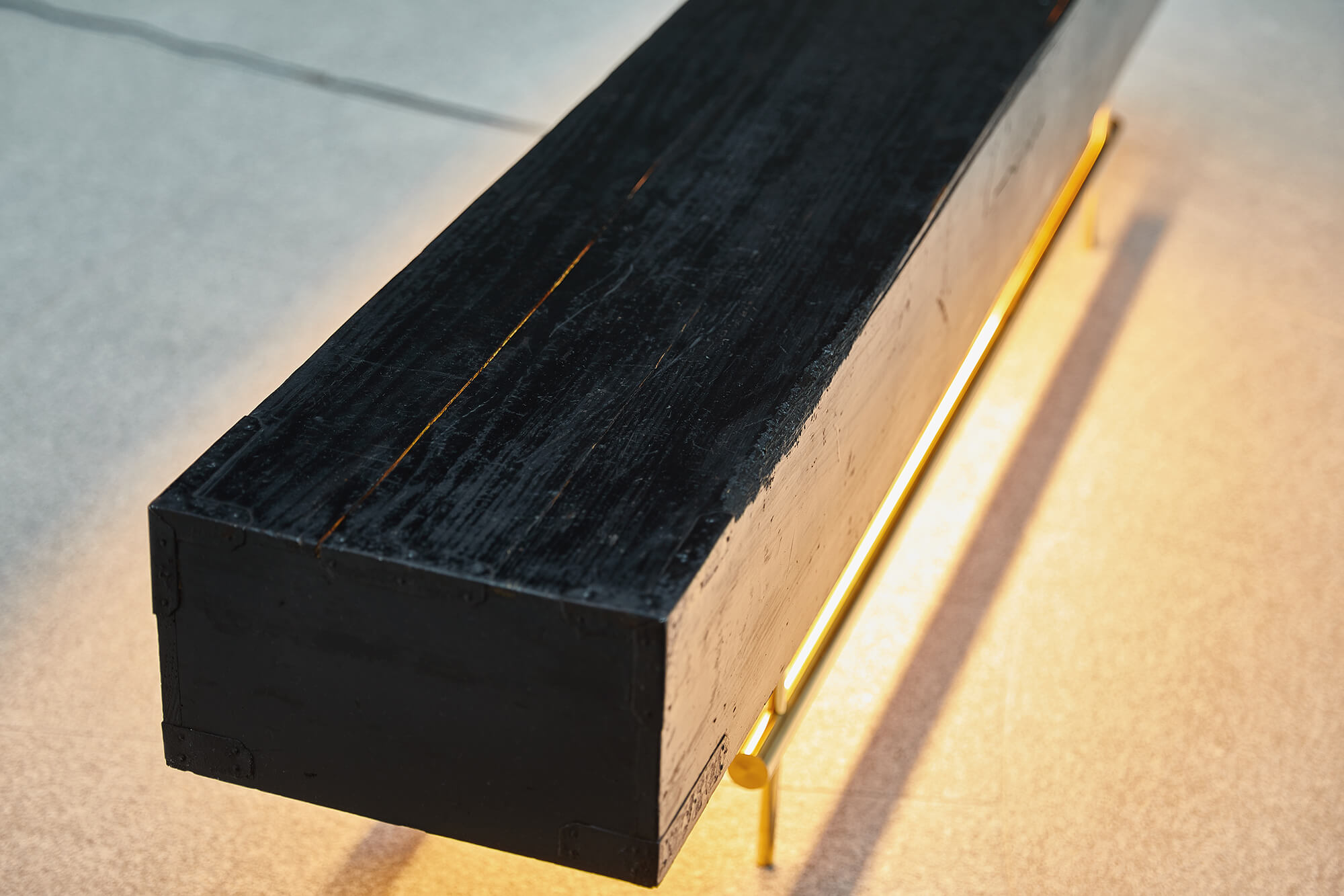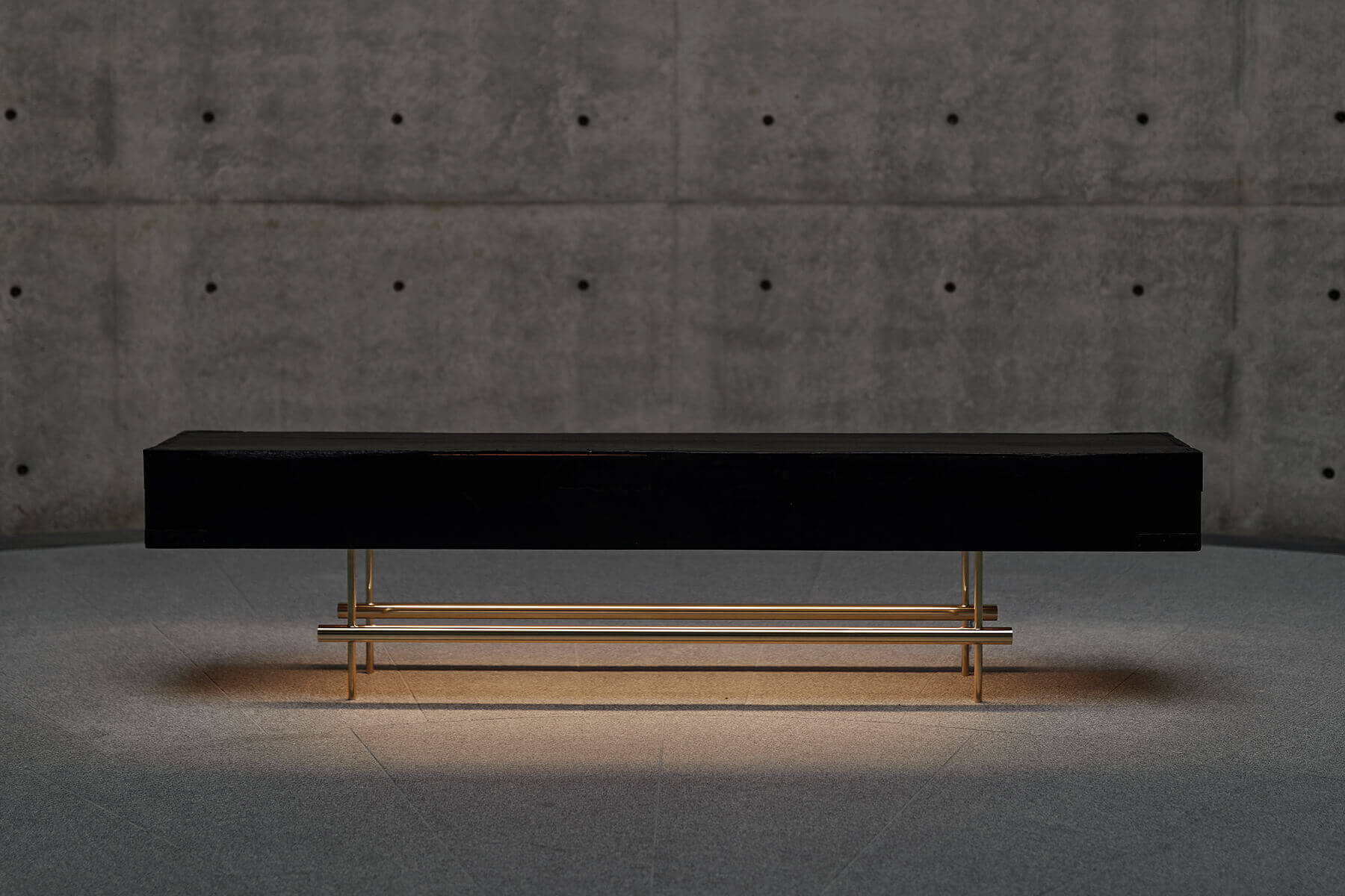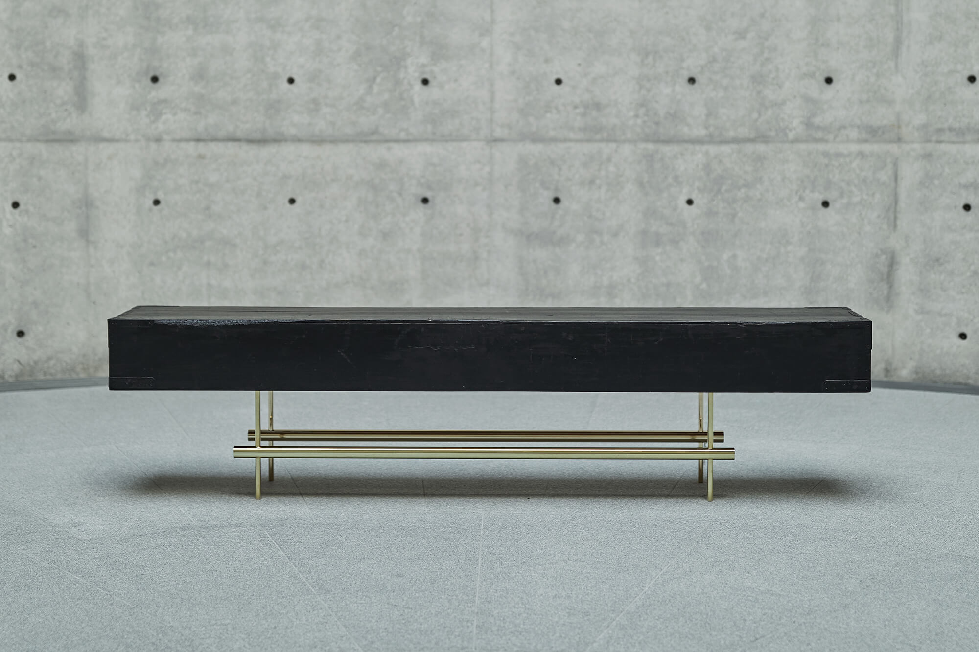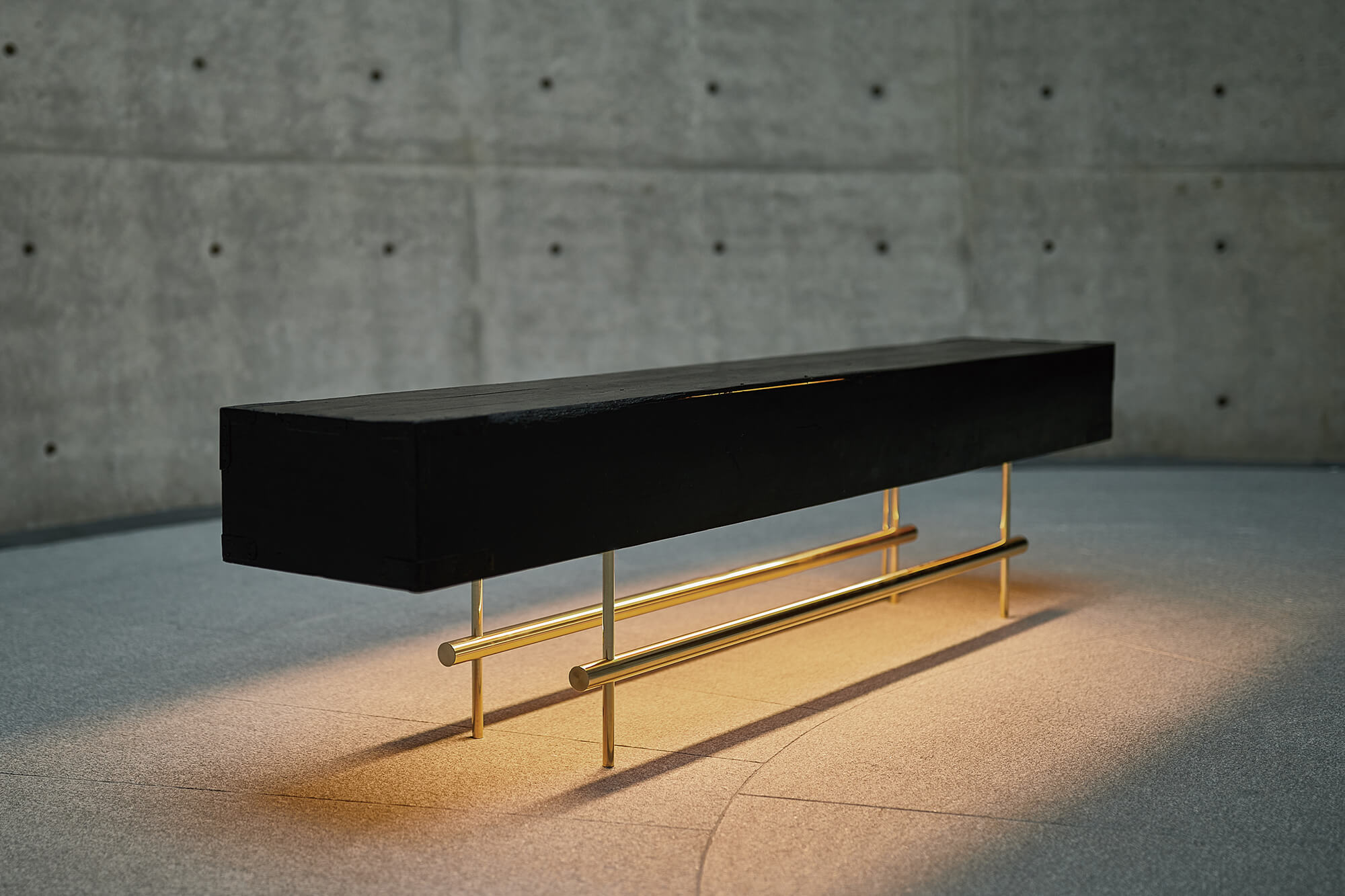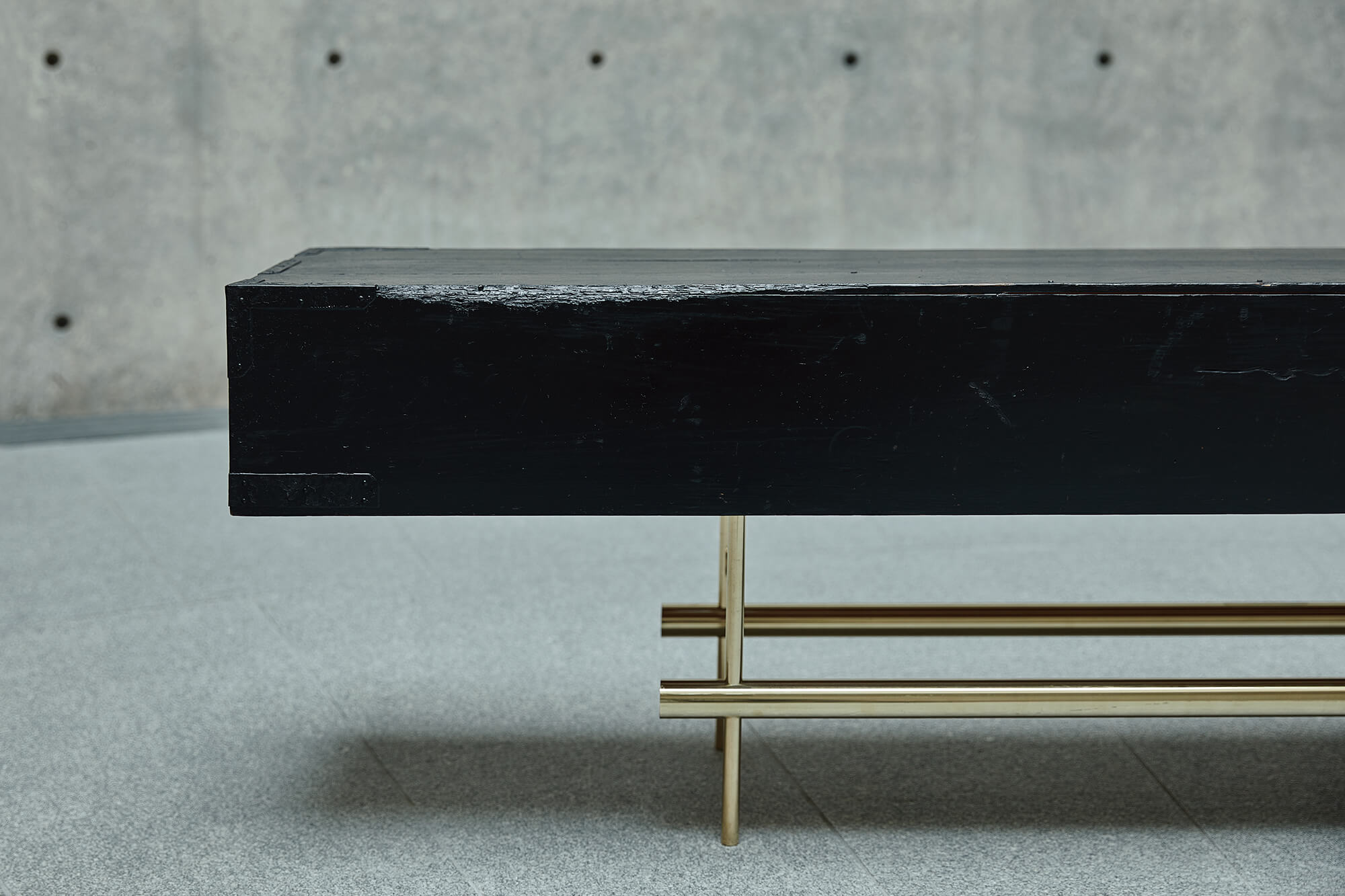 A low table by morphing a wooden box lid that stores two Japanese gold folding screens. The lights are emphasis the attractiveness of black, which has a texture and gloss of antiquity.