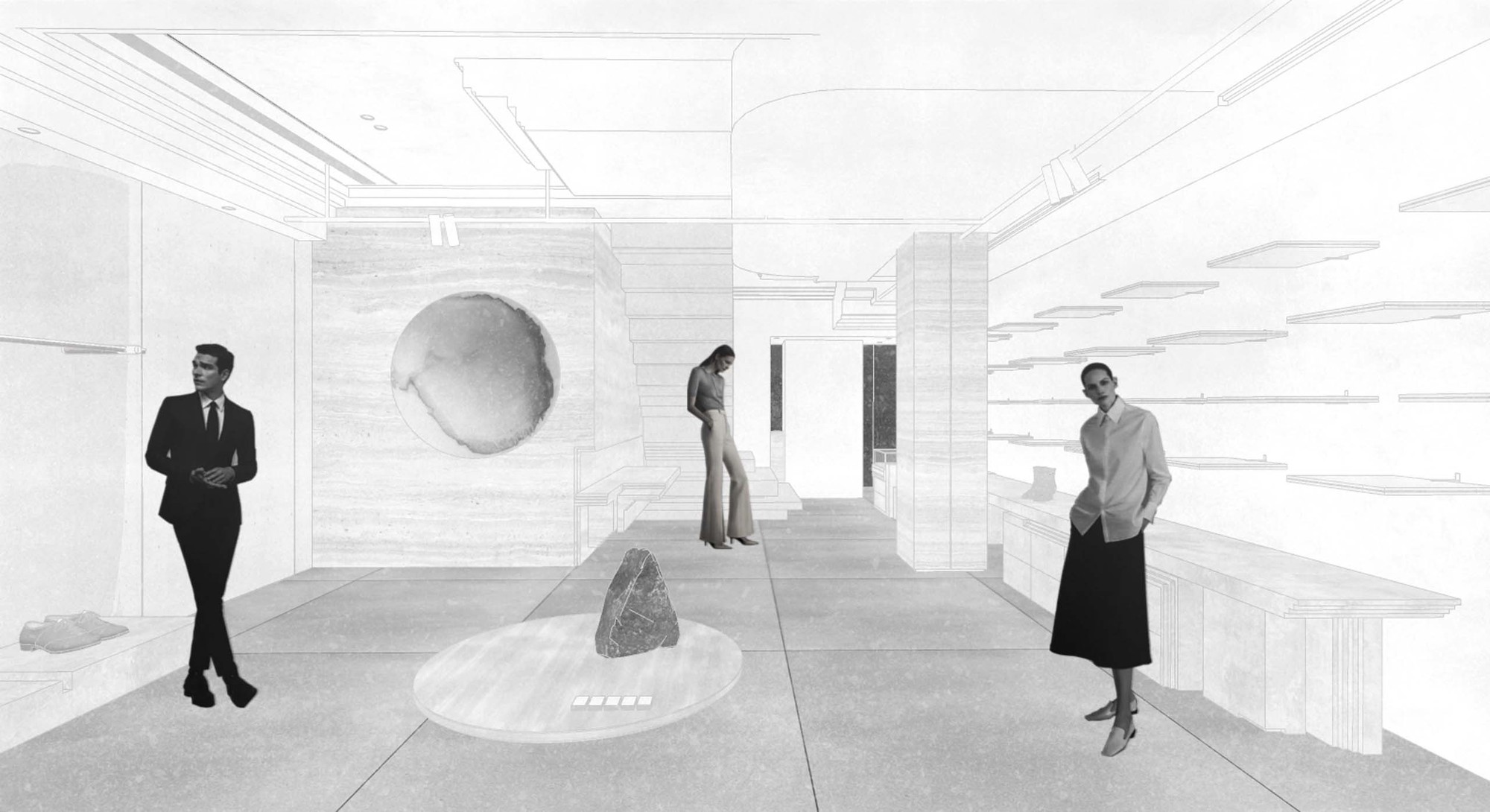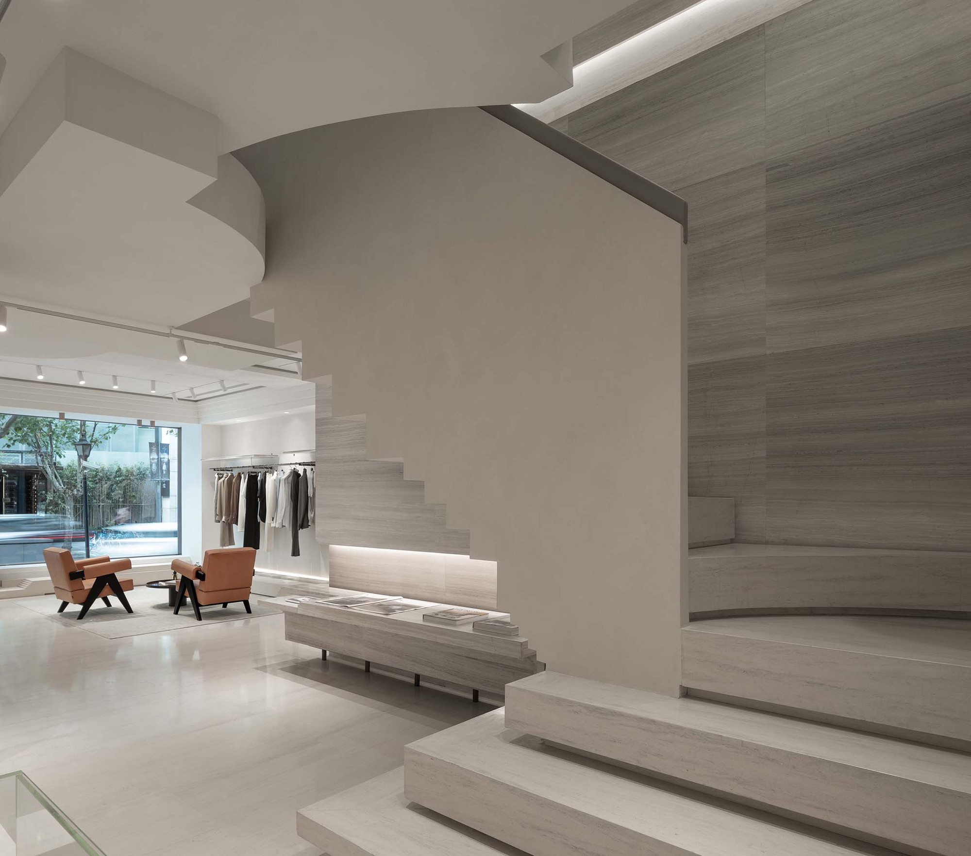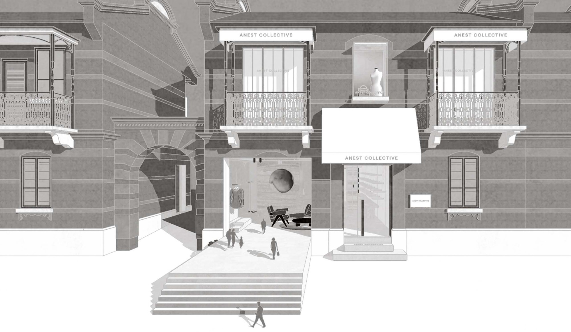 Clothing is a mobile building. From the tinniest spinning structure to the display space of the store, ANEST COLLECTIVE presents the basic but not simple craftsmanship. Responsible for creating space, WATERFROM DESIGN extends the creative concept to the urban landscape based on the narrative background of the brand’s foundations - Italian aesthetics and workshops. The impressive buildings are strung together by large and small squares and stairs, the platform between which becomes the place to sit on, and ancient cultural cities are the destinations to visit; each stair presents three-dimensional details of the history.