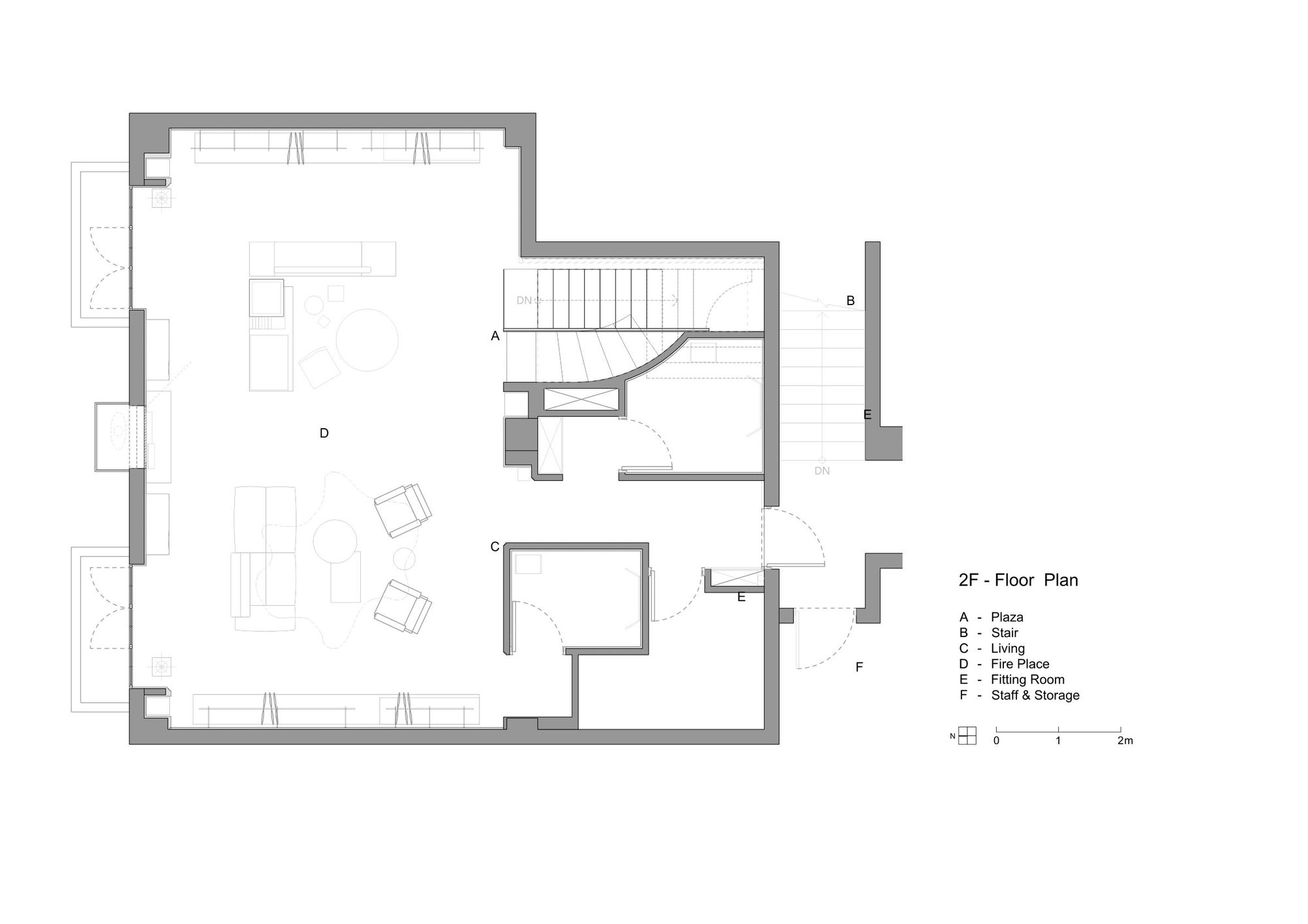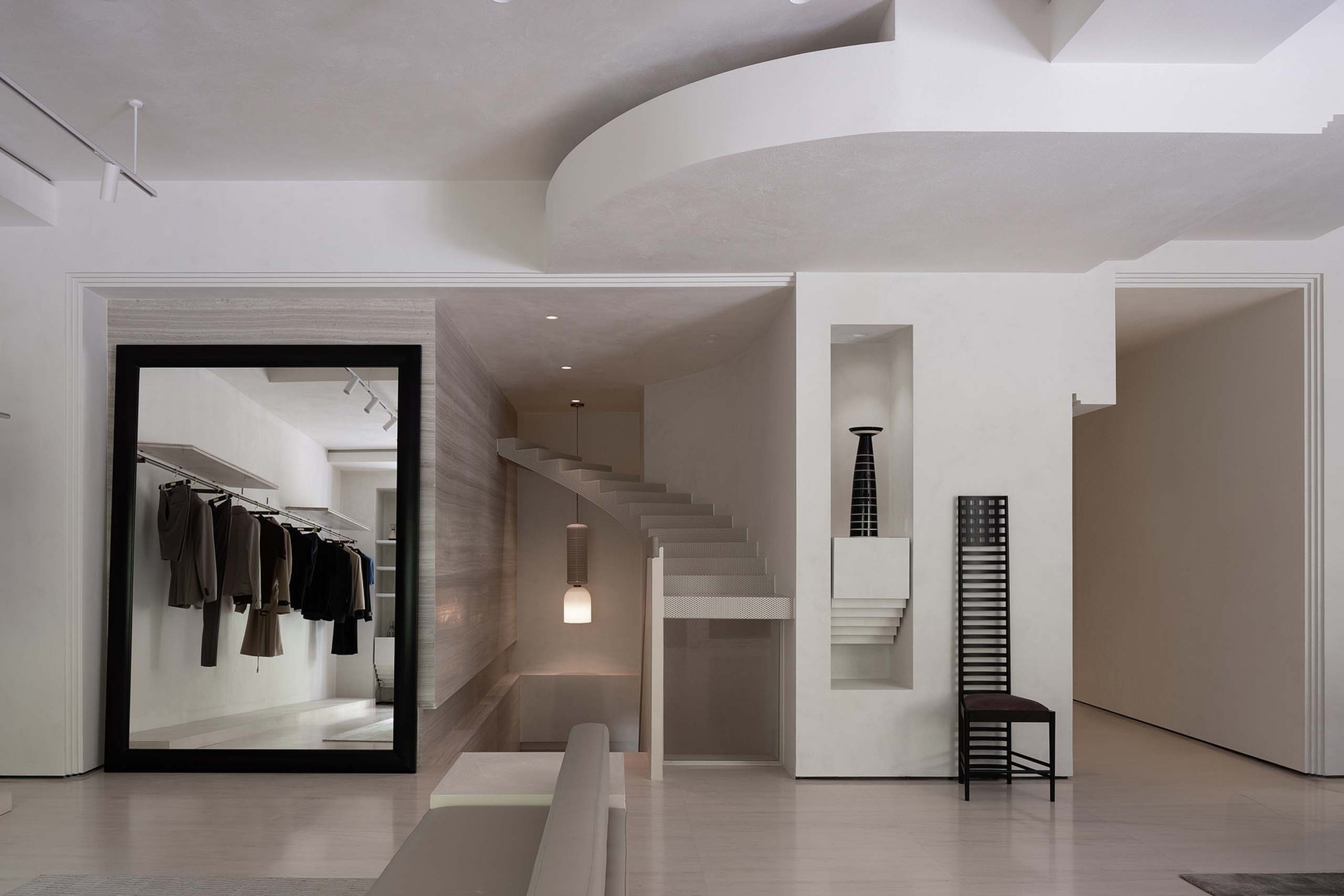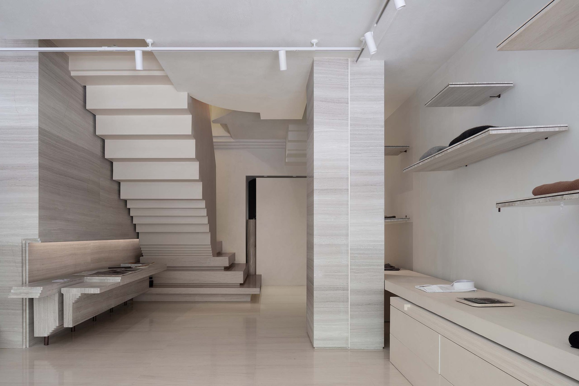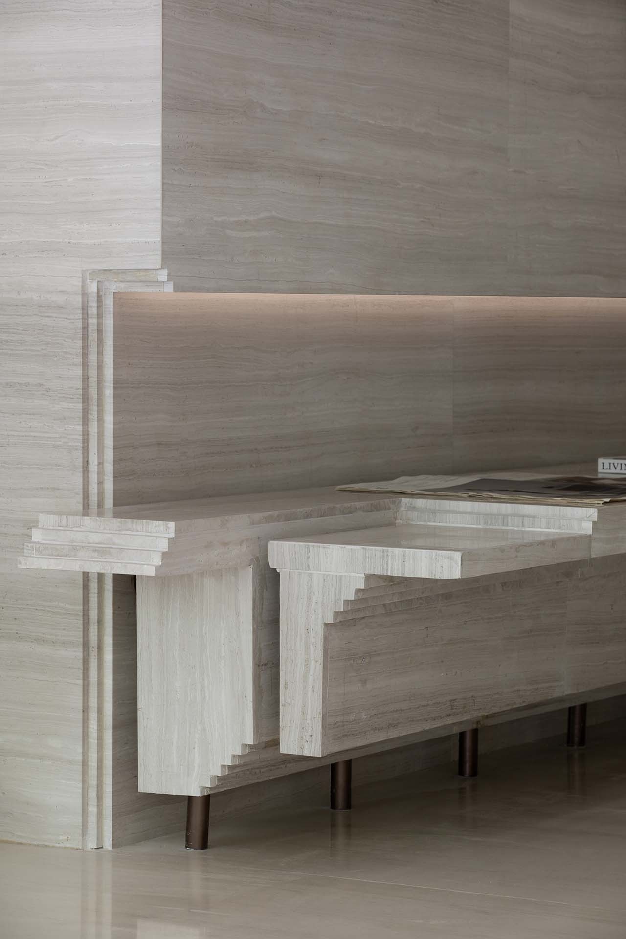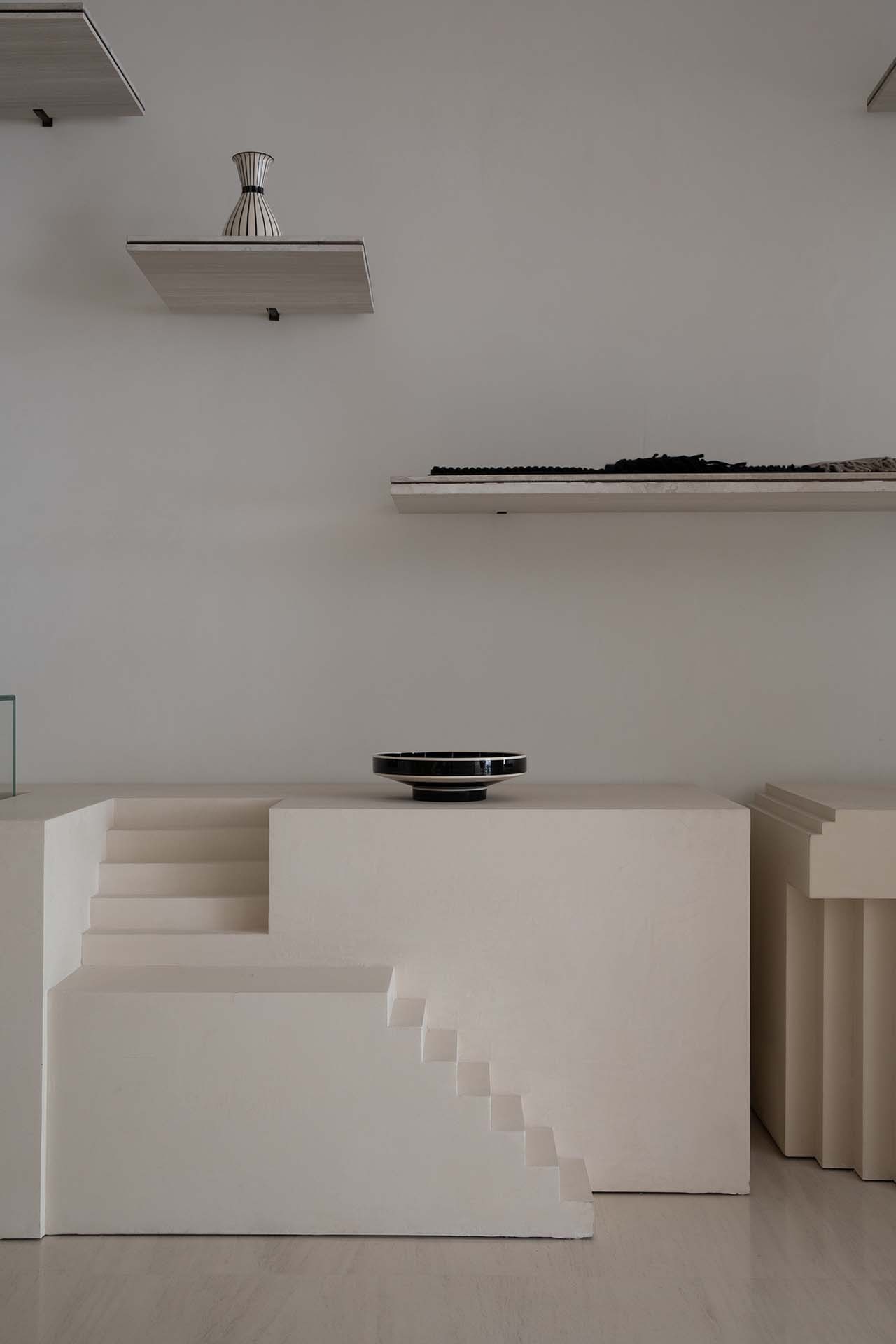 We transform the landscape vocabulary into the cross-sectional layout of the indoor building, not only deliberately highlighting the outline of the stairs, but also compressing or extending the cutting ratio of the stairs into commodity display cases and furniture cabinets, turning the dimension into a porch, the recessed facades of the wall and even the rhythmic level of the ceiling’s stair surface. The stairs and platforms that are placed or scaled down to reproduce the city’s ups and downs without the tedious details, and the sunny corners of the stairs help the interior create sculpture-like stereoscopic details. They connect like a kind of viewing rhythm, dislocation and extension, which makes people follow the turning of the stairs and unconsciously twist their perception of gravity, just like stepping into a psychedelic painting of MC Escher. Even if you look at the abruptly stopped ladder break-point, you also want to get a glimpse of the facade from another perspective.