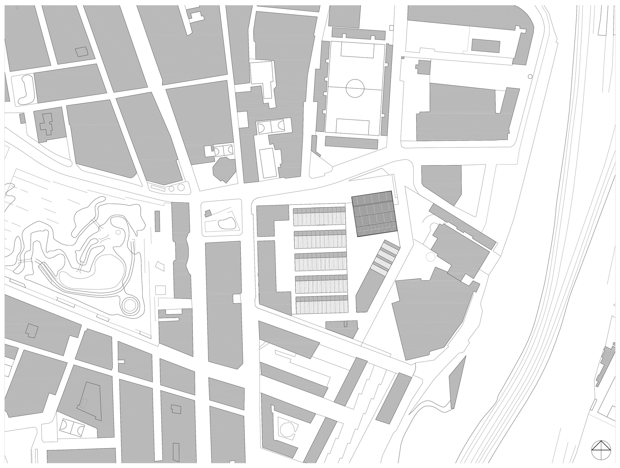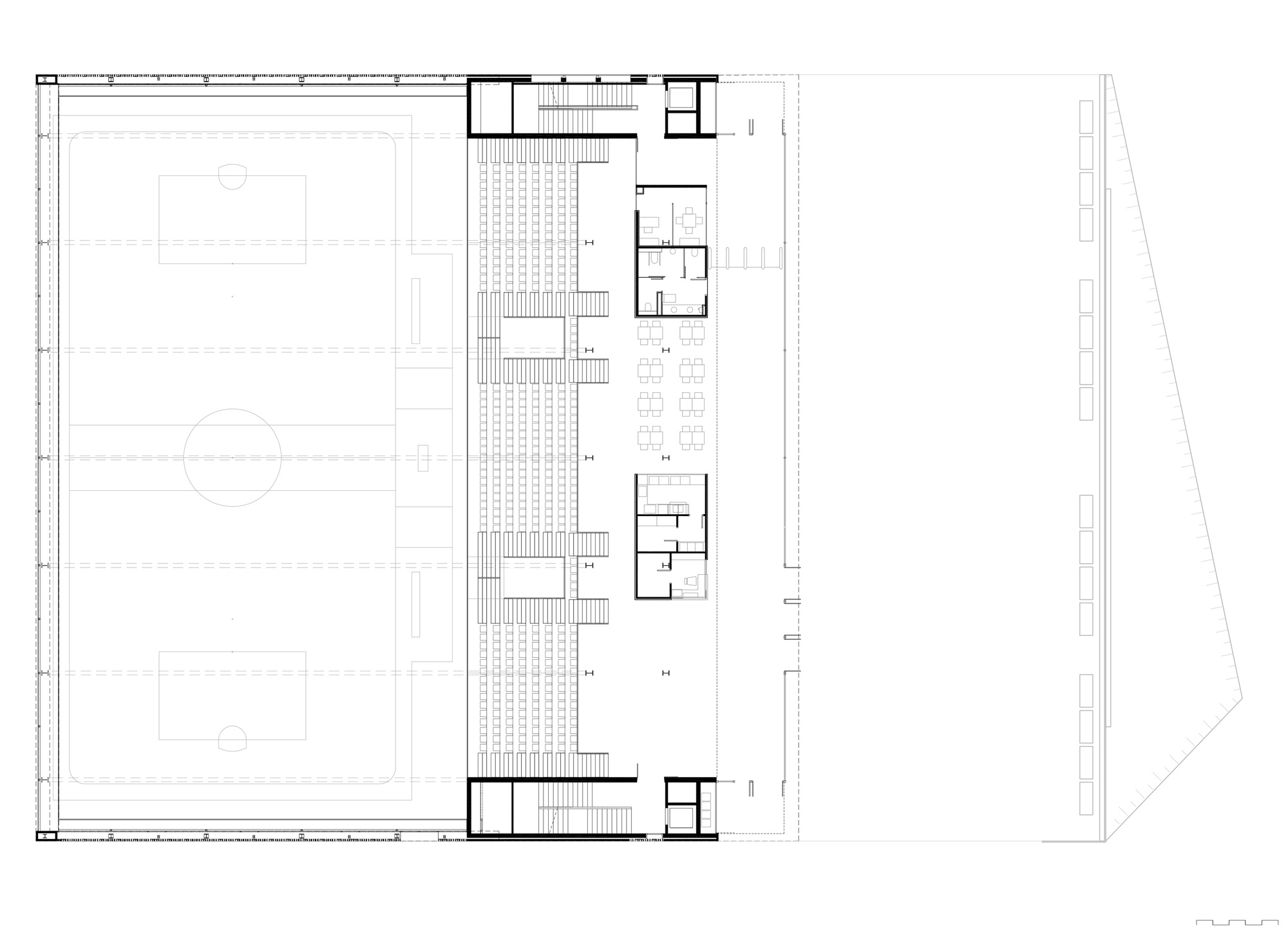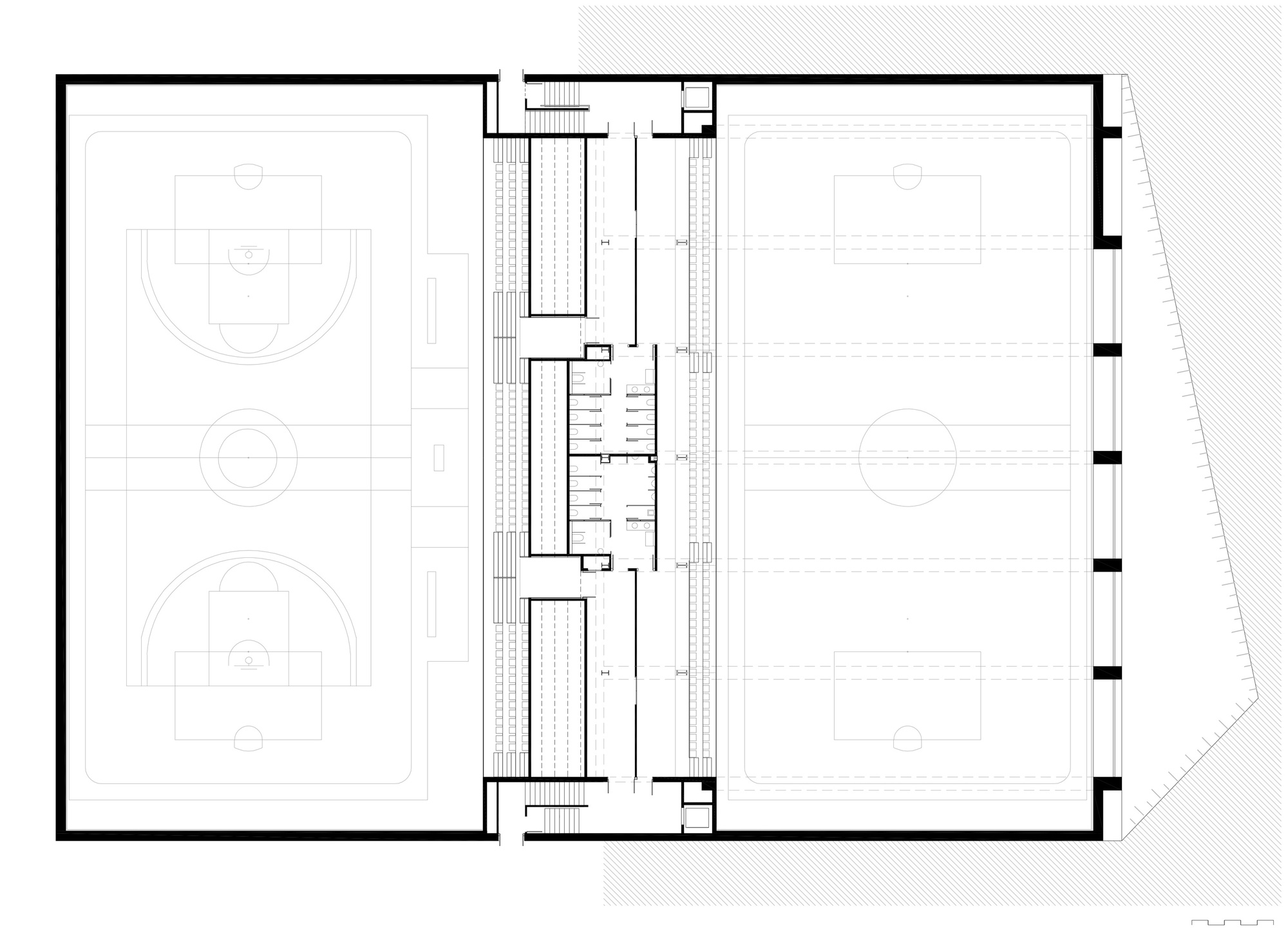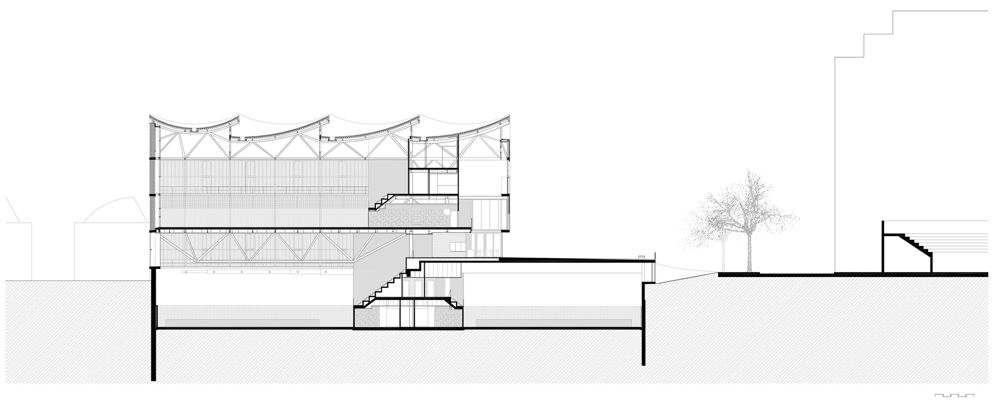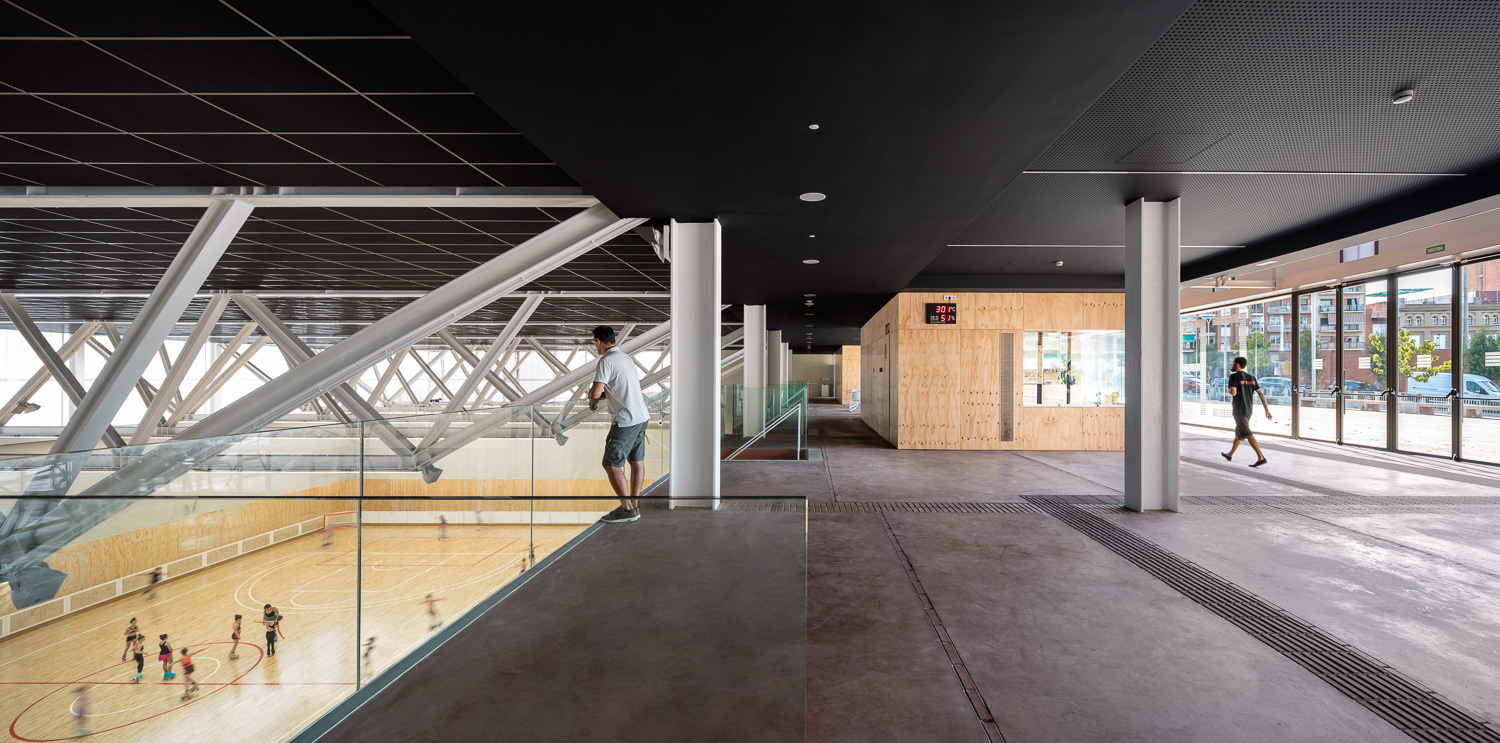 Given the large volume that the extensive Camp del Ferro functional program requires, in relation to the reduced size of the site and the density of the neighbourhood, the team of architects, after weighing the advantages and disadvantages, chose to locate an important part of the sports complex partially underground. An action that, through section mechanisms, ensured good lighting, natural ventilation as well as easy access and evacuation of the lower areas. A design decision that, in addition, has brought notable benefits to both the building, the neighbourhood and the city, since, apart from reducing the visual impact, has generated a public space that acts as an urban foyer of the complex and facilitates the circulation of users. A free area that is essential and comfortably solves the access and the complicated urban fabric of the enclave.