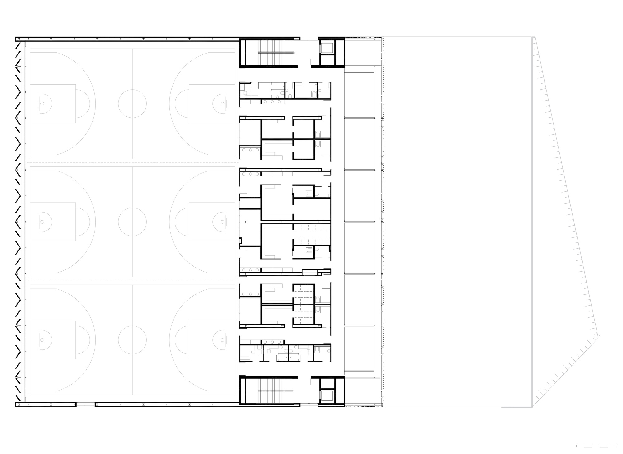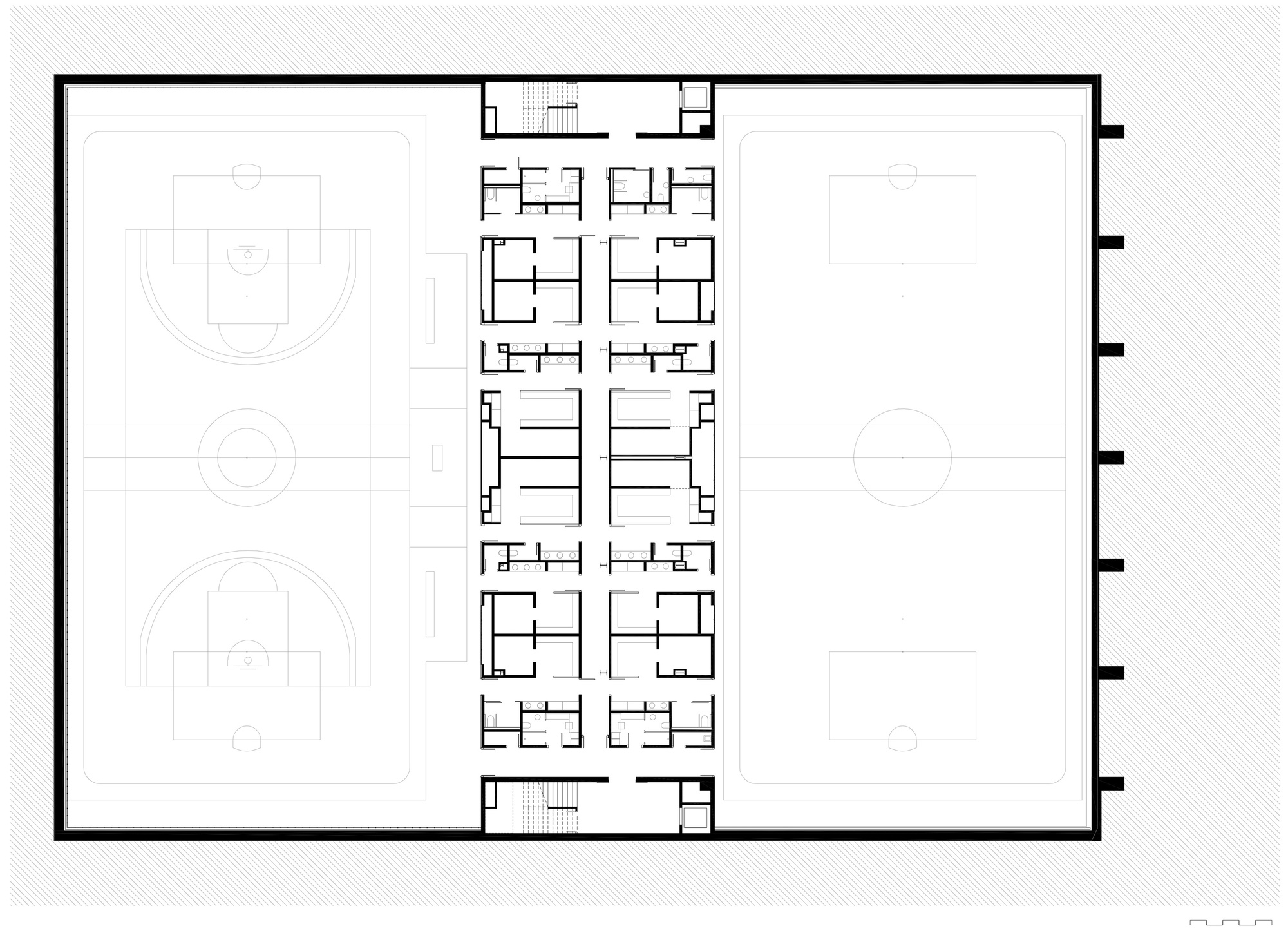 스포츠센터의 붉은색 벽돌 외장재와 패턴은 주변 도시환경과 유사한 형태입니다. 오래된 공장, 창고, 작업장 및 산업화 건물들과 같은 외형적 특징을 새롭게 재구성한 디자인 언어로 표현합니다. 여기에 내부환경과 채광을 고려한 오프닝 계획이 디자인되어, 독특한 패턴을 생성합니다.