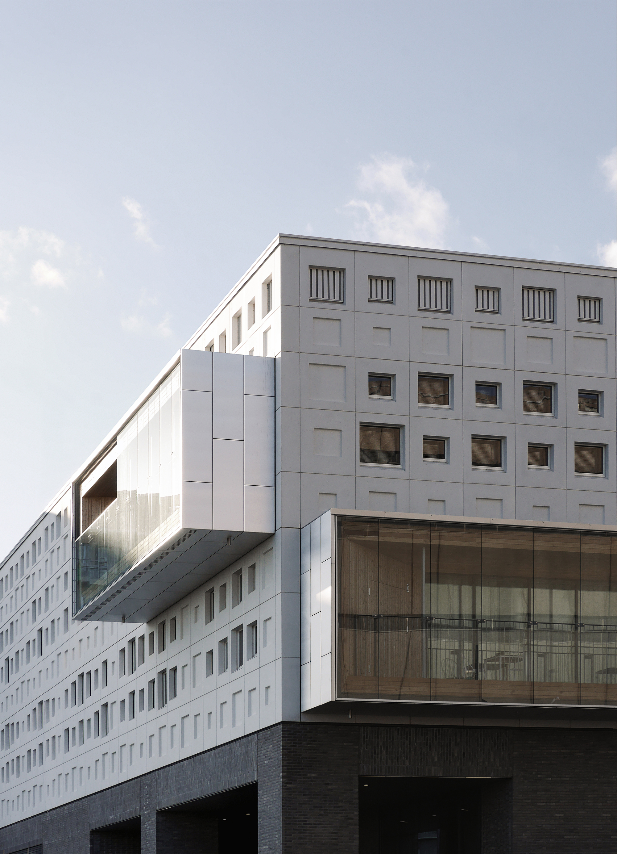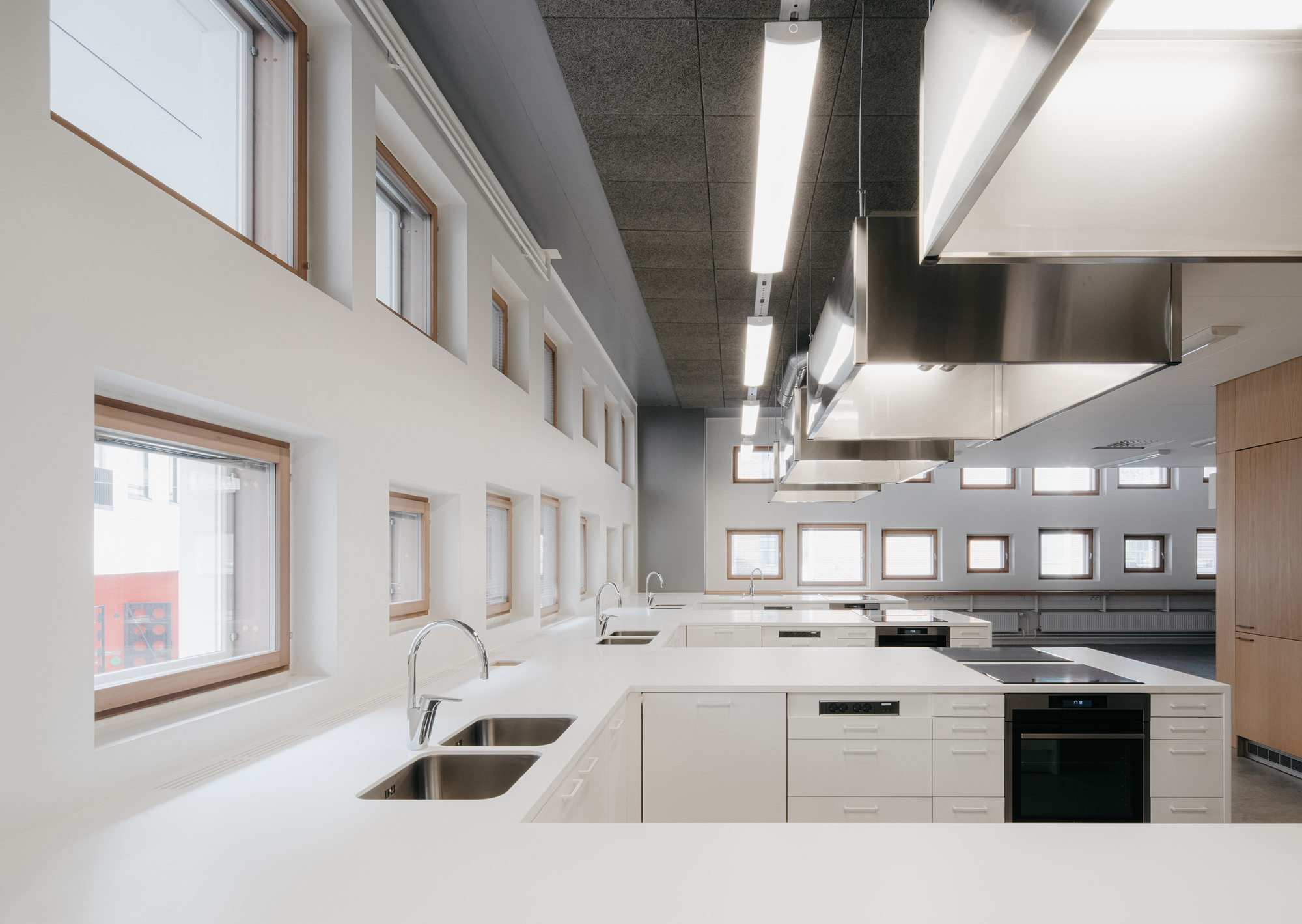 The school is situated at the edge of the new development, facing the busy ferry terminal, with an open view to the Baltic Sea. lt is visible from far away, welcoming travelers to Helsinki. The school stands out in the cityscape and at the same time adapts to the surrounding urban structure by carefully thought-out placement, creating clear street spaces and a sheltered school yard. The spatial organization of the school emphasizes exploratory learning and doing things together.