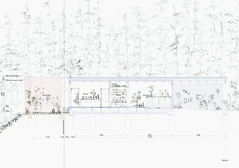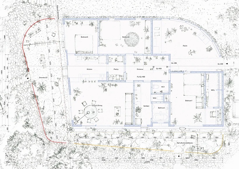 the largest volume belongs to the main house. here, the floor plan is divided between a generous entrance, a kitchen, a large living and dining space, three bedrooms, a bathroom, and a pantry. to the south of the main house is the agricultural warehouse, which is populated by lush plant life. to the north of the main house is the greenhouse, where the owner grows and tends to their tropical plants. connected by large openings from bedroom 3 and the living and dining space, inhabitants sit here and enjoy the sense of being outside while being sheltered under the greenhouse roof.