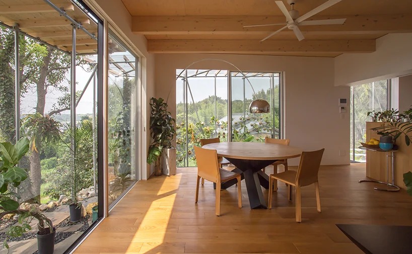 amid the lush green countryside of aichi prefecture in japan is a dwelling realized by 1-1 architects for the owner of a tropical plant farm. composed of three volumes under three roofs, the layout of ‘house OS’ has been designed according to a boundary line of neighboring land that the single-story residence straddles.