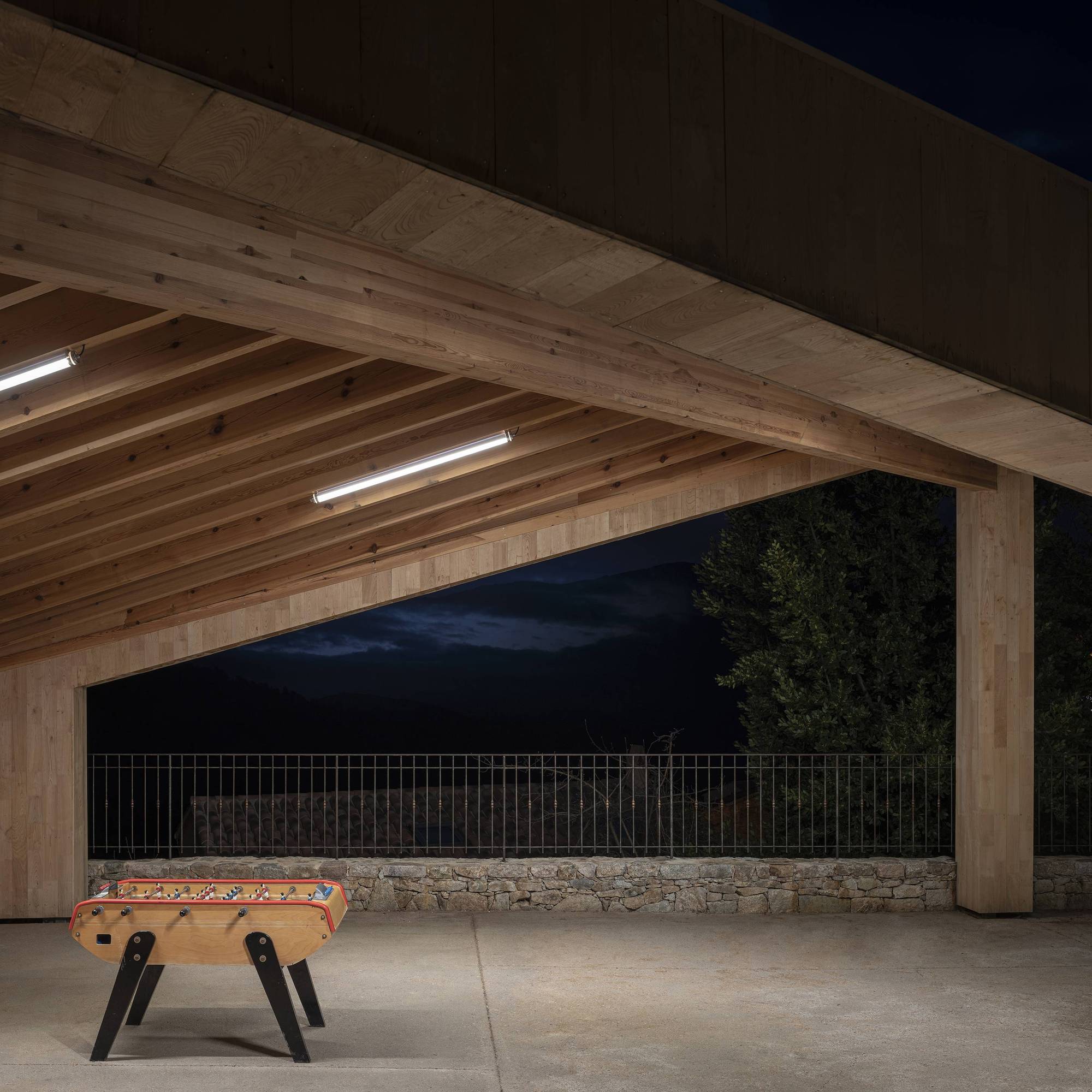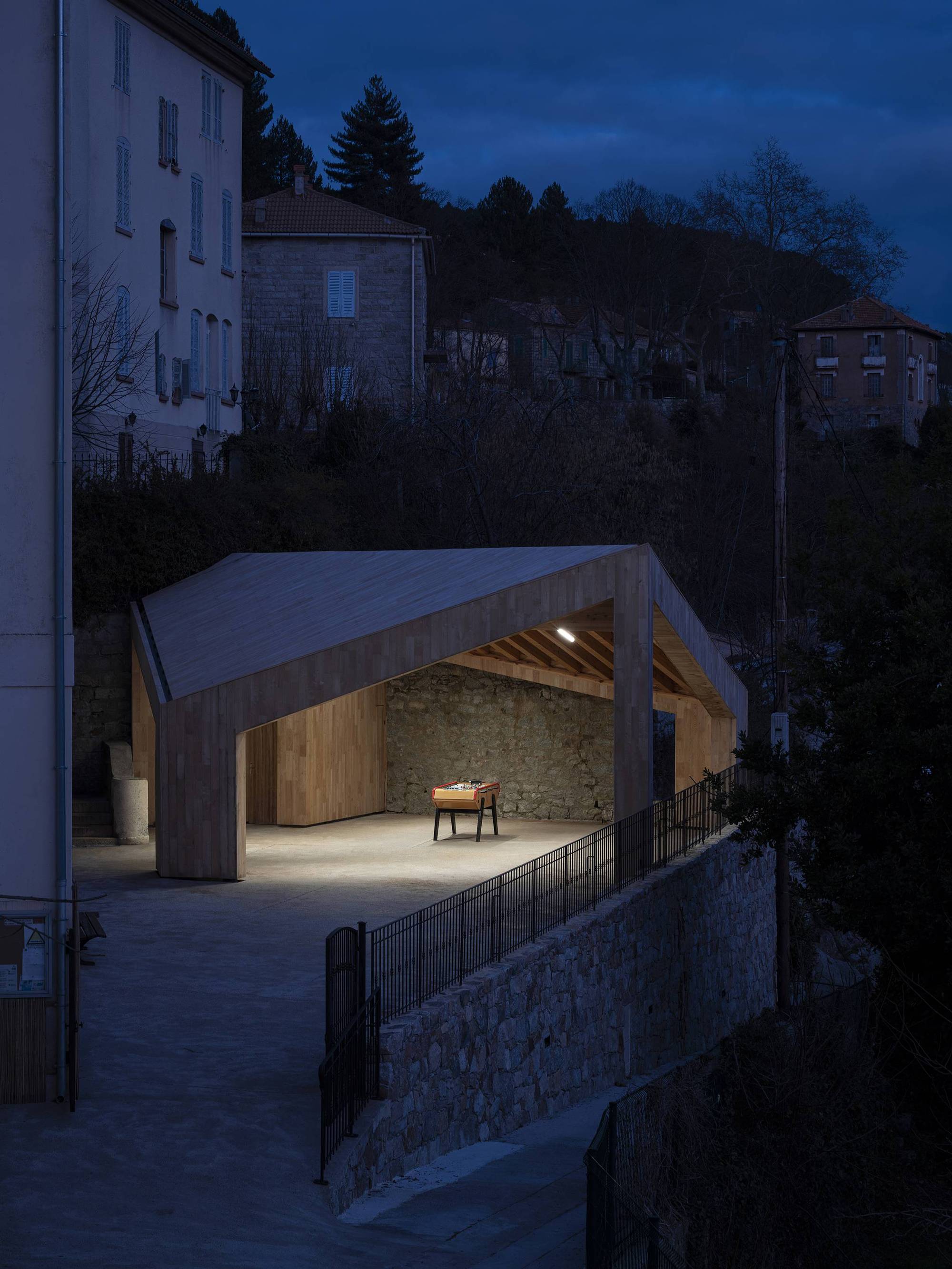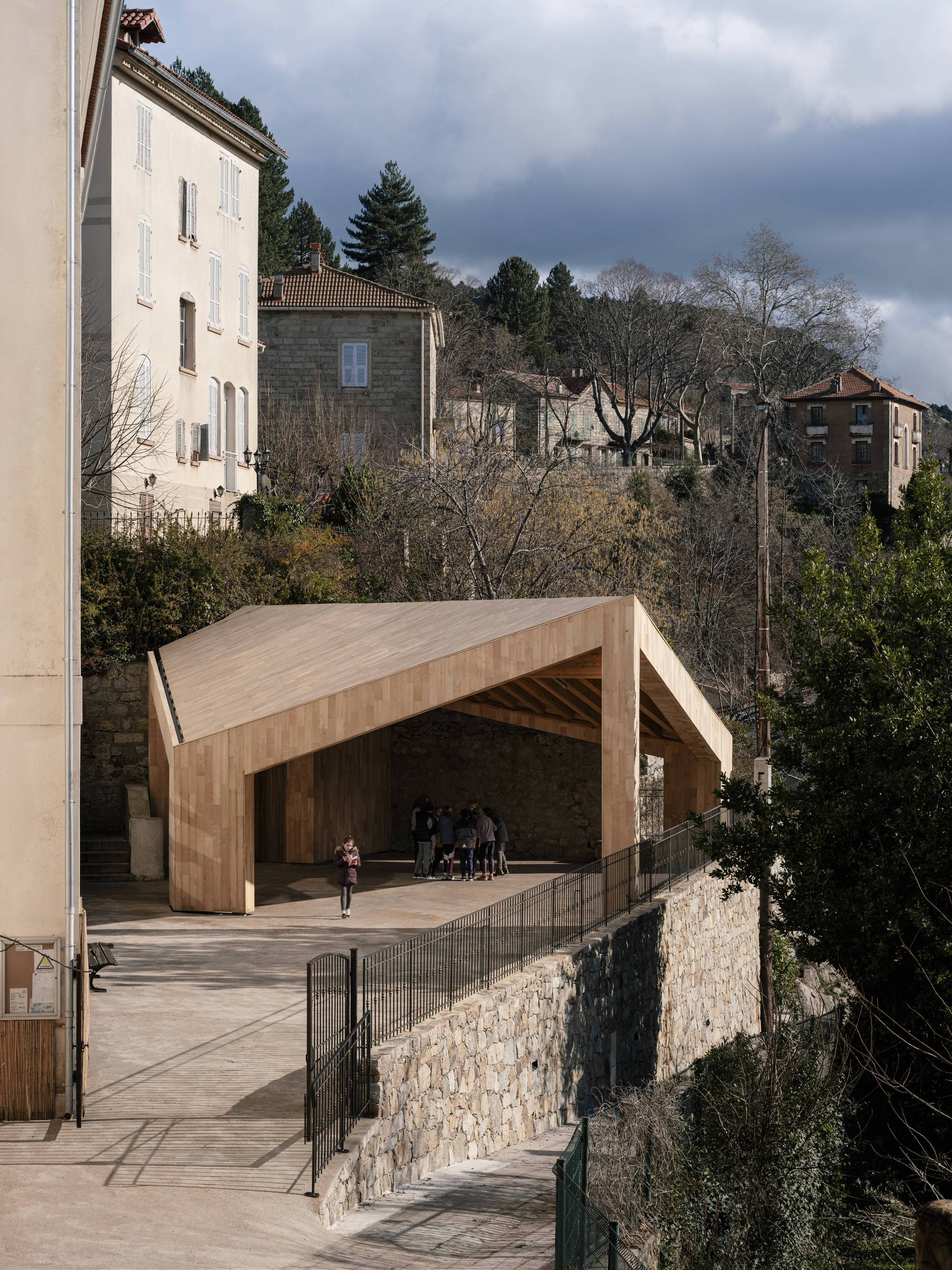 Evisa is a village made out of stone. It’s composed of solid, monolithic buildings bearing simple volumes, surrounded by chestnut and Laricio pine woods (endemic). The porch sits at the back of the yard and is an analogy to a secular oversized chestnut tree, bearing imposing foliage. The project has a cross-generational reach. It has to be a shelter, first, but also a place where memories are made and stories told, thus continuing the great Corsican tradition of oral transmission of knowledge. The porch must also be an educational tool to promote environmental awareness, as well as local history and know-how. Inserted in a monolithic and mineral architecture, the porch is a homogeneous mass, crafted with the on-site needs and constraints.