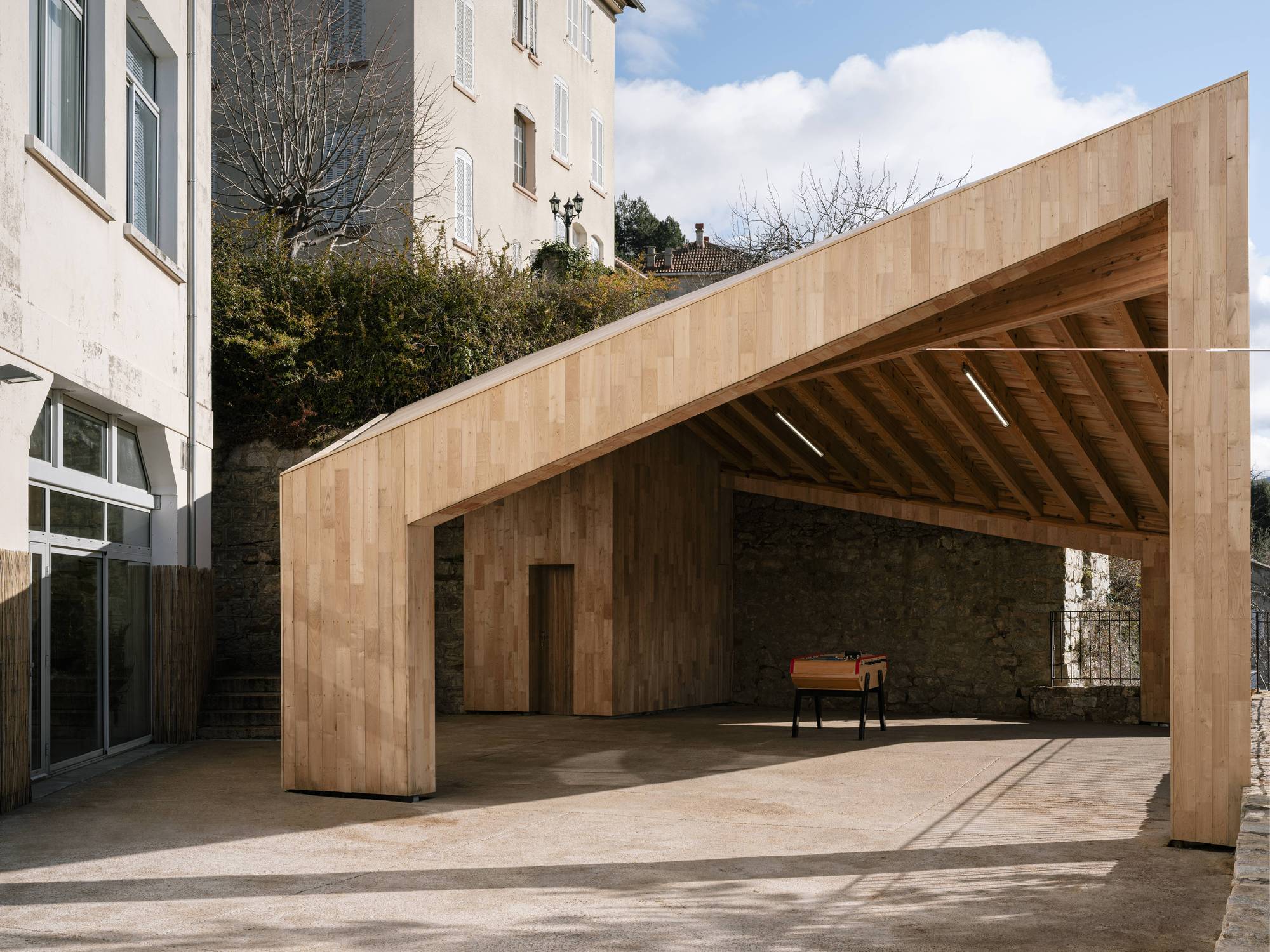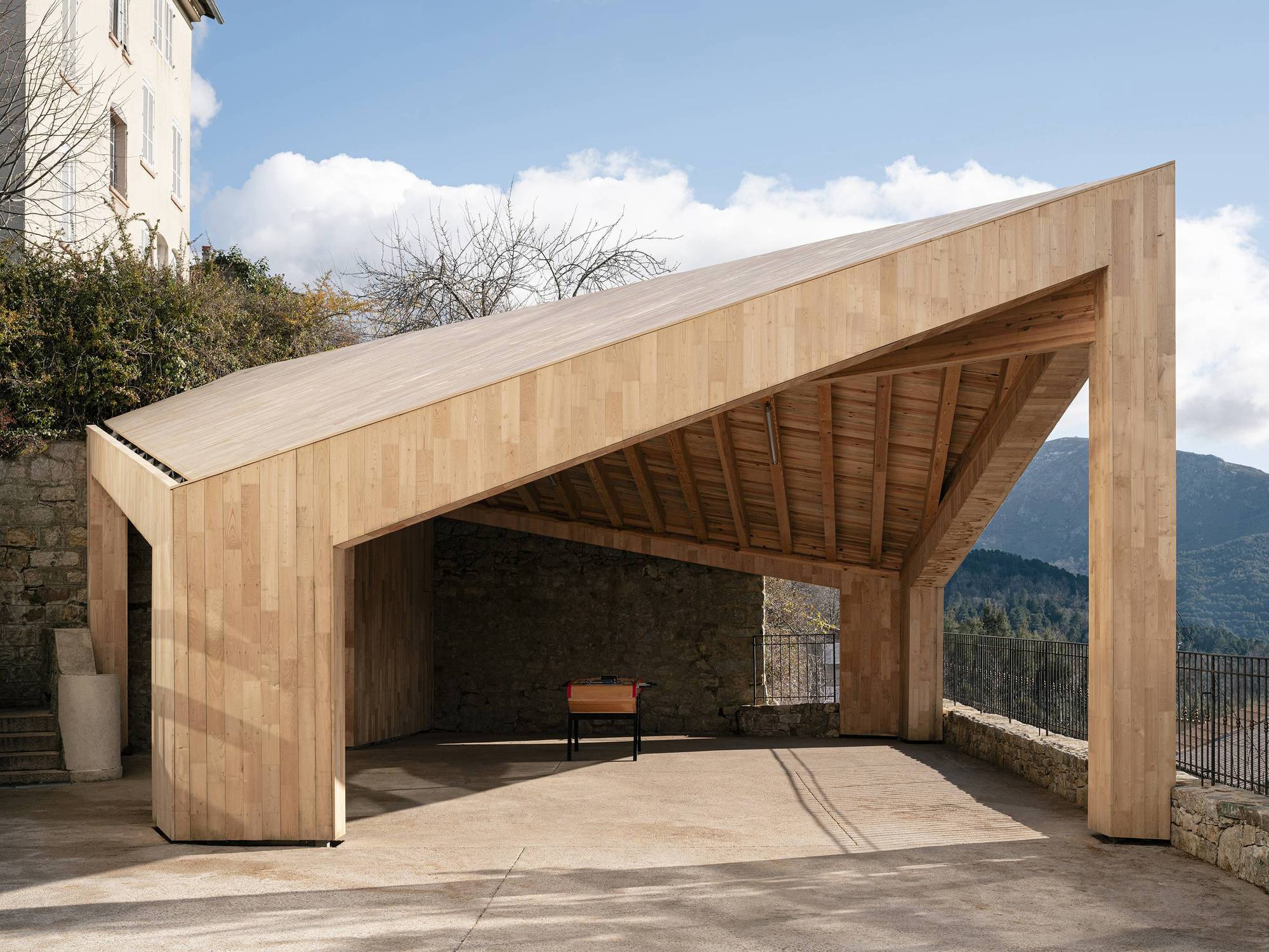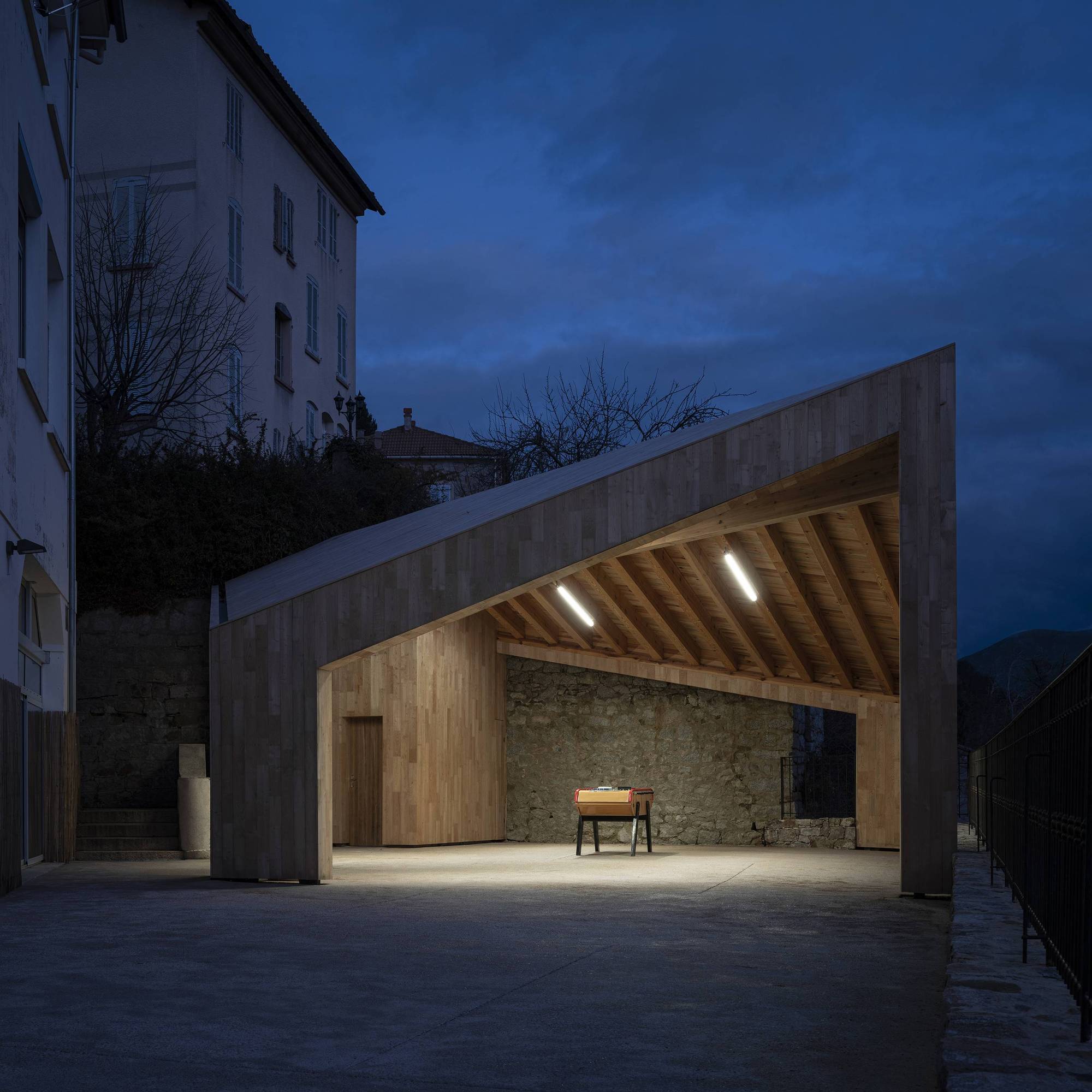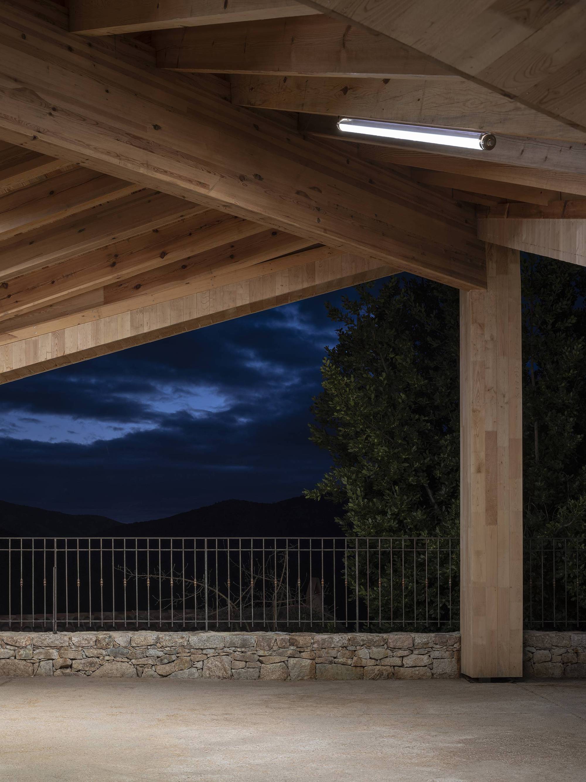Evisa is a village made out of stone. It’s composed of solid, monolithic buildings bearing simple volumes, surrounded by chestnut and Laricio pine woods (endemic). The porch sits at the back of the yard and is an analogy to a secular oversized chestnut tree, bearing imposing foliage. The project has a cross-generational reach. It has to be a shelter, first, but also a place where memories are made and stories told, thus continuing the great Corsican tradition of oral transmission of knowledge. The porch must also be an educational tool to promote environmental awareness, as well as local history and know-how. Inserted in a monolithic and mineral architecture, the porch is a homogeneous mass, crafted with the on-site needs and constraints.