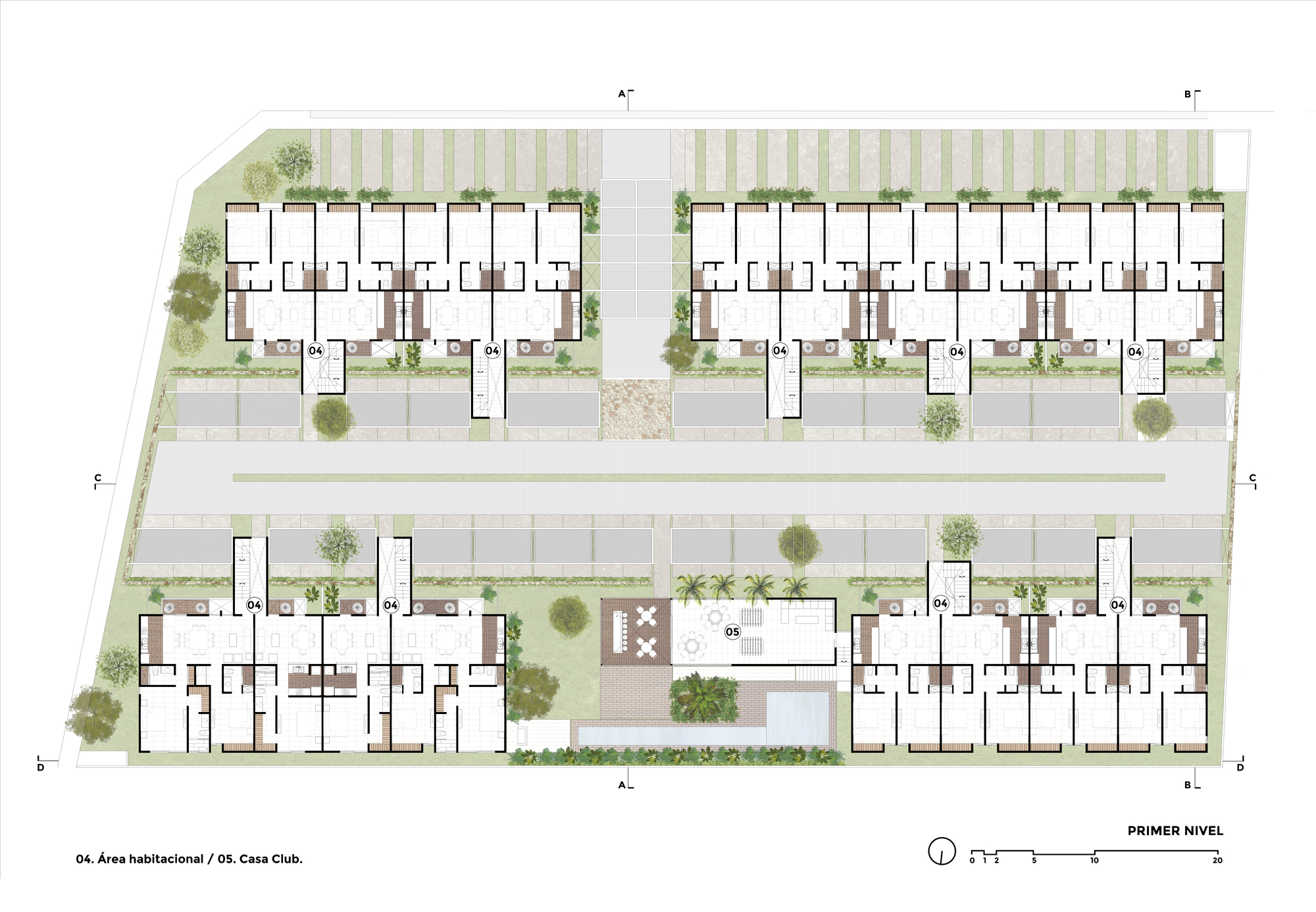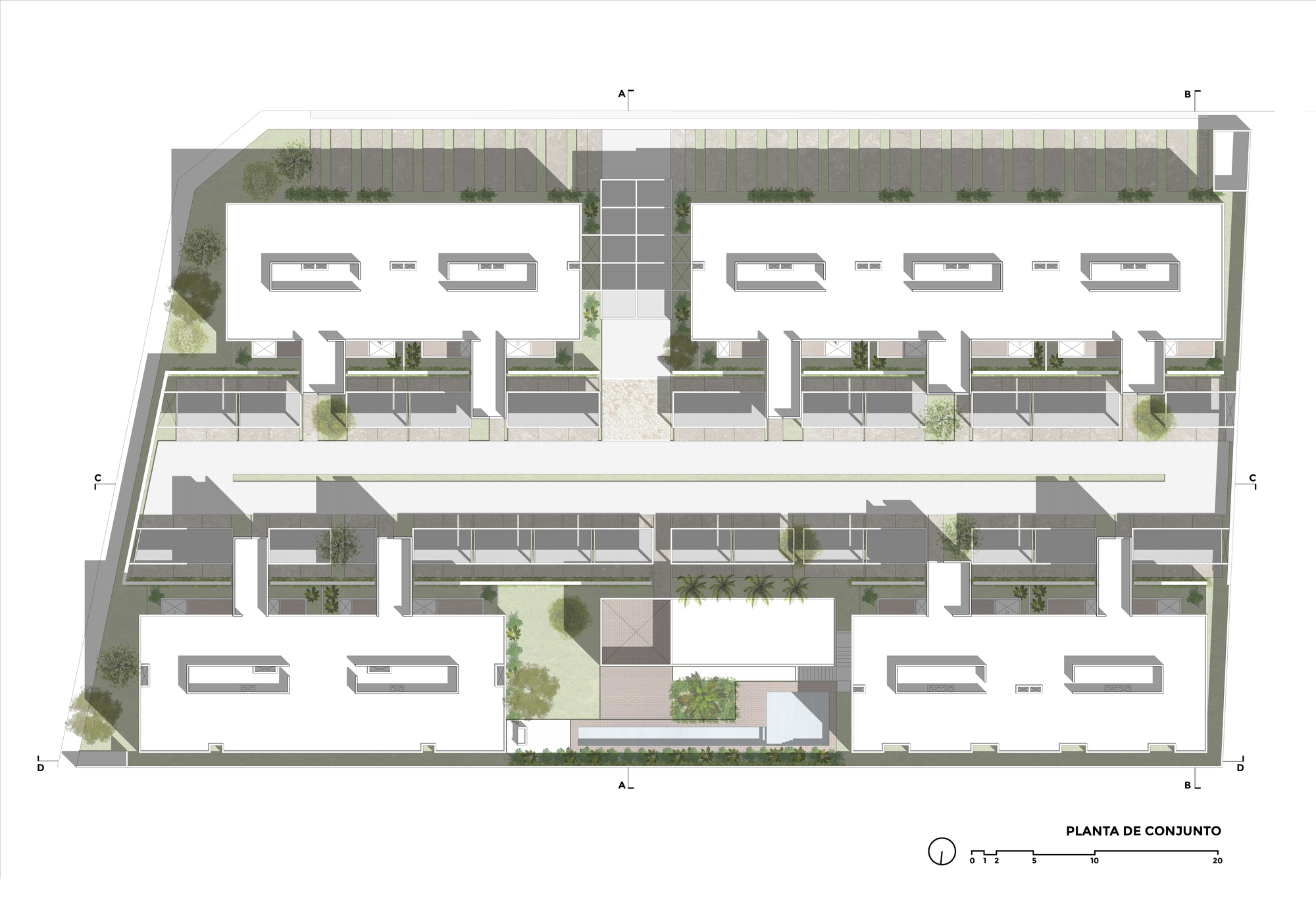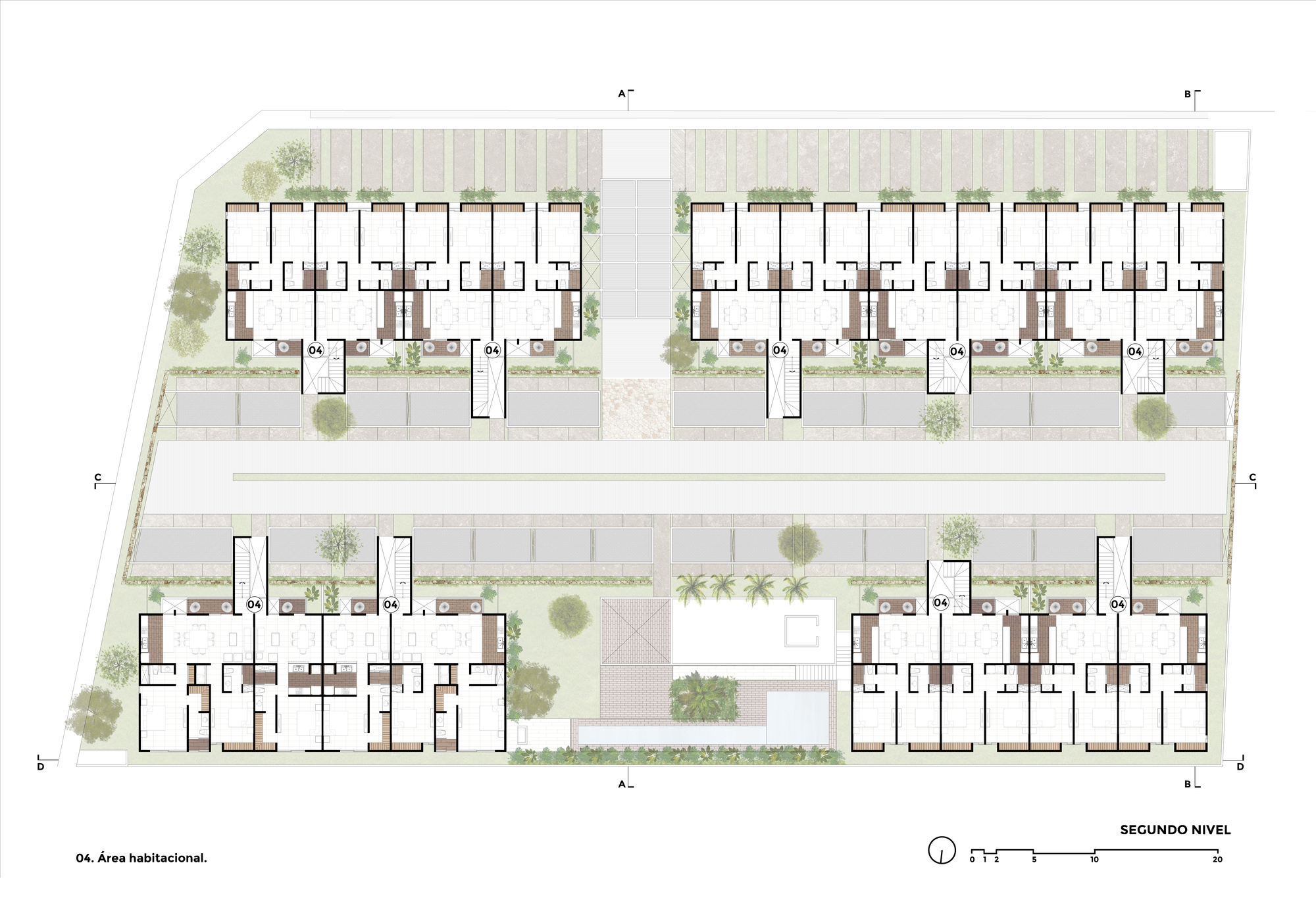 The idea was born from the fragmentation of a large volume into smaller pieces, resulting in four different elements in which the housing program is developed. The access, the central circulation and the social area of the complex are generated in the "cracks" created between these volumes. In this way, two compositional axes emerge, the transversal one that frames the access, which leads to the central space and ends with the social area. The longitudinal is delimited by a wall built with local stone, running through the central space in its entirety, allowing a visual connection with the exterior facades as a linking element.