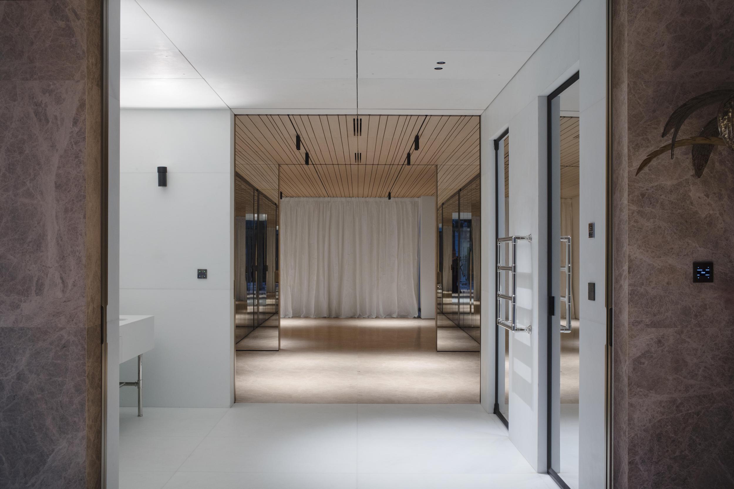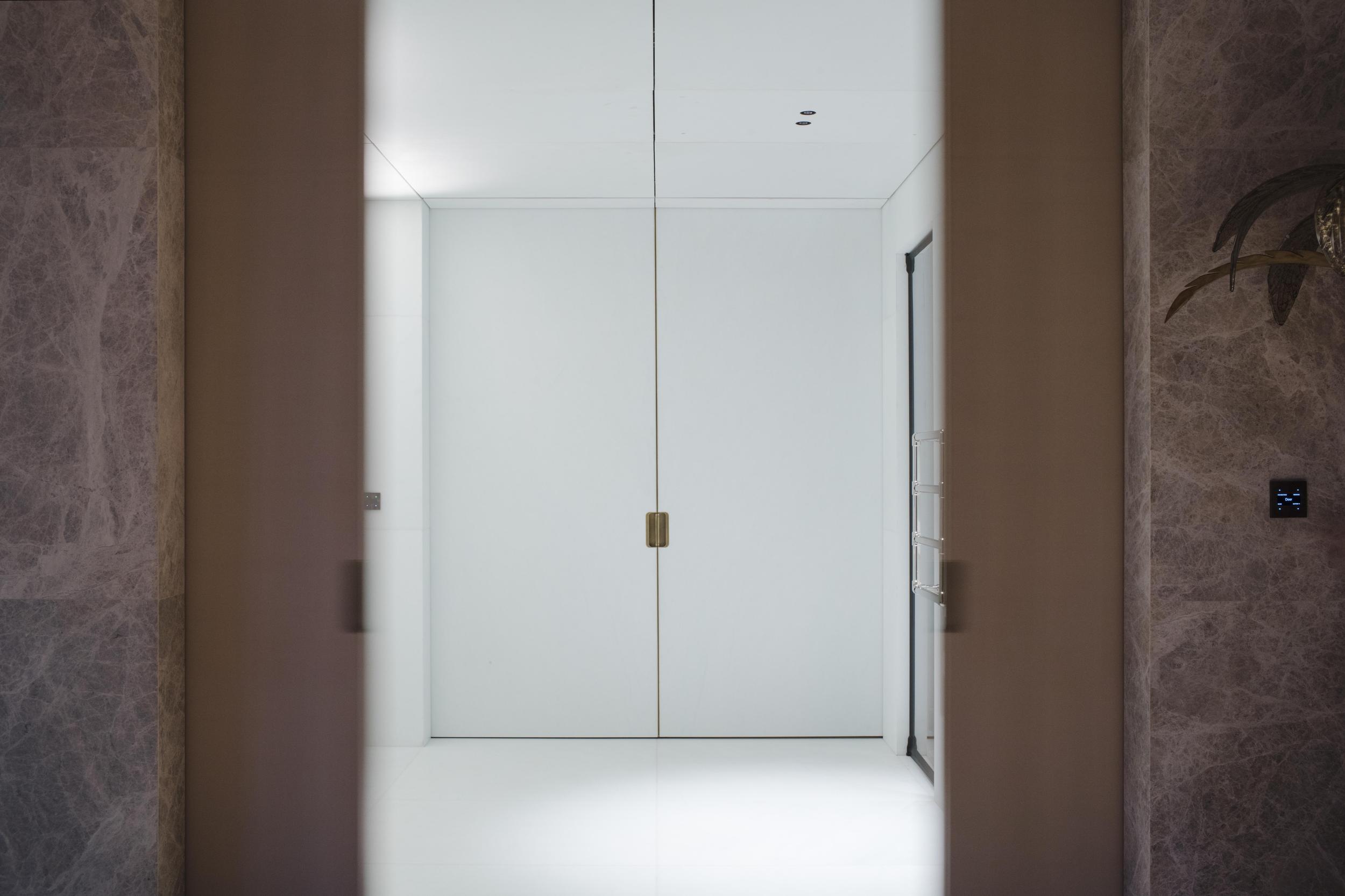 The wooden ceiling, custom developed for this project, not only hides the utility lines, but also provides sound/acoustic insulation. The kitchen island in patinated bronze and ceramic stone, seamlessly blends into the environment in a similar fashion. The monumental wall in Guatemala Verde marble, contrasting sharply with the rather low-key environment, dominates the dining room. The jade-green box of Pentelico marble covering all four planar surfaces of the master bathroom. When all sliding doors are open, a kaleidoscopic perspective en enfilade unfolds, revealing four rooms with similar proportions but with diverging functionalities and finishes. The guest bathroom is entirely executed in Arabescato. The whimsical patterns of this impressive marble not only cover the floor and walls but continue into the face of the cabinets.