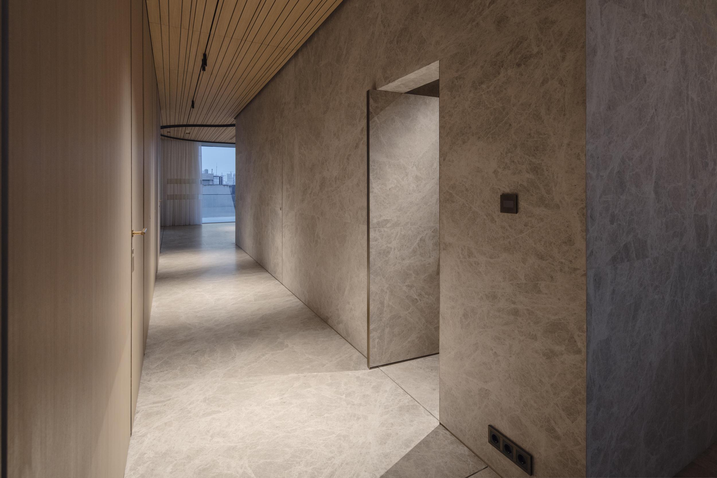 pn is a minimalist home located in Beirut, Lebanon, designed by studiokhachatryan. A zen and precious penthouse apartment with 360° panoramic views in a modern building in the heart of Beirut, the lively Gemmayzeh neighborhood. The floor plan unfolds as a platform around a rectangular central block of the entrance. Circulation revolves around the edges of the central block, not merely conceived as a boundary to the outside world, but also regulates the organization of internal activities. The apartment can roughly be divided into two sections: a strictly private area for the owners and the ‘formal’ area where guests are received. Vast surface and nature of the floor plan determined the choice of noble, but sober materials such as Patara marble and Elm wood.