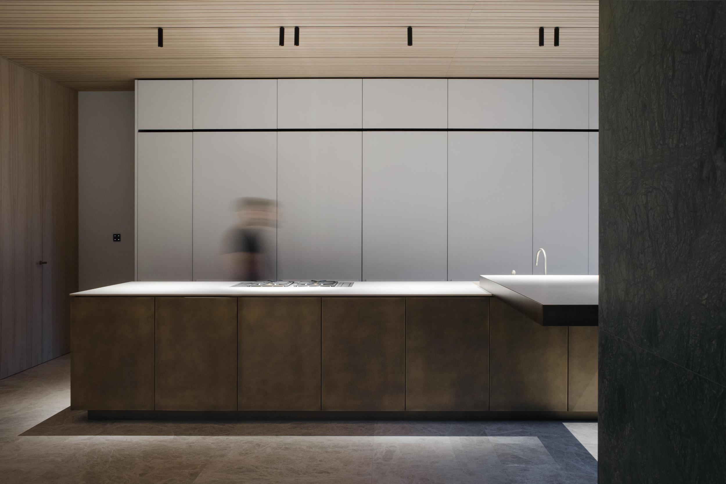 미니멀리스트 홈 pn은 극도로 절제된 공간감을 전달합니다. 주거 내부에 위치한 거대한 그린박스를 기점으로 공용공간과 사적공간은 구분됩니다. 구분된 공간의 한부분; 공용공간에 자리한 주방은 빌트인 시스템으로 간결하게 디자인되어 있으며, 아일랜드 테이블이 배치됩니다. 아일랜드 앞에는 식탁이 자리합니다.