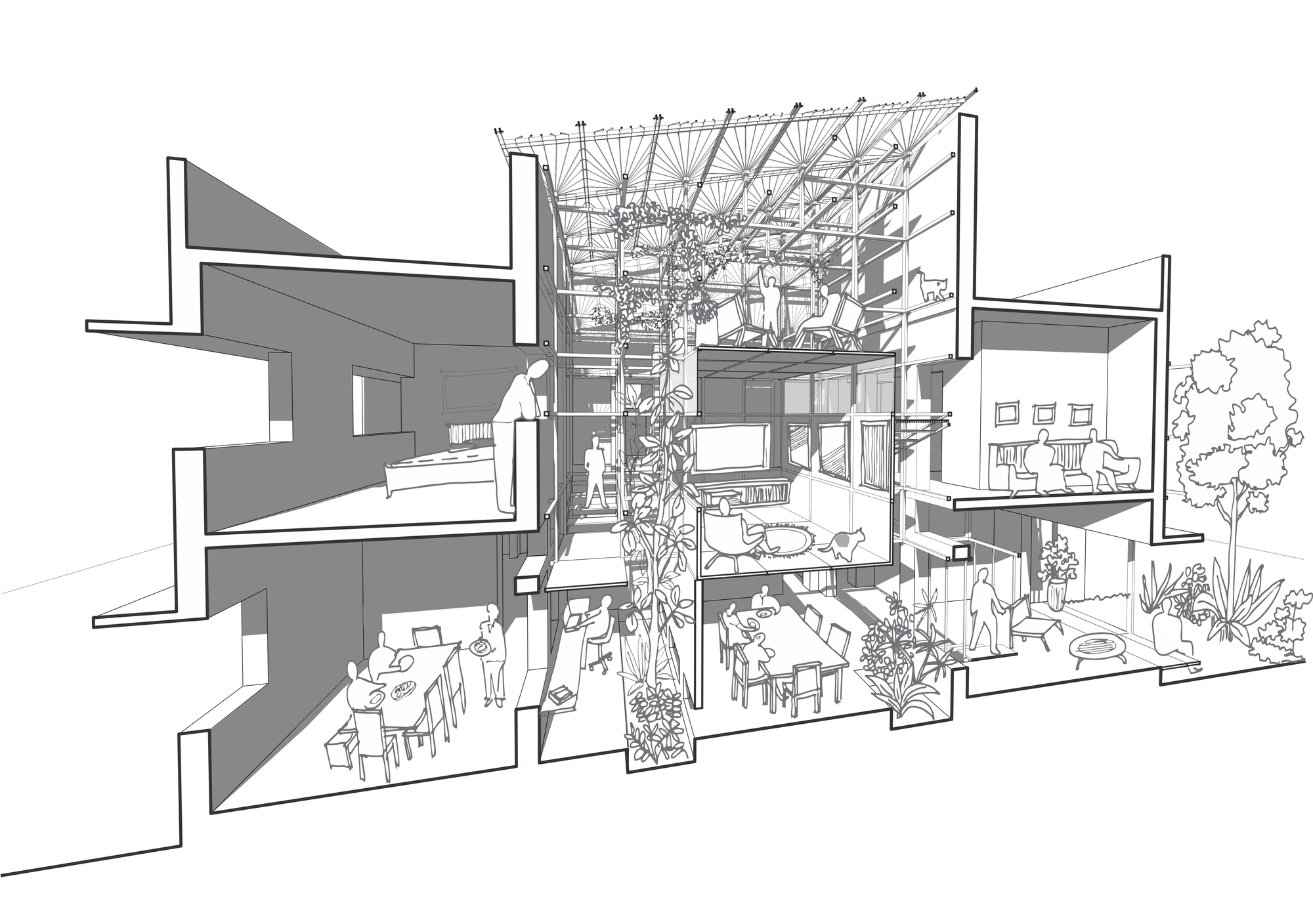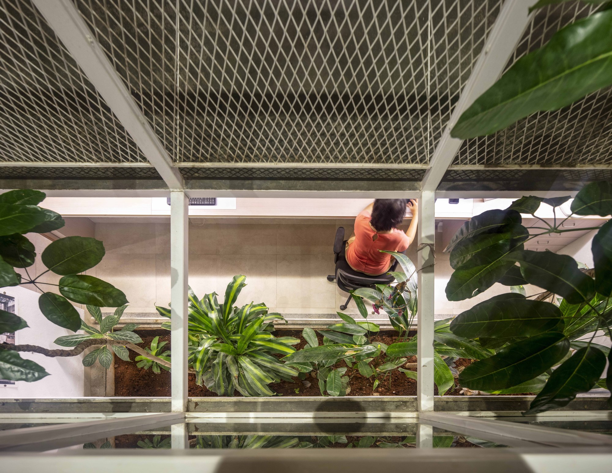 사무공간과 거주공간은 웹(거미줄)이 생성하는 픽셀을 단위로 조닝되며, 비워진 작은 픽셀사이에 채광과 환기 그리고 소통을 위한 보이드 공간이 자리합니다.