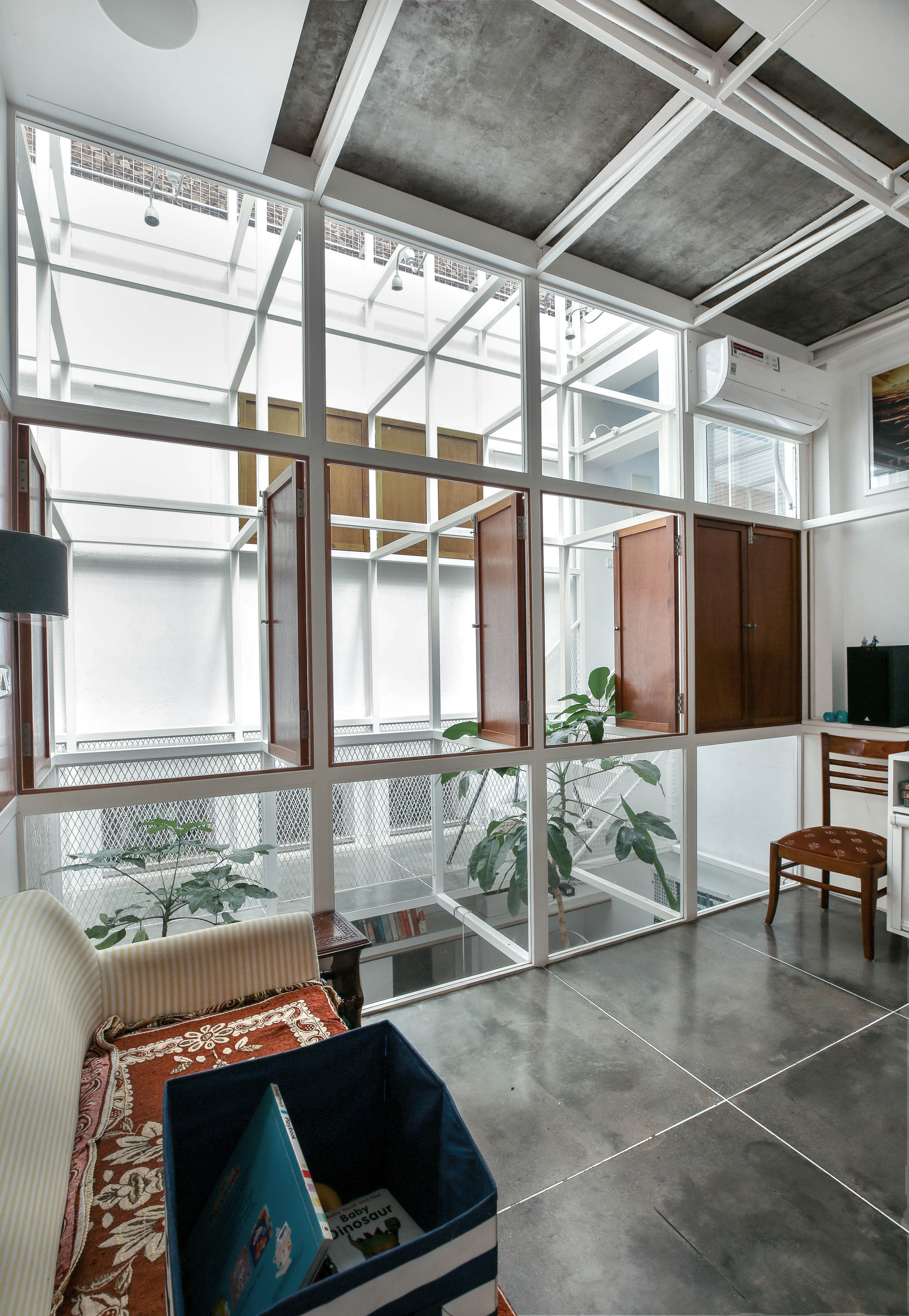 Structure, site and budget concerns needed a bold intervention which changed the project from a finicky renovation to one of a motivated architectural intervention in that of making a family house. A square of 20'x20' in the centre of the building was broken down carefully becomingthe central core for this intervention. This space became the volume catalyzing the restructuring process. Since periphery of the building had most of the existing functions, they were mainly retained with very limited intervention.