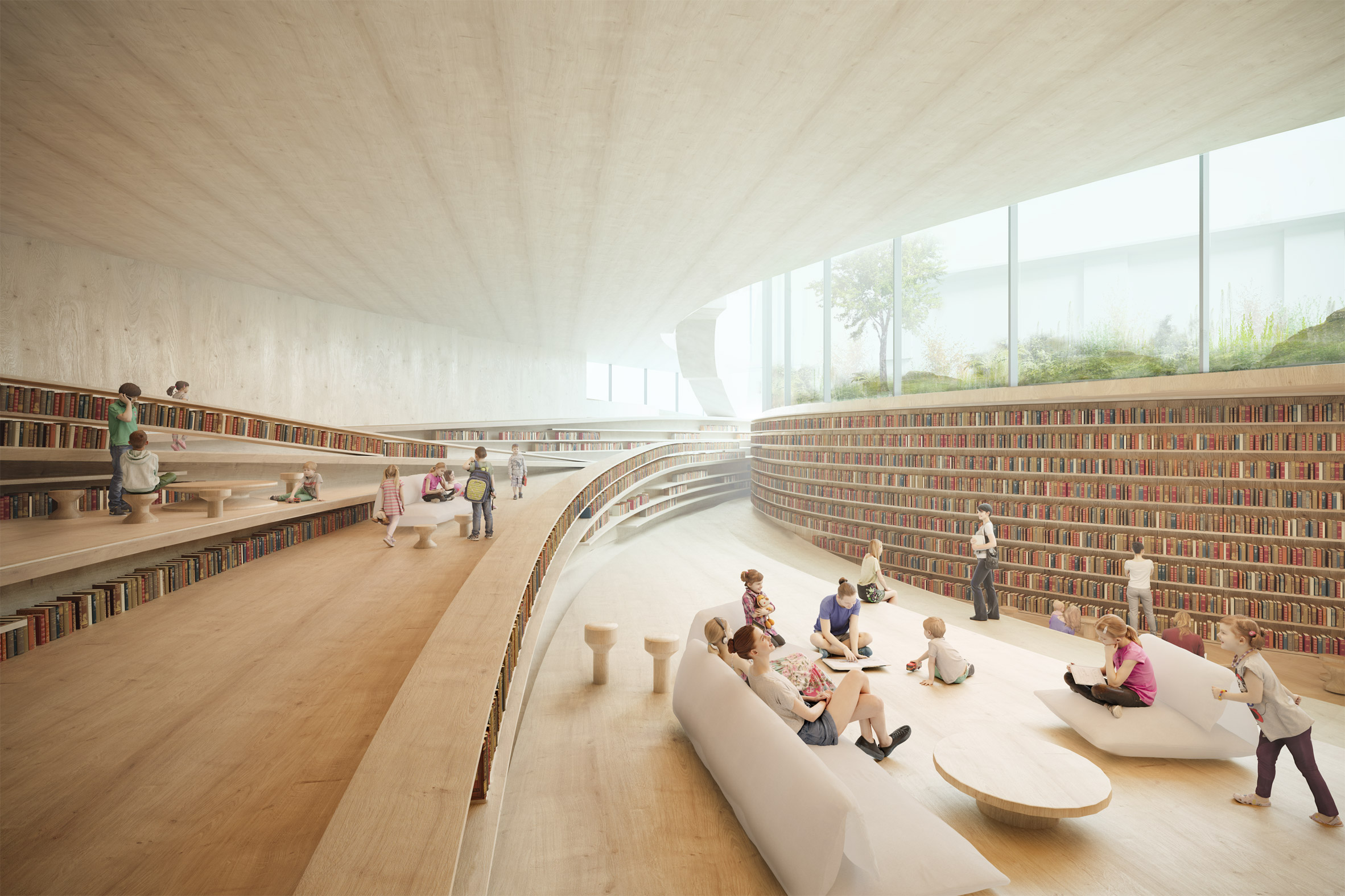 Kengo Kuma and Associates has collaborated with Mad Arkitekter on the design of a library that will curve around existing trees in a small urban park in Skien, Norway.