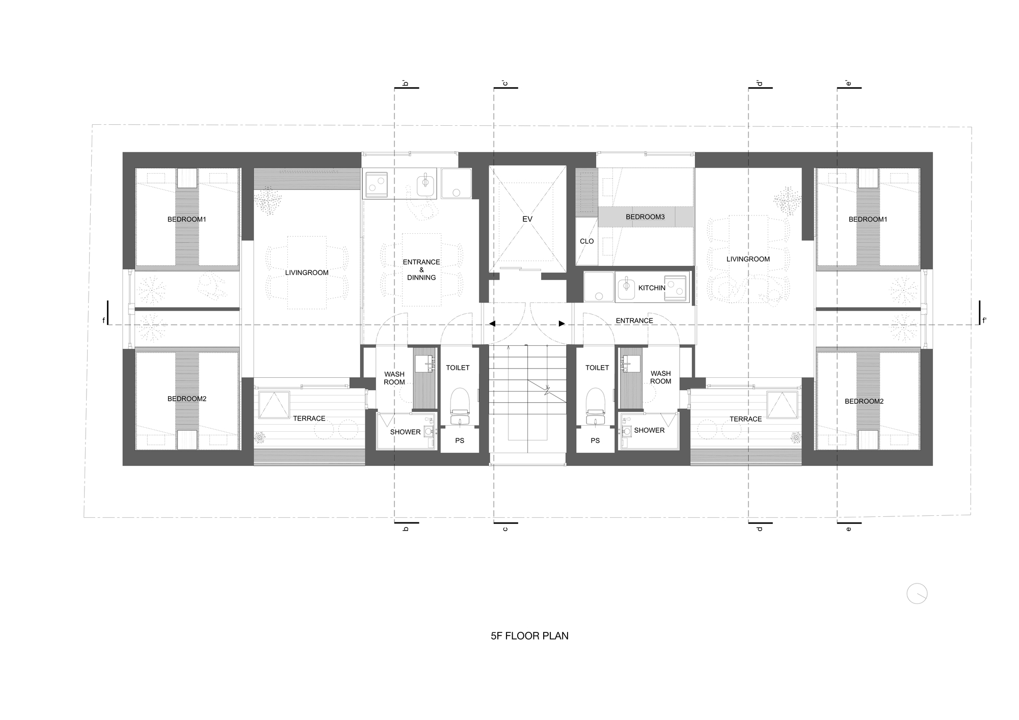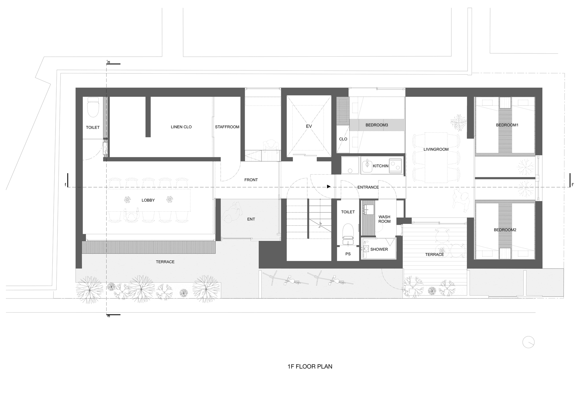 Reinterpreting a traditional style of housing in the present day - The general composition adopts the stairwell style, similar to public housing during Japan's period of rapid economic growth. Two accommodation rooms of approximately 40 m2 are allocated on each floor across the staircase. With the aim to be distinguished from Tokyo's offer, where the majority of the rooms are single, twin or double beds, we propose nine rooms able to accommodate a large number of family members or friends. Each room is equipped with a kitchen and a washing machine, which can be used by up to six people. This way, a possible conversion into apartments can be considered in the future.