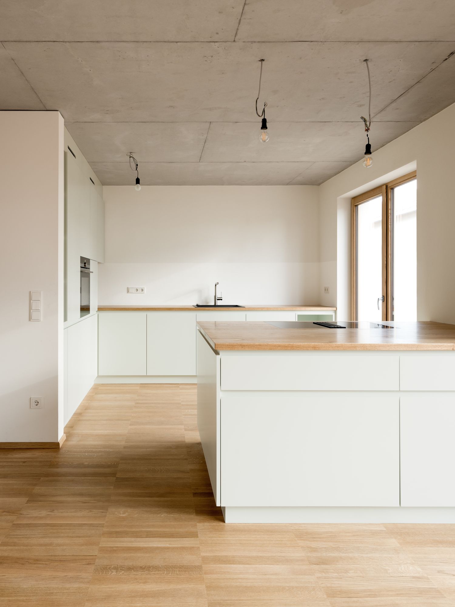 On the ground floor the internal corridor opens up to the living room to the west and the kitchen and dining to the east, creating an inner enfilade. On the first floor the symmetrical shape turns into a cross-shaped division that accommodates two children rooms, a big bathroom and workspace. On the roof floor the distribution space turns into an open circulation of the parents realm: a bathroom, a small retreat and a bedroom located under the ridge and lightened by a big round window. The absence of thresholds in the floor of wooden boards provides an open circulation between the rooms. Also the ceiling of exposed concrete is continuous, whereby the individual rooms appear like white cubes set into a vast envelope.