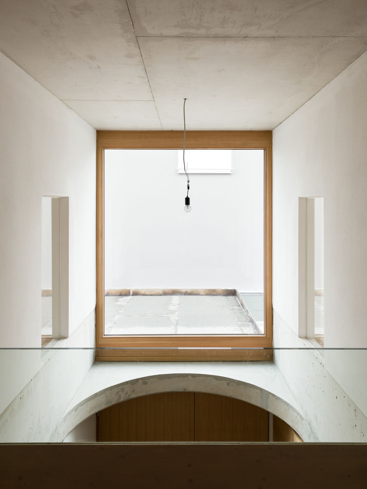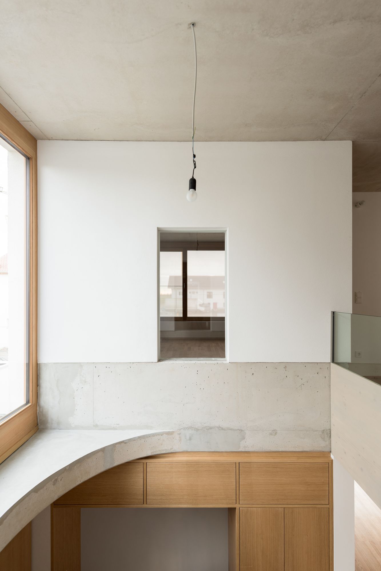 Semi-detached House is a minimal residence located in Munich, Germany, designed by FAM Architekten in collaboration with Studio Weitz. This semi-detached house with a round window and a gable roof lies in a new housing estate in the suburbs of Munich. Its rigorous symmetric structure allows an optimized utilization of the few space within the three-storey house. The entrance is located in the middle axis, followed by an air space which connects the upper floor with the ground floor. The staircase is situated in the same alignment. The massive body of exposed concrete, in which the stairs seem to be subtracted, acts as stiffening core.